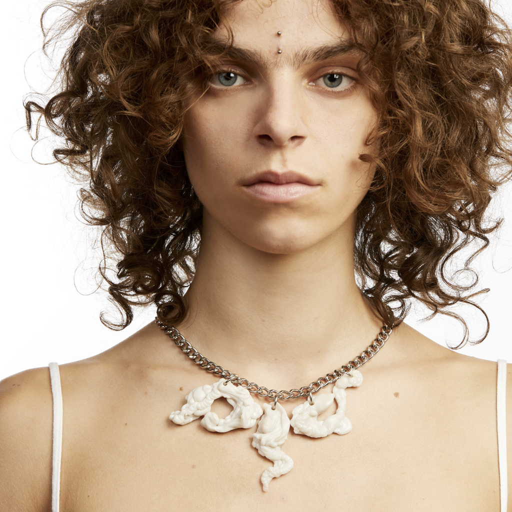 Vanessa Schindler is an eponymous fashion and accessories label based in Switzerland. A graduate of the Geneva University of Art and Design, Vanessa was awarded the Grand Prix d'Hyères in 2017 for her master's collection. In 2018 she turned to accessories and jewellery, leaving fashion to create her pieces by hand in her workshop. Her fourth jewellery collection 'Bioresin Hoops' stems from experiments with wax in water that create abstract, organic forms she likes to describe as sci-fi fossils.