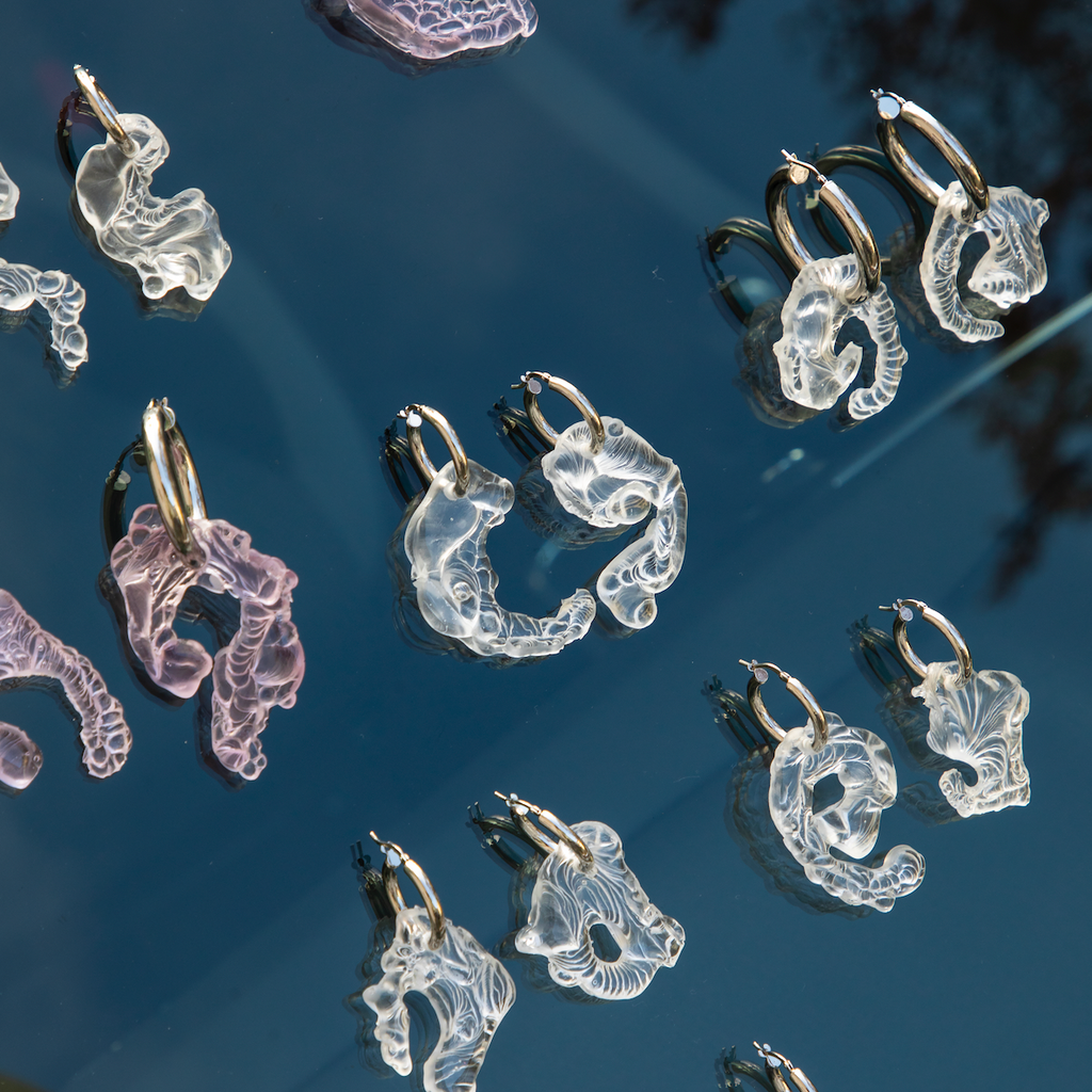 Vanessa Schindler is an eponymous fashion and accessories label based in Switzerland. A graduate of the Geneva University of Art and Design, Vanessa was awarded the Grand Prix d'Hyères in 2017 for her master's collection. In 2018 she turned to accessories and jewellery, leaving fashion to create her pieces by hand in her workshop. Her fourth jewellery collection 'Bioresin Hoops' stems from experiments with wax in water that create abstract, organic forms she likes to describe as sci-fi fossils.