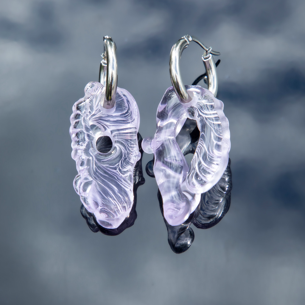 Vanessa Schindler is an eponymous fashion and accessories label based in Switzerland. A graduate of the Geneva University of Art and Design, Vanessa was awarded the Grand Prix d'Hyères in 2017 for her master's collection. In 2018 she turned to accessories and jewellery, leaving fashion to create her pieces by hand in her workshop. Her fourth jewellery collection 'Bioresin Hoops' stems from experiments with wax in water that create abstract, organic forms she likes to describe as sci-fi fossils.