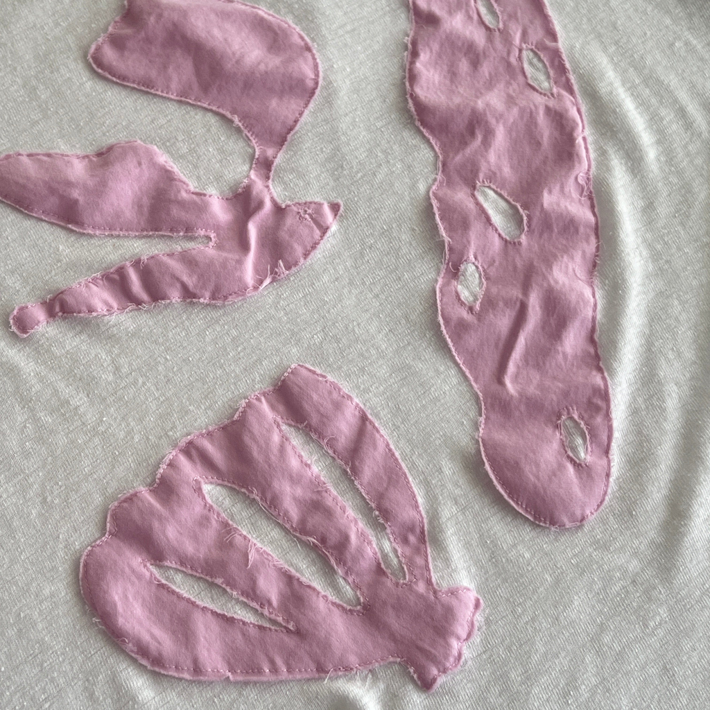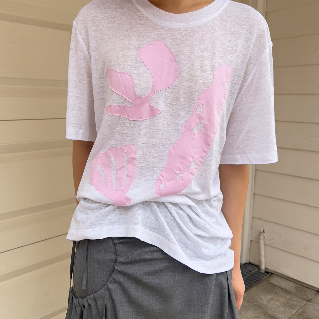 This t-shirt is inspired by the beaches of Okinawa. It features details of birds, stones, and shells. Made from a blend of linen and rayon, it is lightweight and breathable.