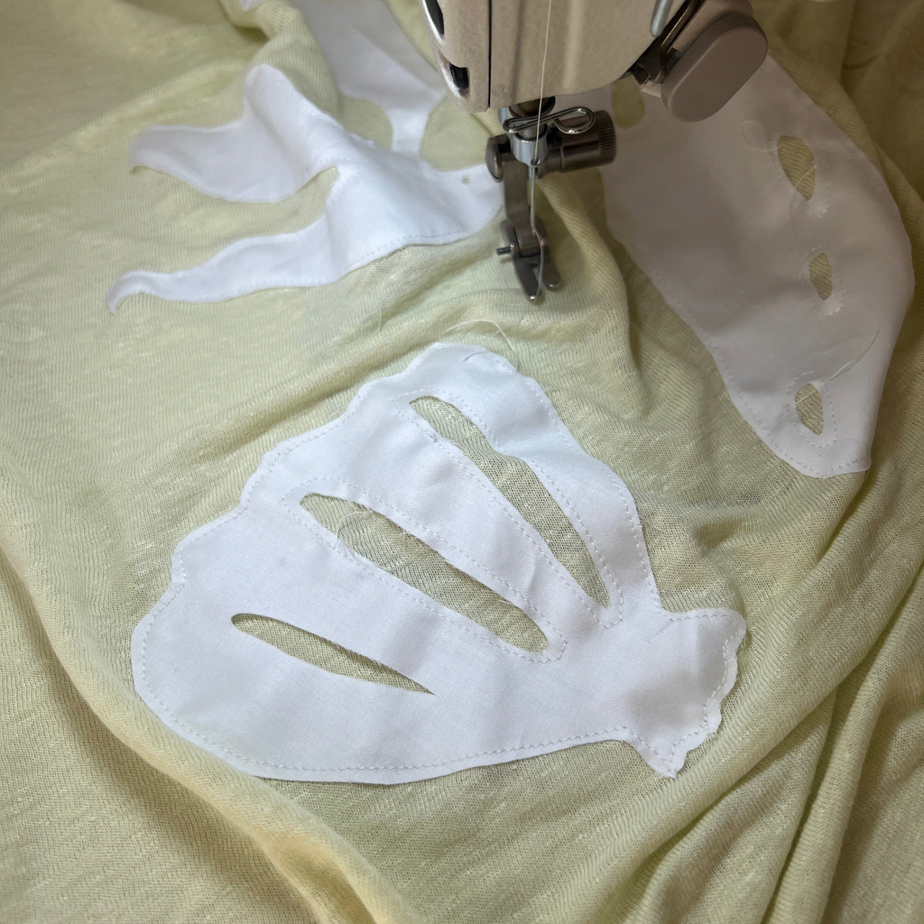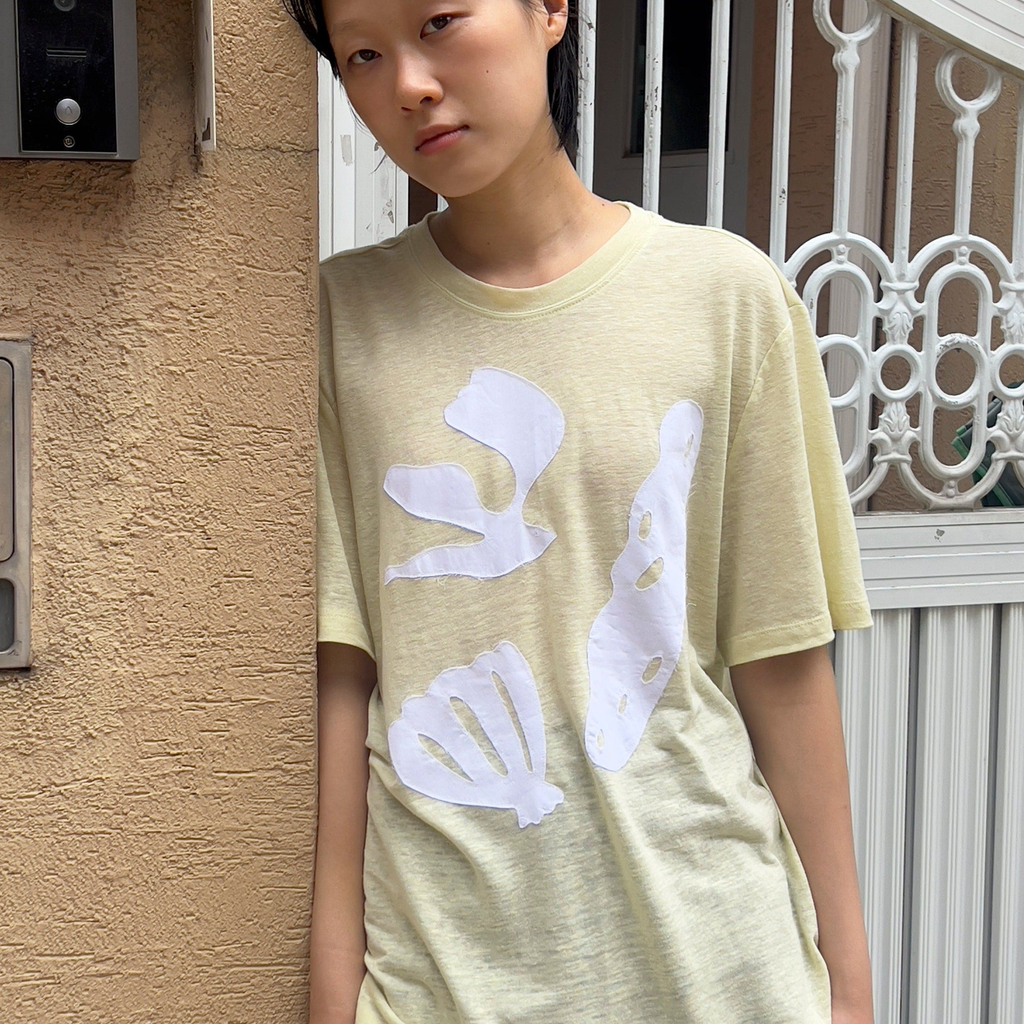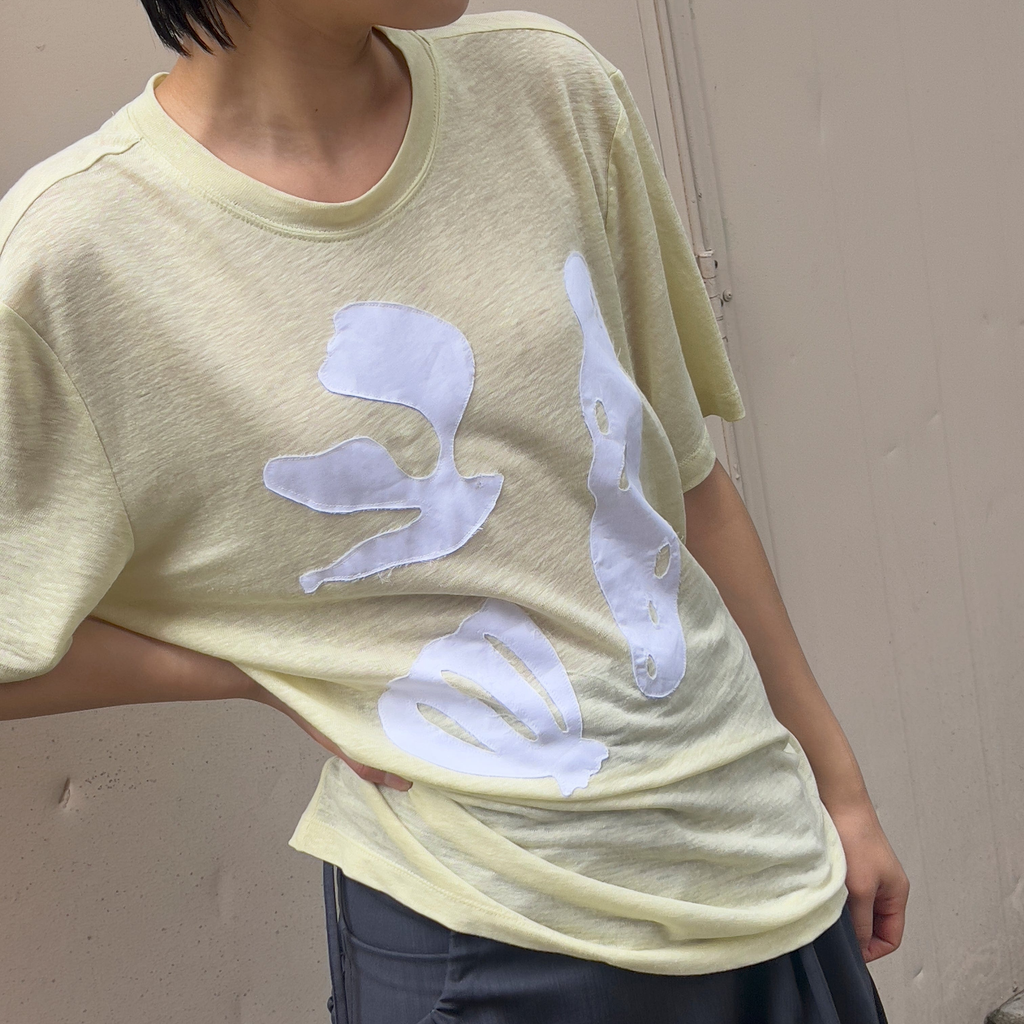 This t-shirt is inspired by the beaches of Okinawa. It features details of birds, stones, and shells. Made from a blend of linen and rayon, it is lightweight and breathable.