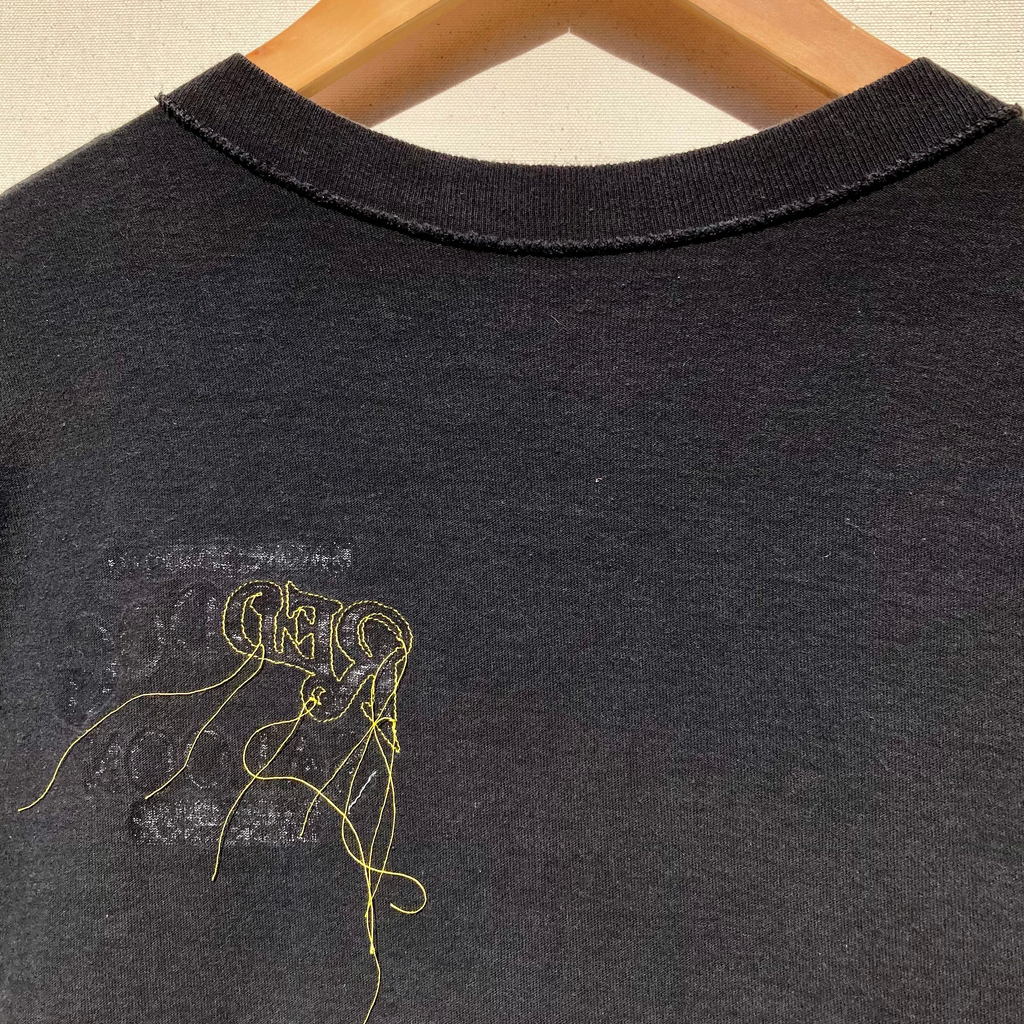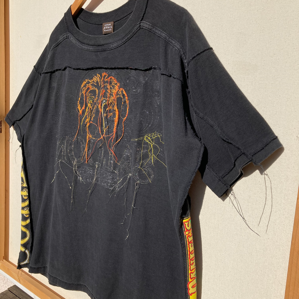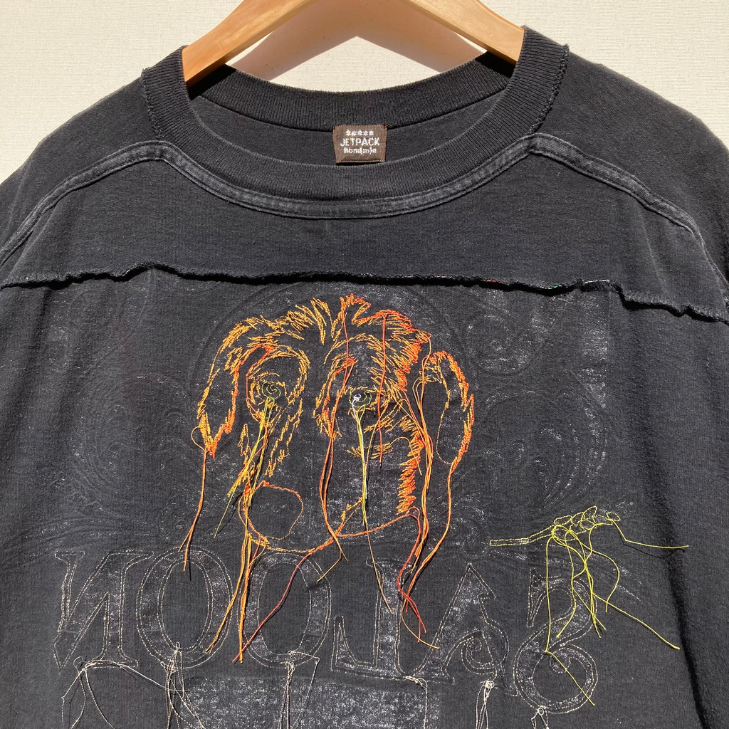 Hand embroidered “Dog Head”, with digital print. Inside-out backwards deconstructed vintage tee. REVERSIBLE design.