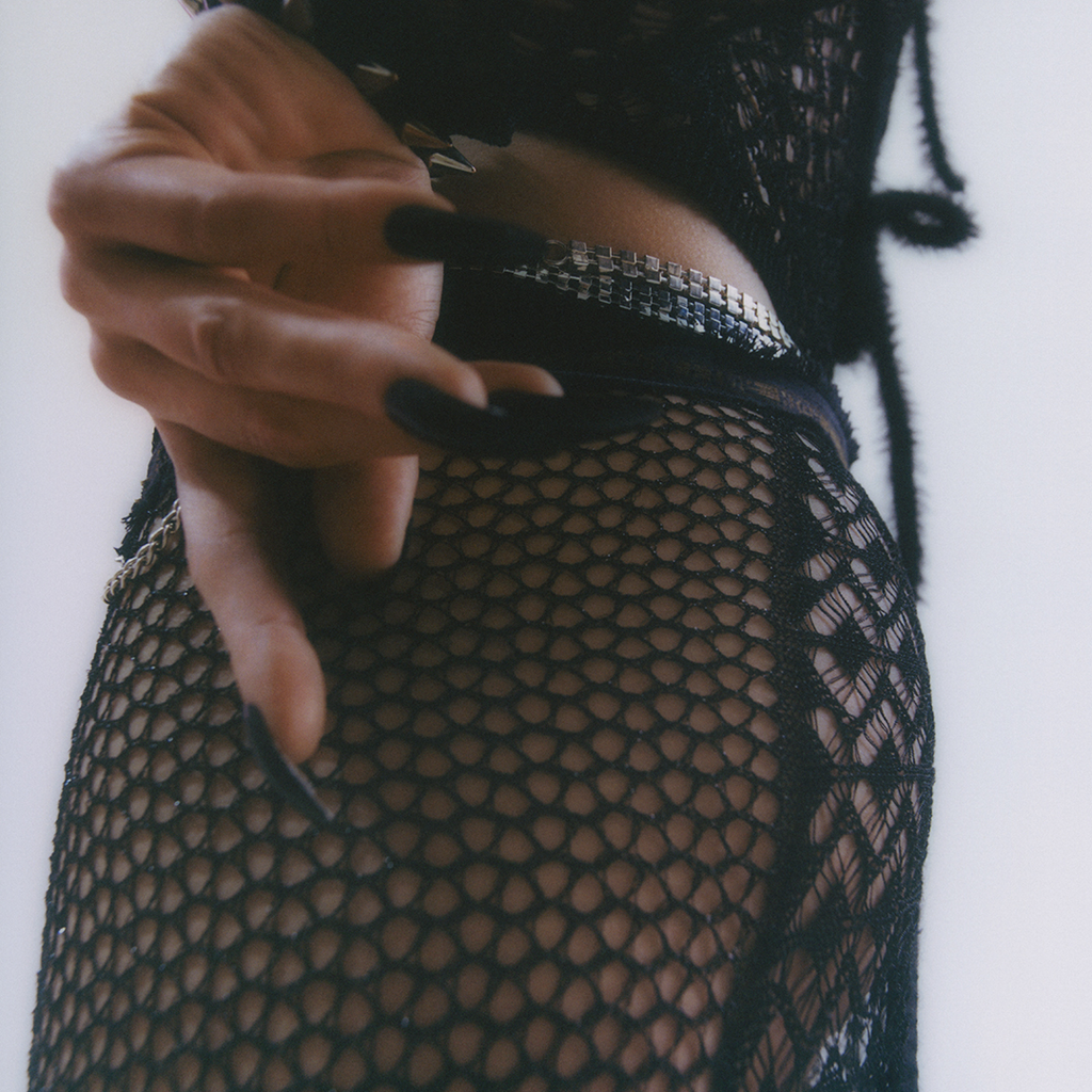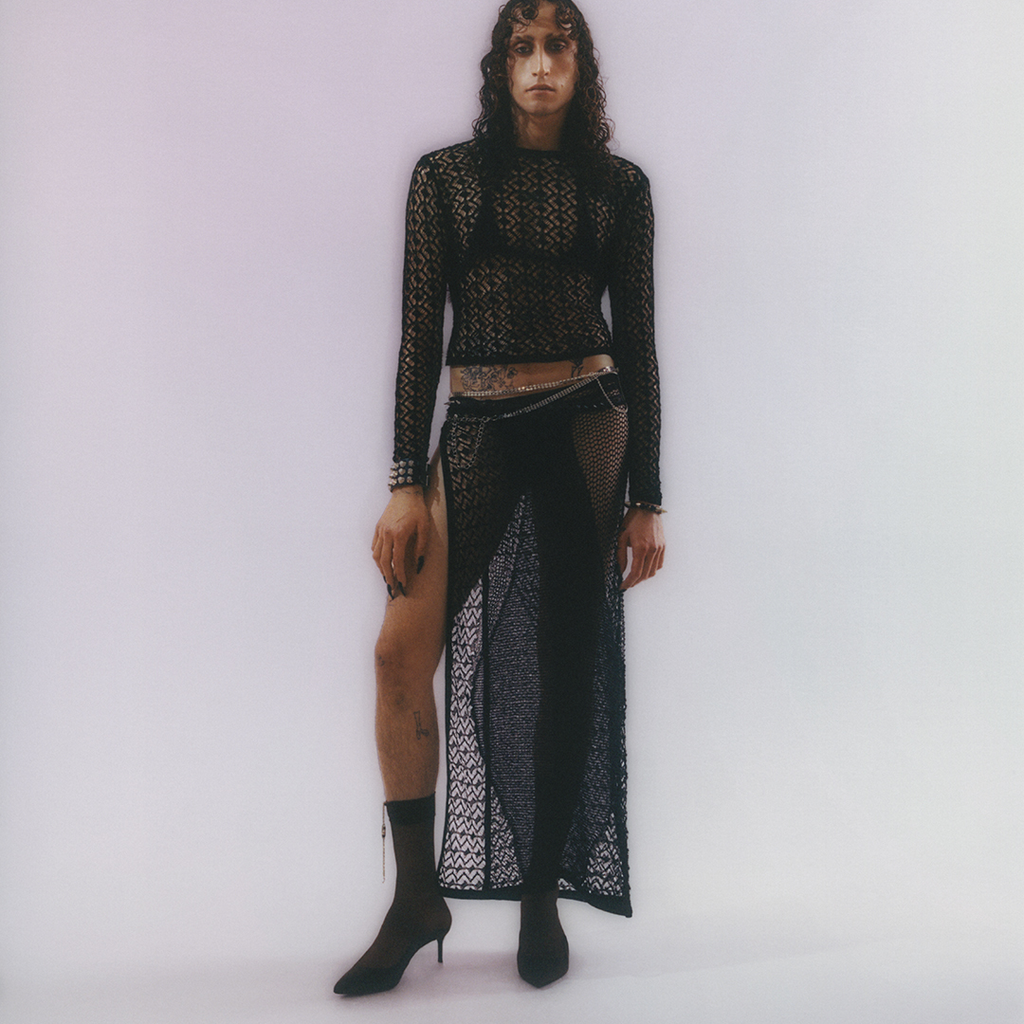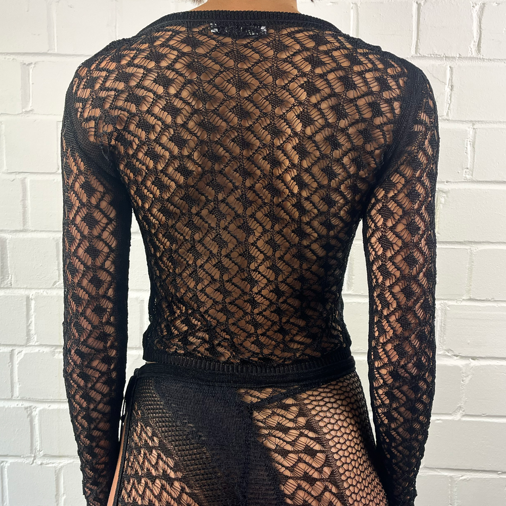 Long sleeve semi-sheer knitted diamond top by Raquel de Carvalho.