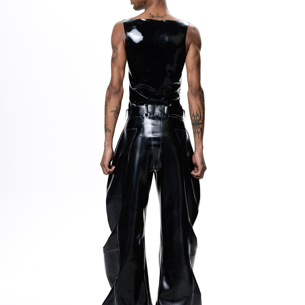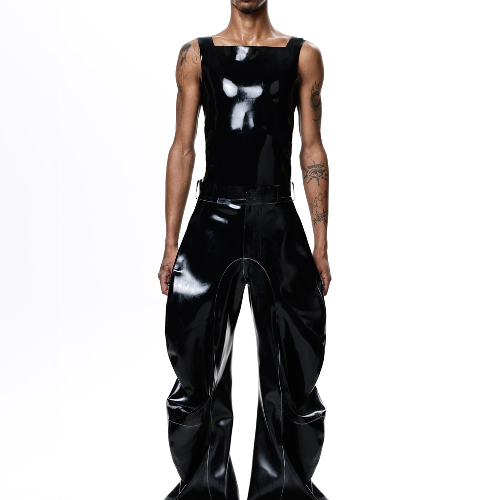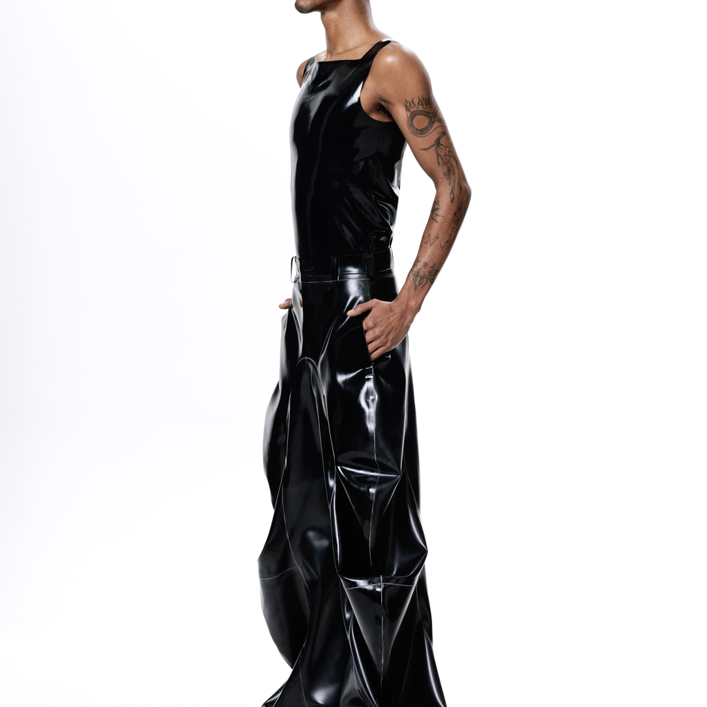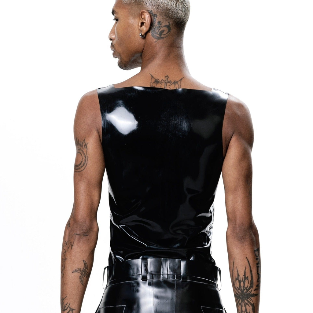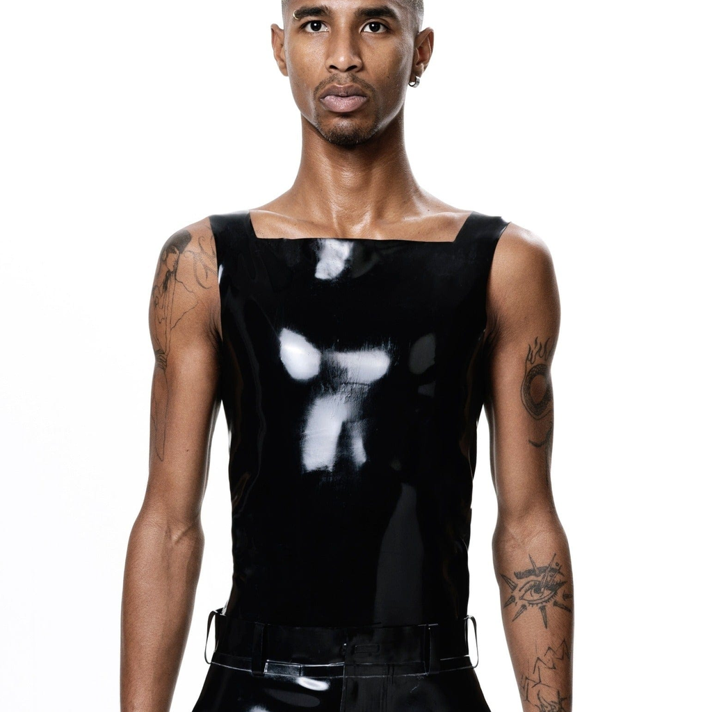 A handcrafted black latex tank, perfect for layering and styling. Its sculpted fit offers timeless elegance and versatility. Contoured fit.