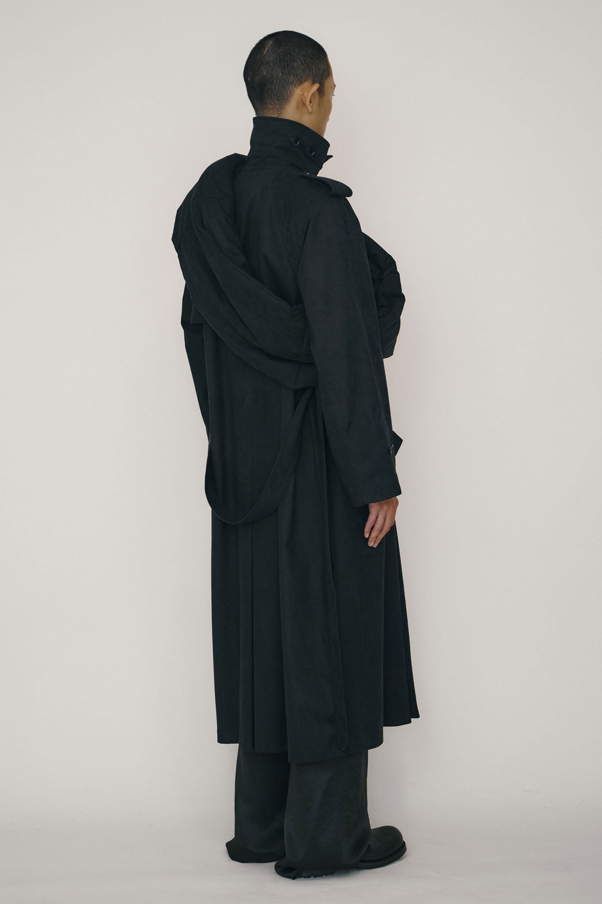 Long-sleeve trench coat in black, crafted from water-repellent faux-suede. Hook-eye fastening at notched lapel collar. Double-breasted button closure at front. Buttoned epaulets. Storm flap at chest. Rain shield at back. Adjustable belt and sleeve strap. Welt pockets at waist. Central vent at back hem.