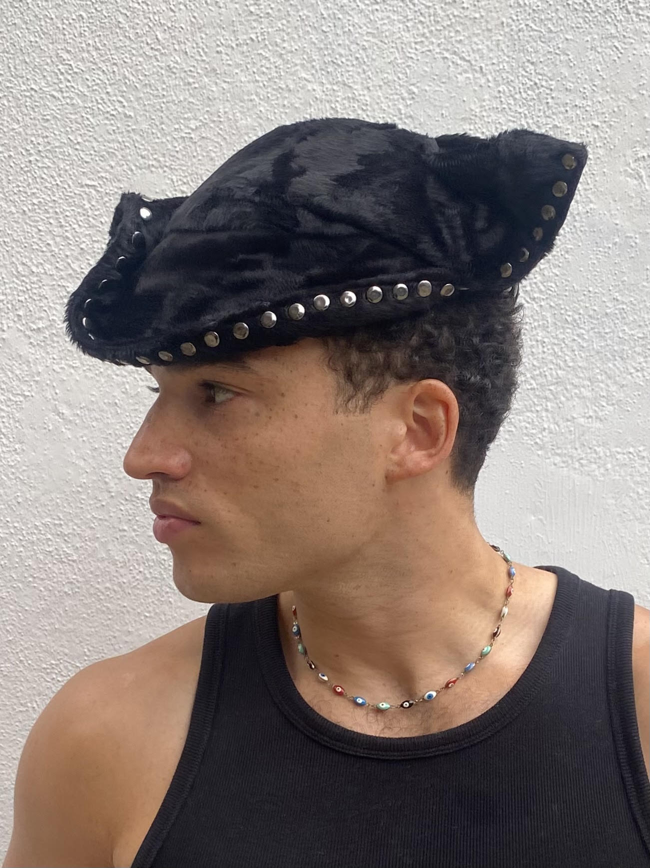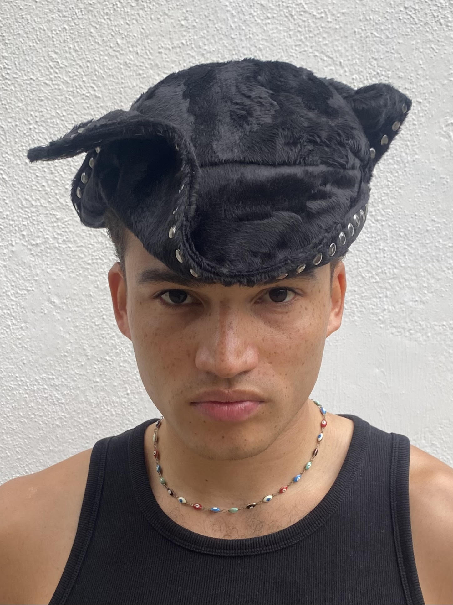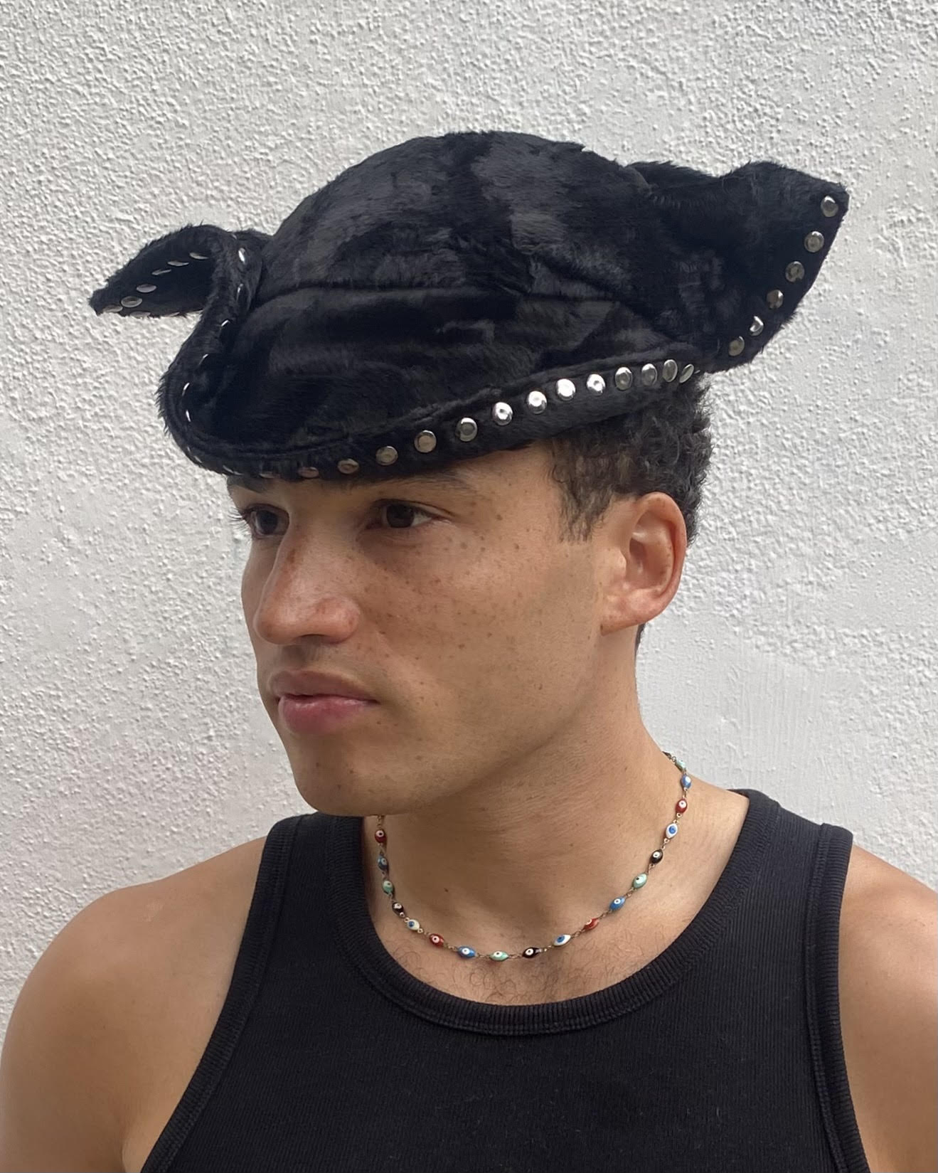 Benny Andallo is a London-based accessories designer whose faux fur hat creations have propelled him into the sights of the likes of Rihanna to FKA Twigs. Handcrafted in his studio, each oversized hat has a personality of its own. Benny’s collaboration with Anna Castellano, the ‘Faux Fur Trim Castellano Crown’ is the epitome of y2k revival.