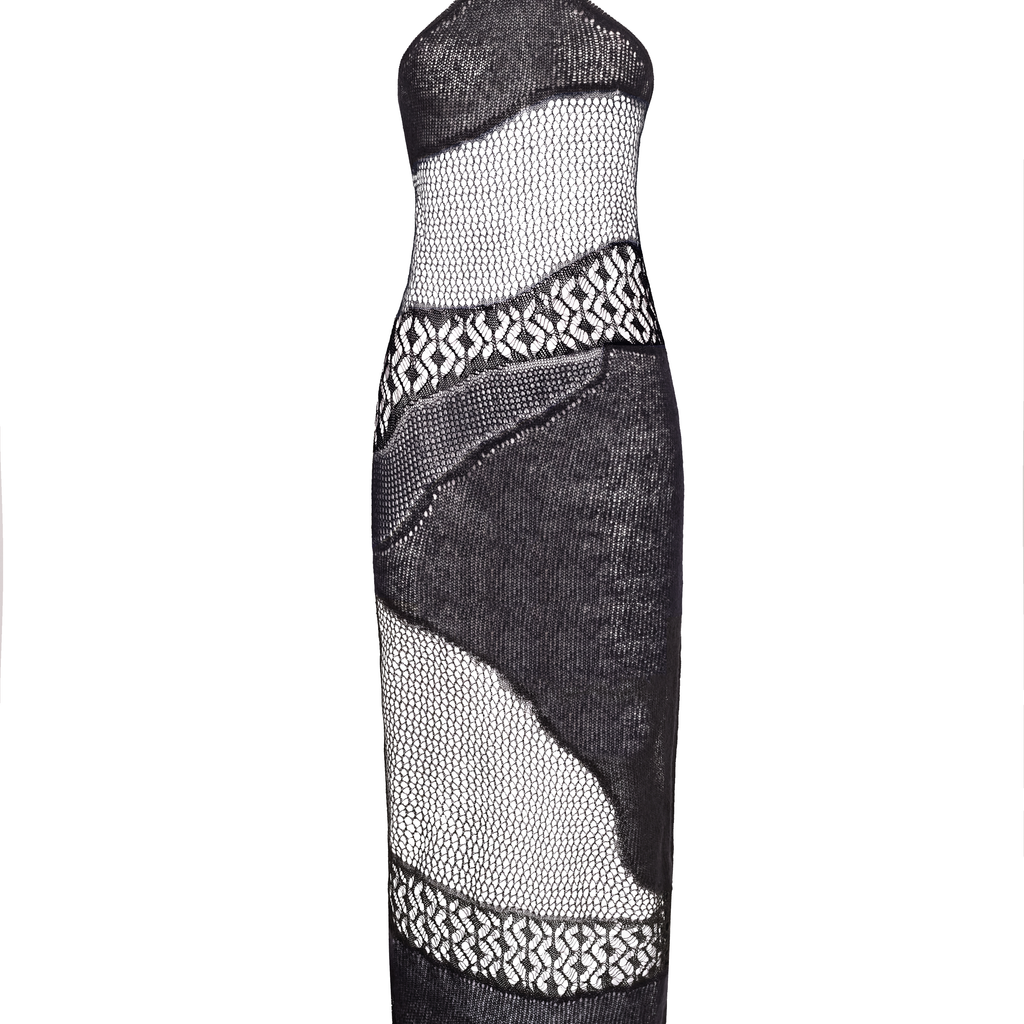 Knit sheer lace dress made with mohair-blend with intarsia technique featuring 4 different stitches and mix of yarns.