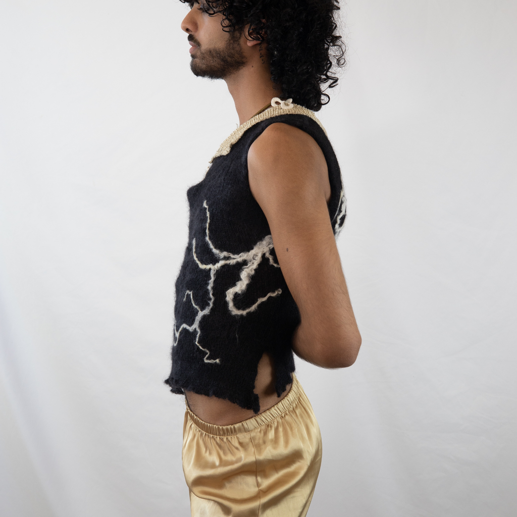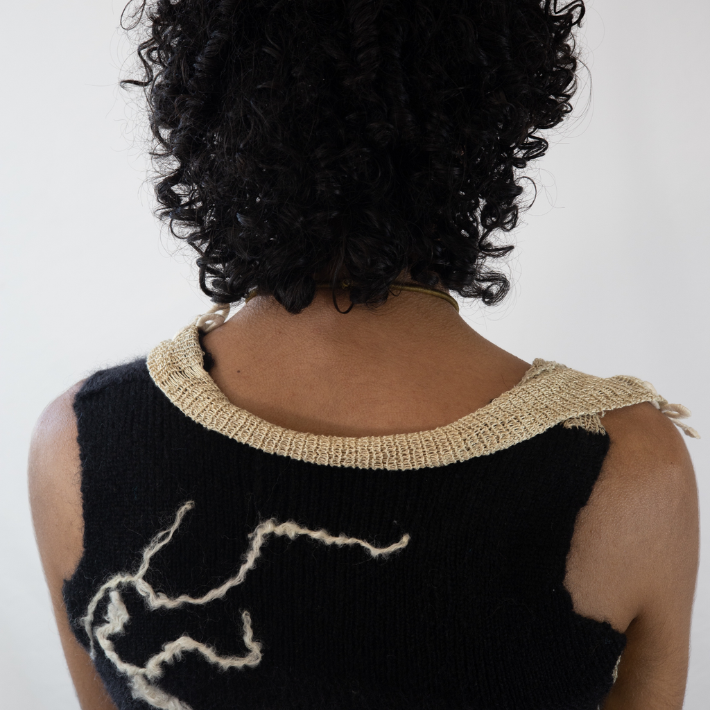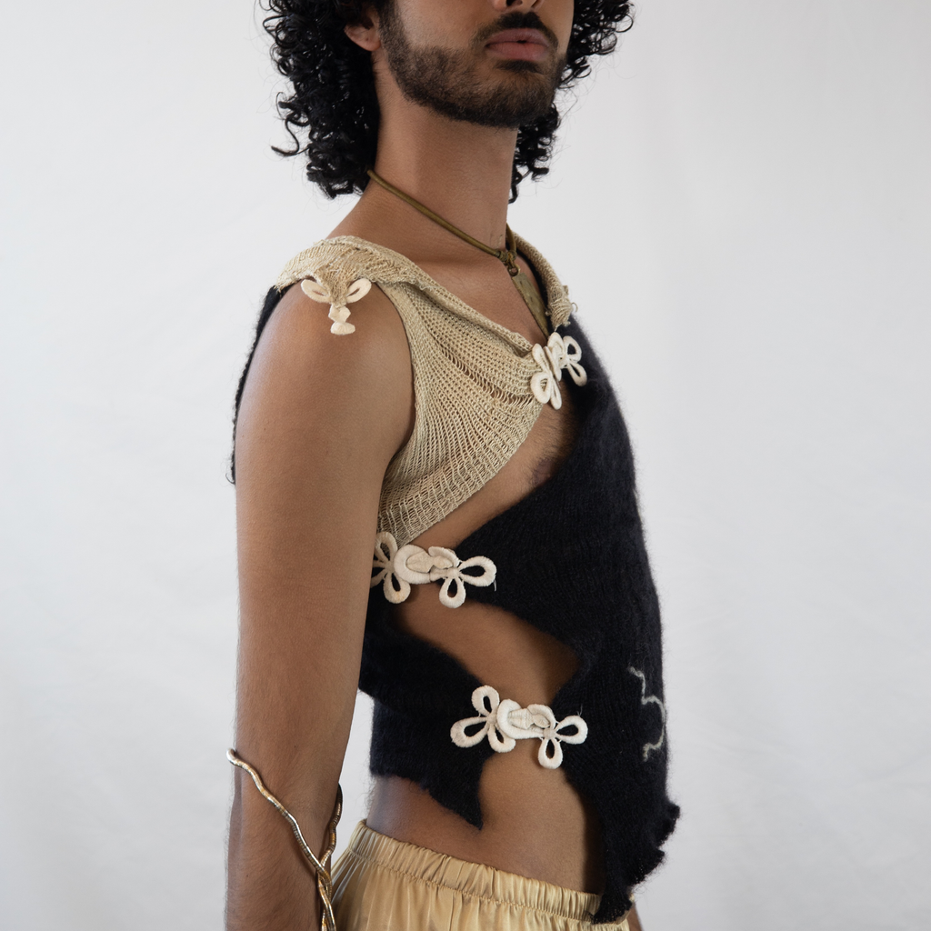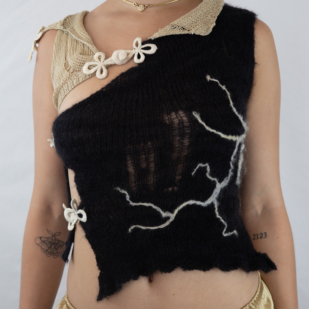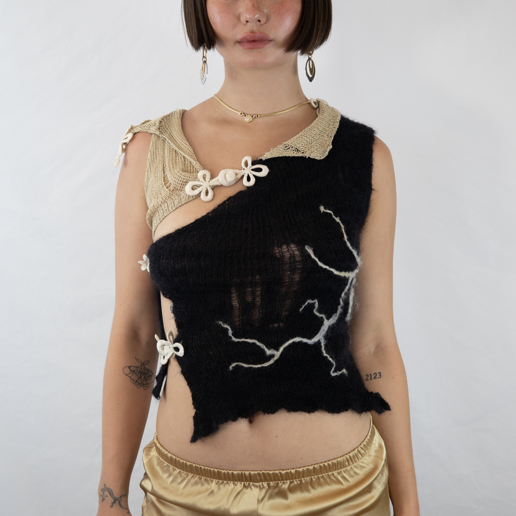 This Black Qi “Chi” Pao Top is knit with a skein of artisanal mohair from a female farmer in Maine and artisanal botanically dyed silk from Japan. Felted with mohair locks from a goat named Peach sheared by a female artisan in Maryland. Finished with vintage deadstock silk frog closures from Michigan.