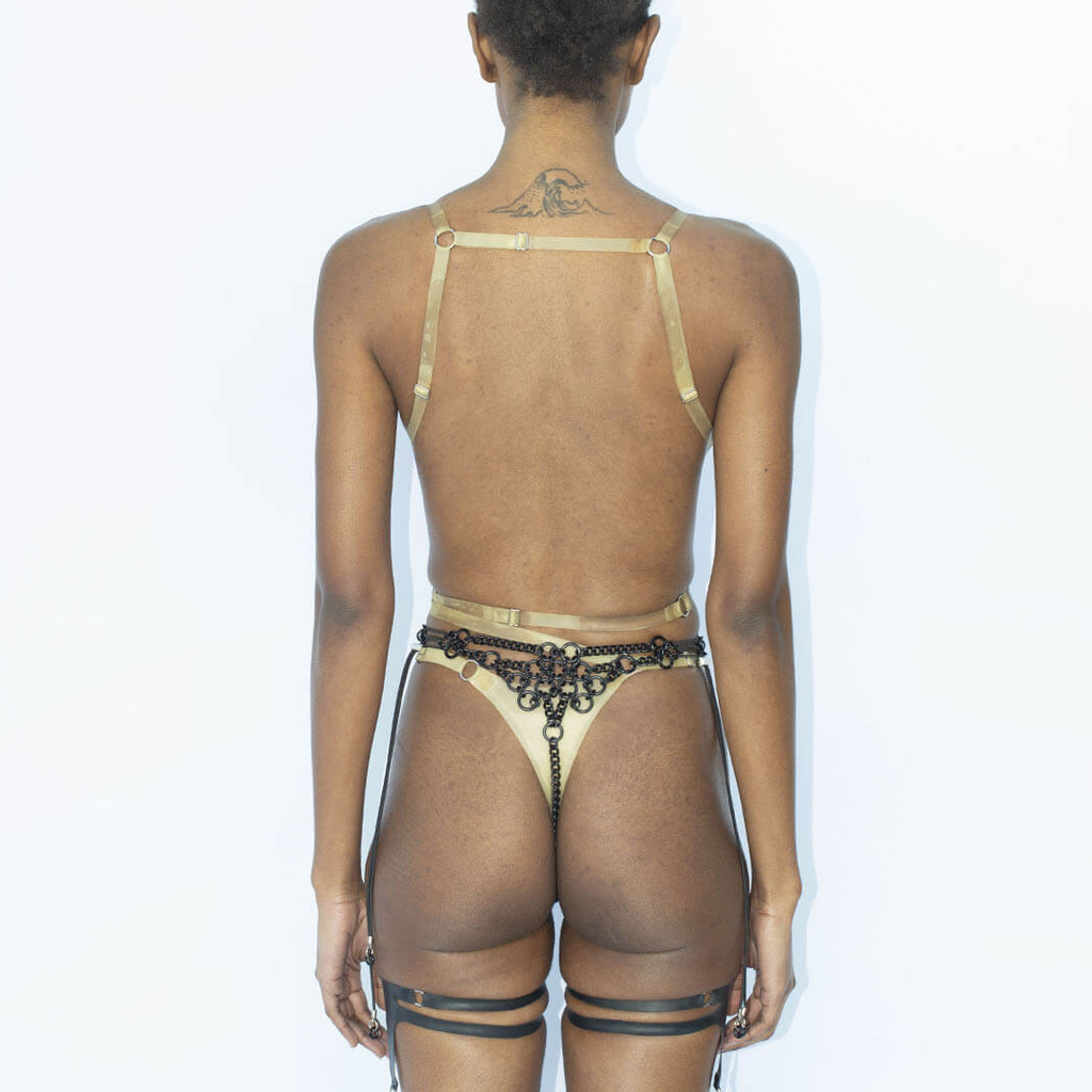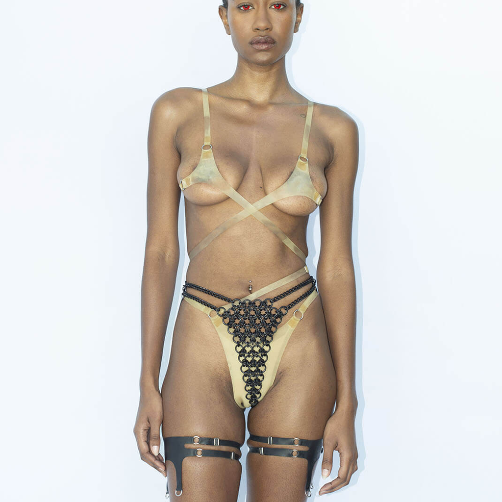 Jalaconda is a multidisciplinary artistic project, focused on the body. The LGBTQIA+ brand researches unconventional materials, such as latex, steel and natural Brazilian stones. They aim to discuss the place of manual work and personal adornment, knowing that clothes are fully political as they are from a country historically full of complexities.