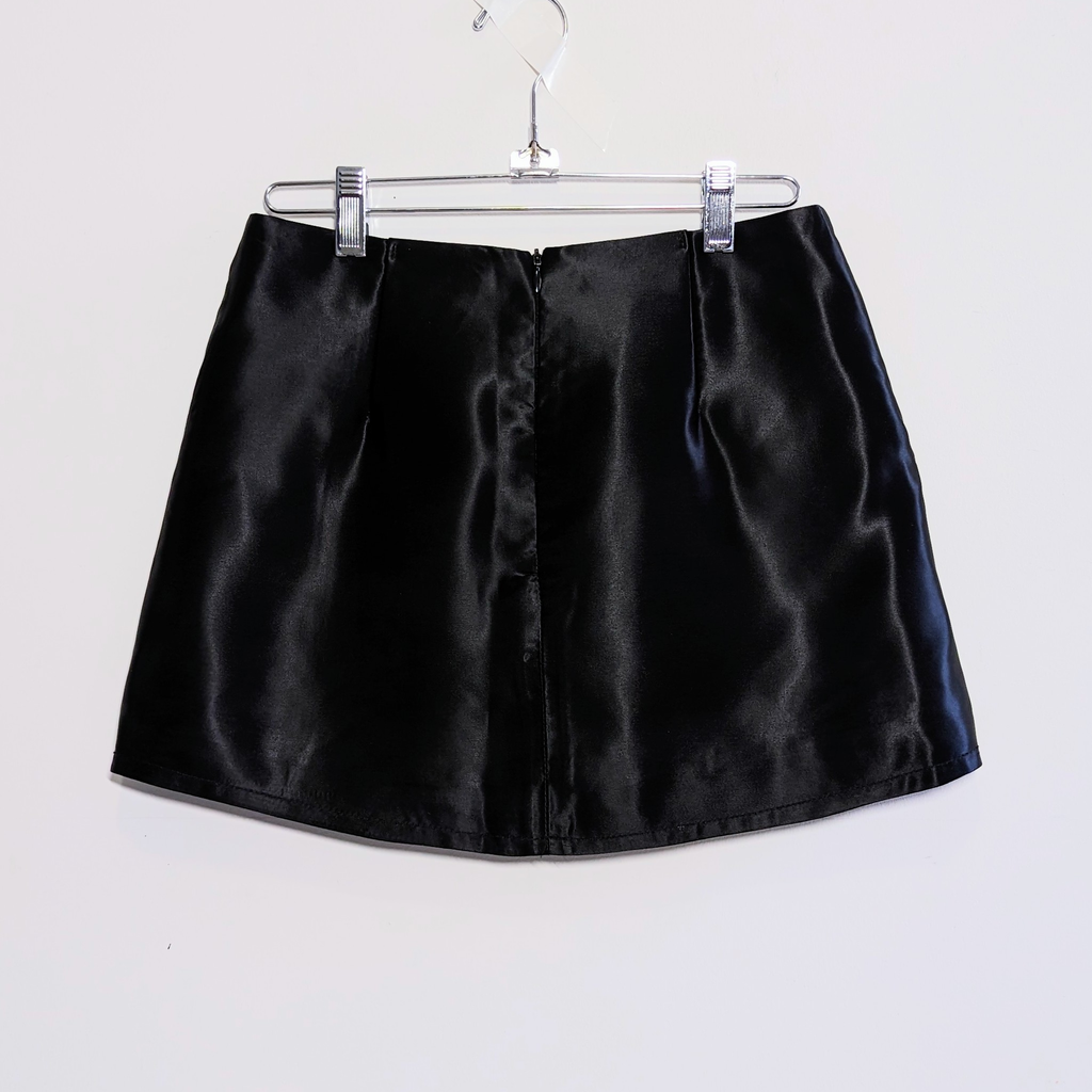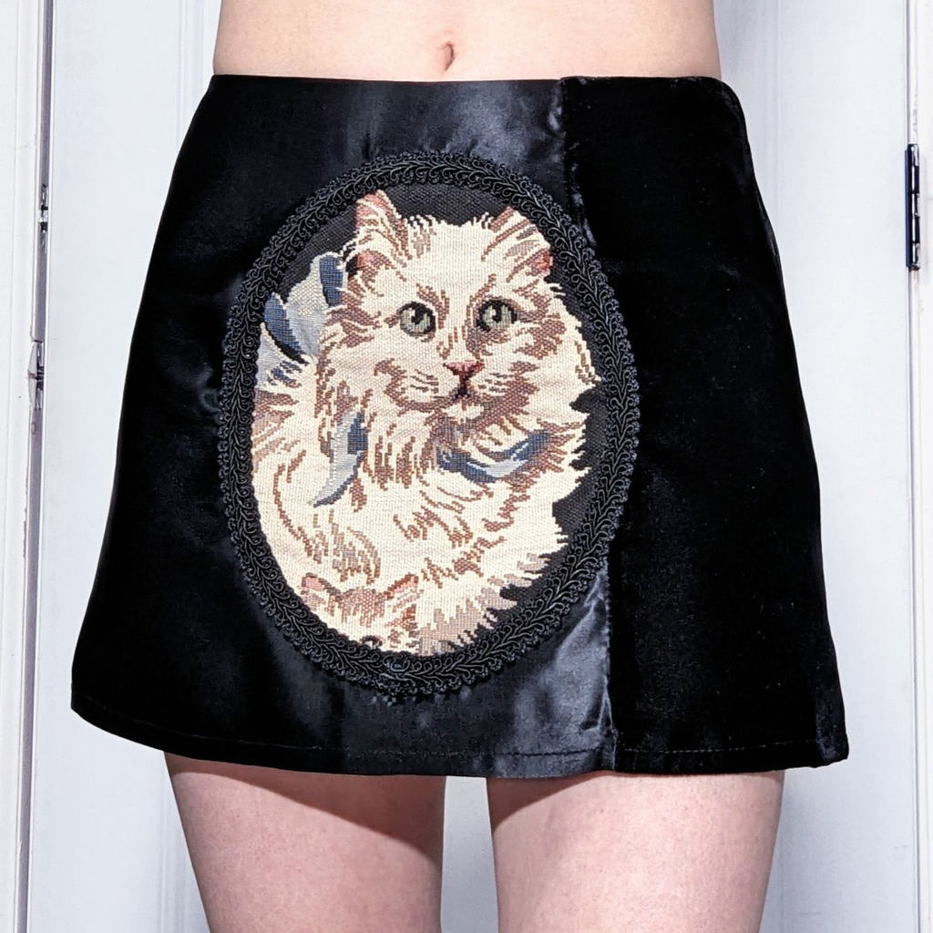 Black satin and velvet mini skirt featuring a vintage tapestry of a white cat with a blue ribbon tied around its neck, framed in black braided trim. Invisible zip closure at center back. Fully lined.
