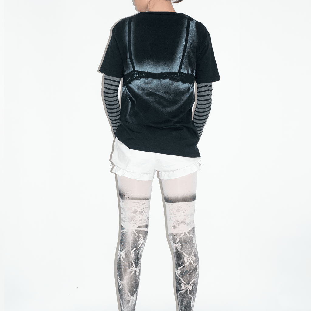 Tights are made in Italy with reinforced feet and cotton gusset for extra comfort and spraypainted individually in our Atelier in Paris with deadstock lace. This makes each tight completely unique