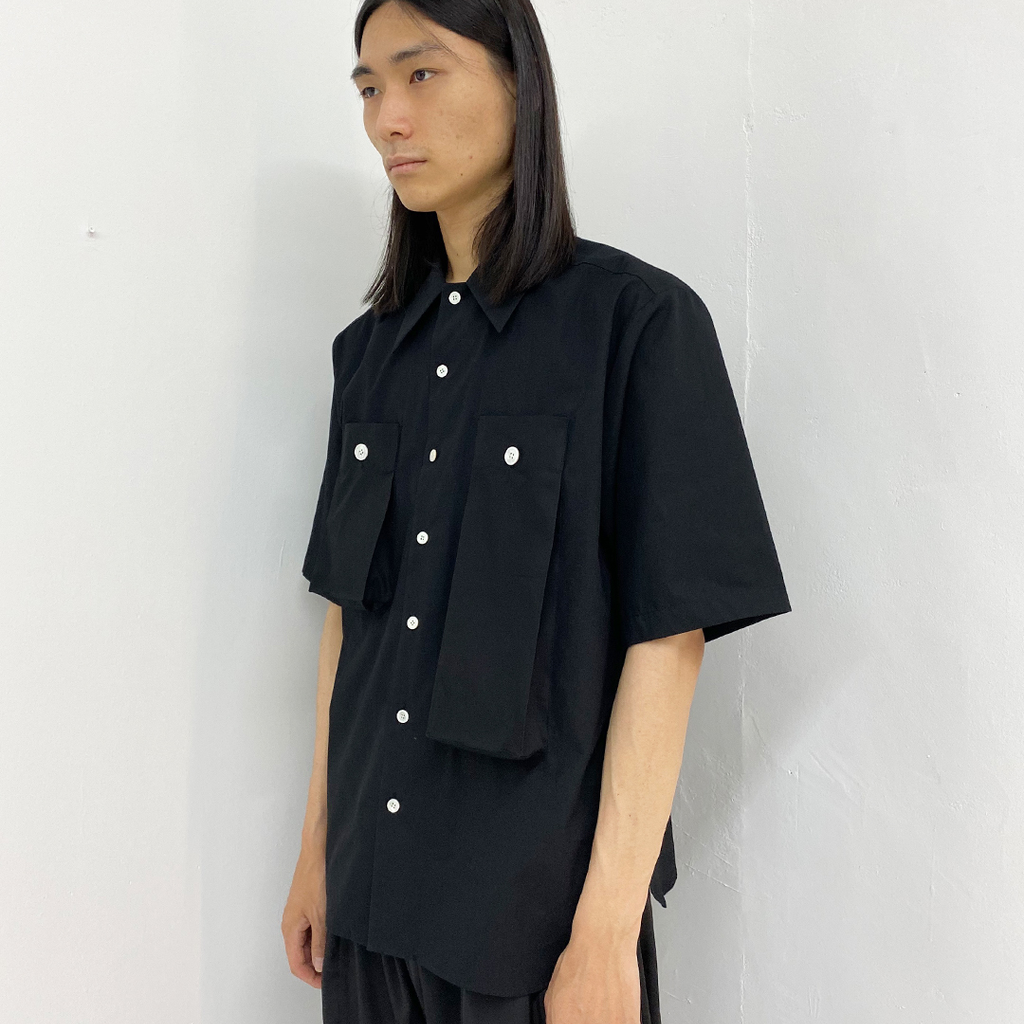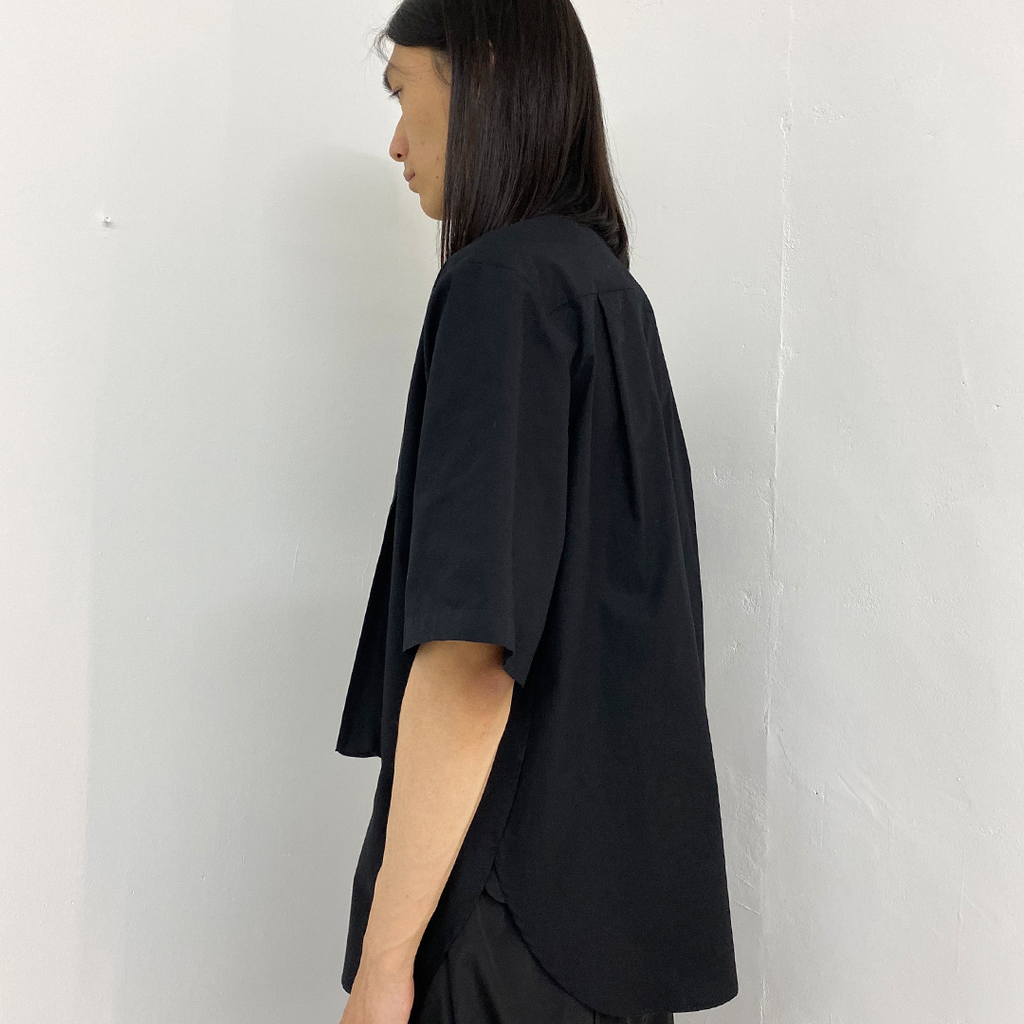 Short sleeve cotton shirt. Spread collar.Asymmetric hem. Pearls-buttons at front. Pockets at front. Made in South Korea.
