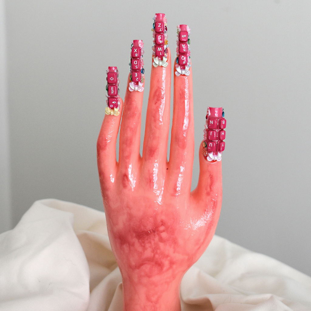 Hotnails666420 is an art installation, nail studio based in Montreal, Quebec seeking to explore themes of technology and the body through the social history of nail art. Hotnails666420 is creating nail sets using locally sourced deadstock objects and electronic components as well as hand painted and encapsulated designs. Most nail sets are 1/1 and will not be restocked.