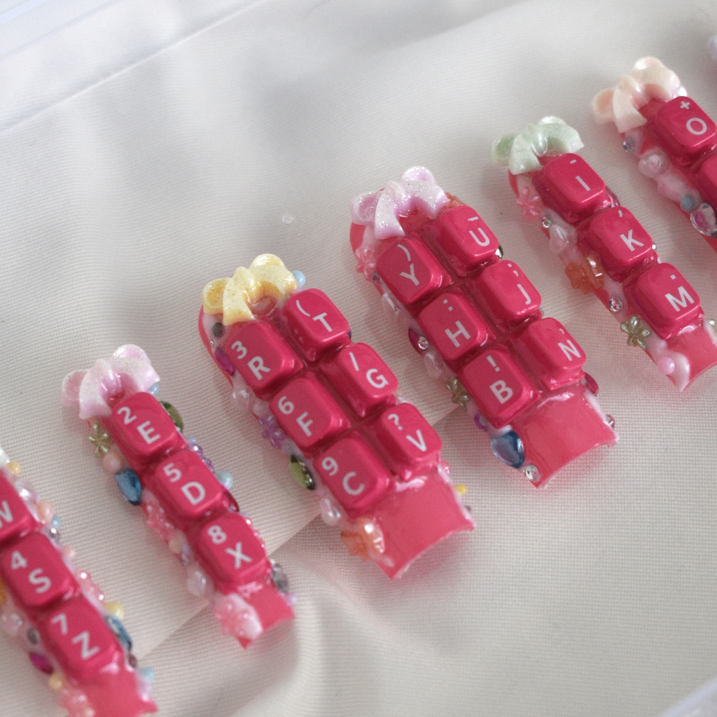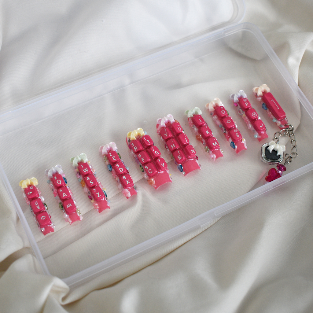 Set of 10 high quality, reusable press on nails with deco charm theme and full QWERTY keyboard from a deconstructed Blackberry Q5 cellphone. Includes detachable cell phone charm.