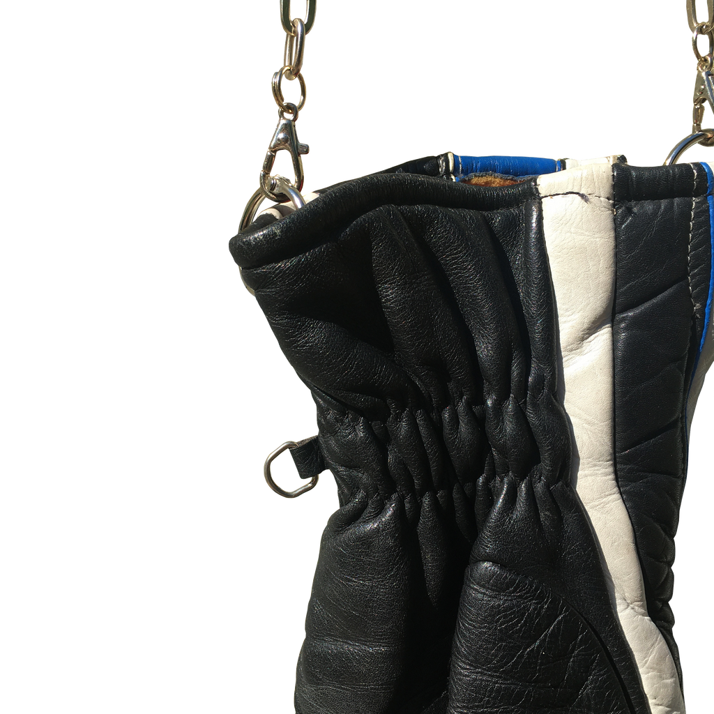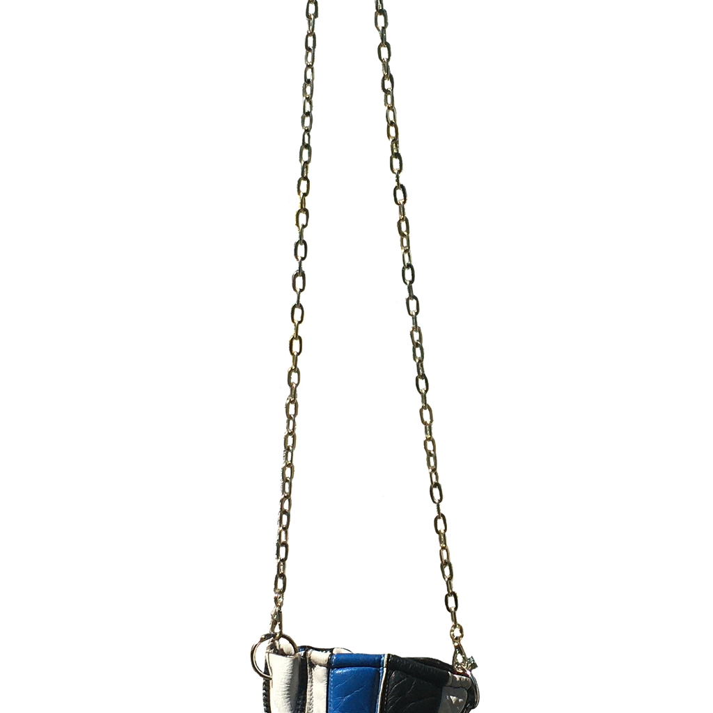 blue and black long chain handbag