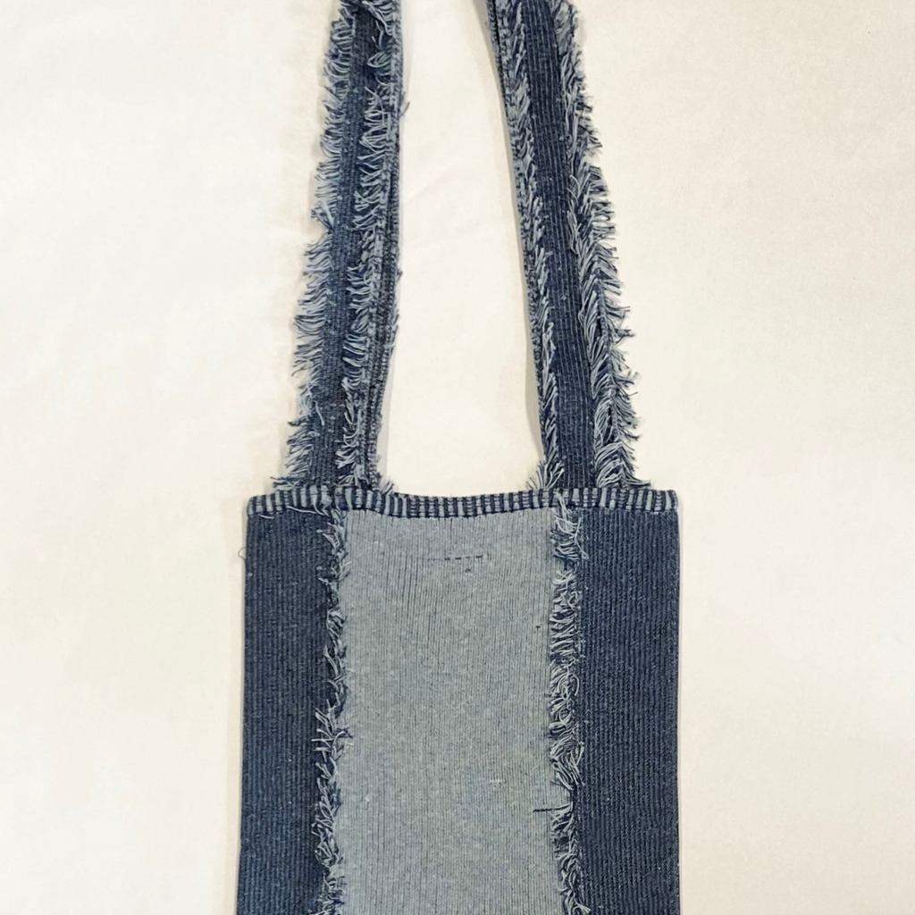 Rib bicolor denim tote bag with fringed seams