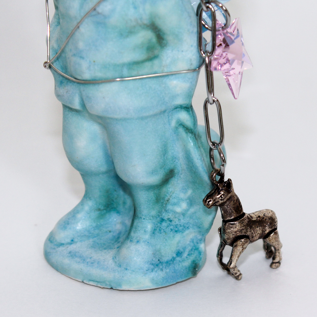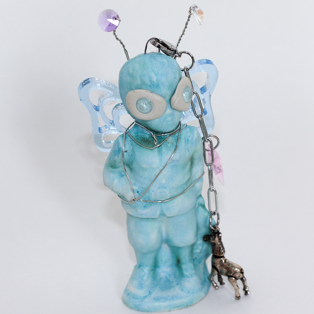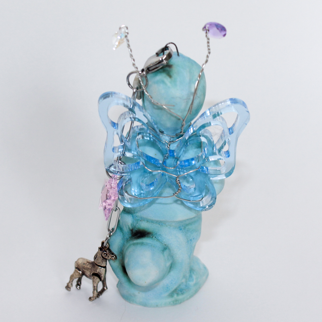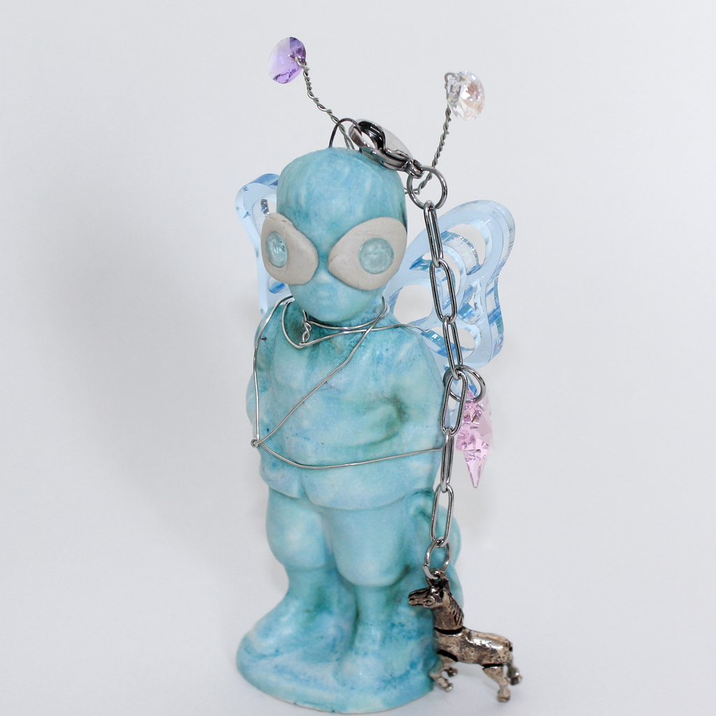Emma Pryde is an artist and jewelry designer based in Los Angeles. Her work combines visual motifs from various time periods to produce hybrid, shimmering objects that embody the idea that the digital world collapses history. Inspired by childhood toys, mythical creatures, video game characters, and ancient artworks, she synthesizes her references to create new artifacts from alternate worlds. Her work is composed out of a variety of materials including ceramic, cast porcelain, epoxy, laser-cut acrylic, and other mixed media.