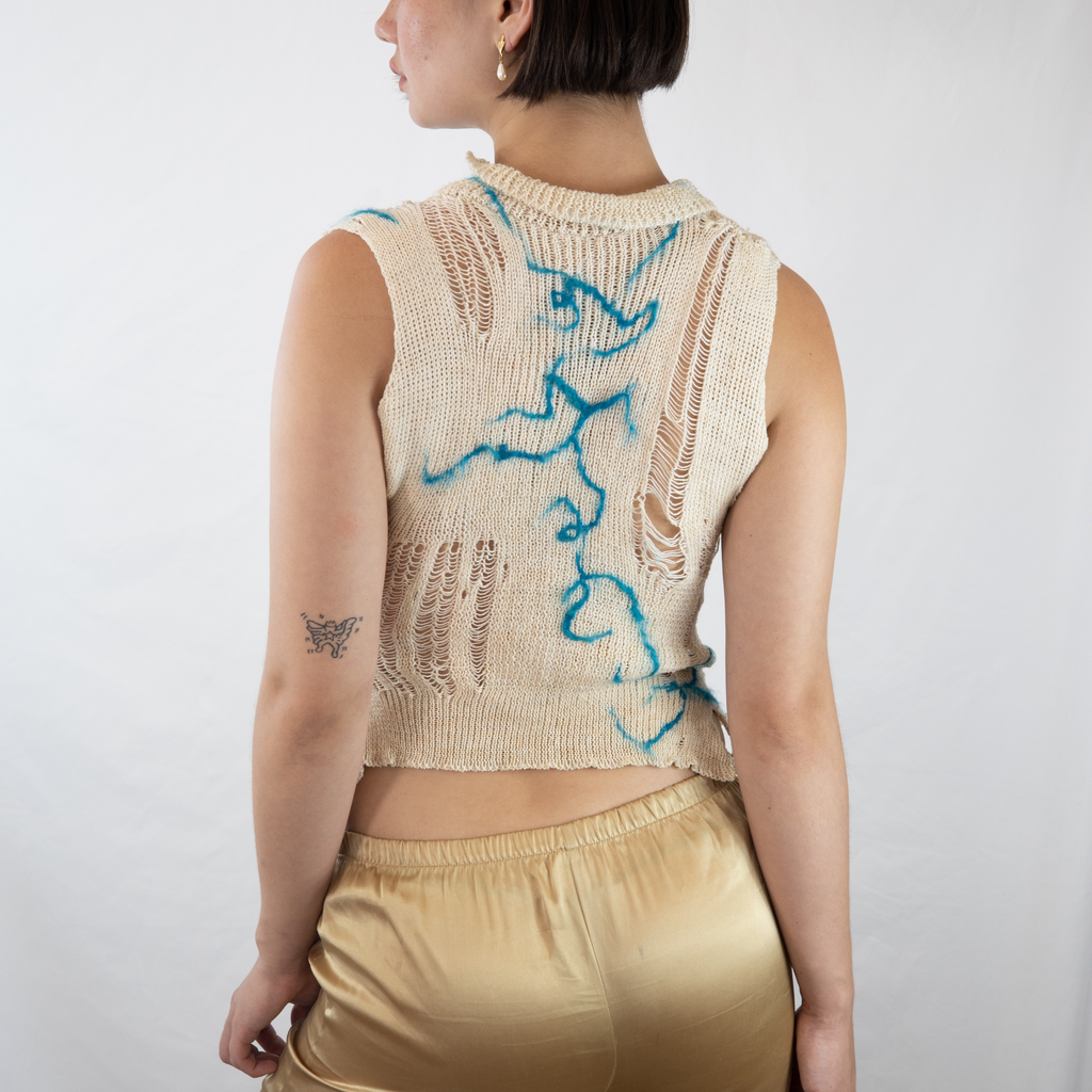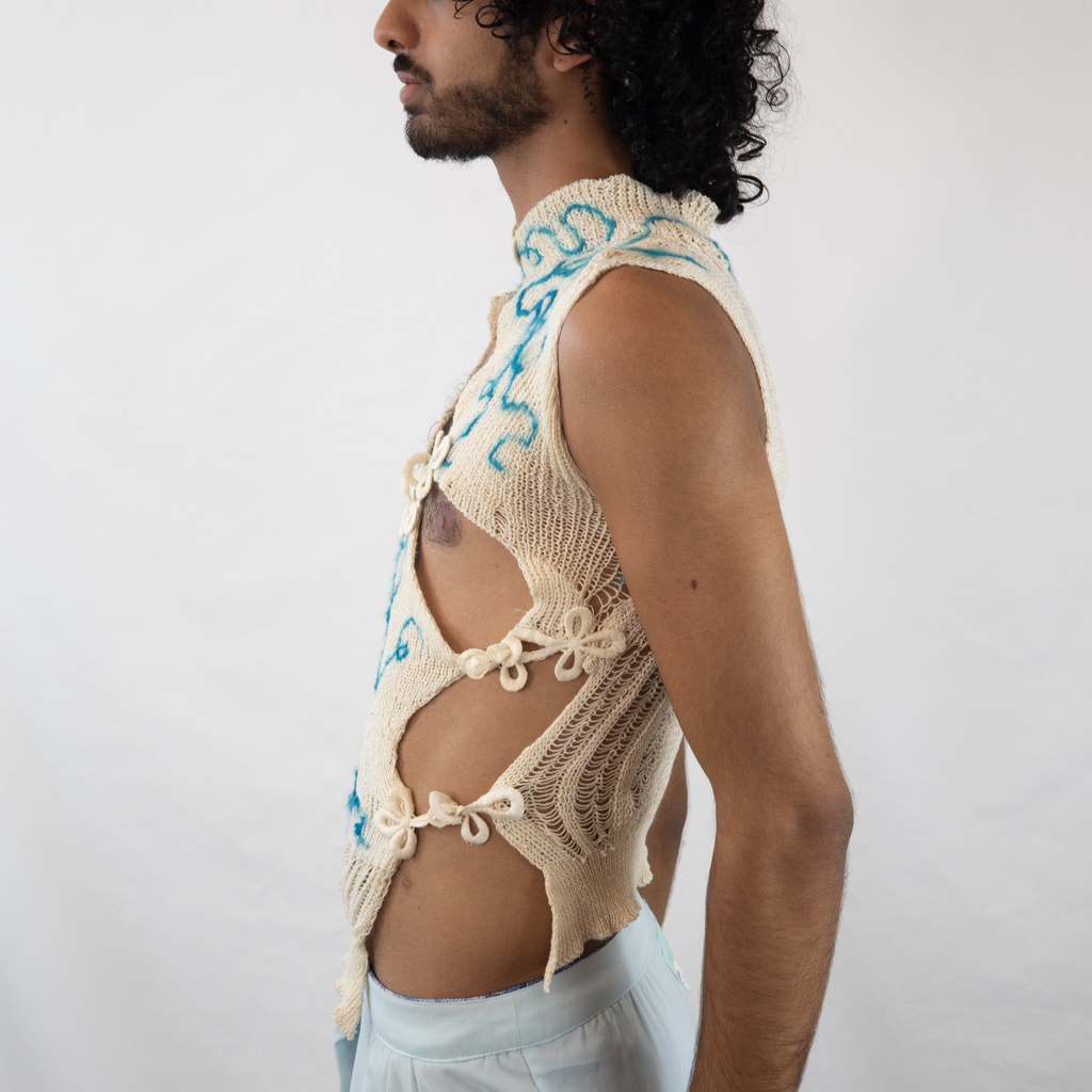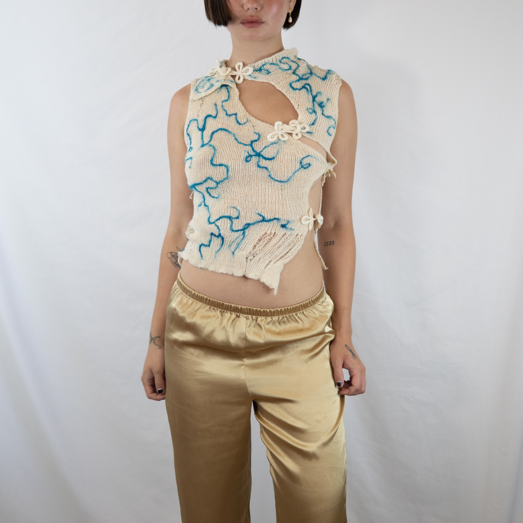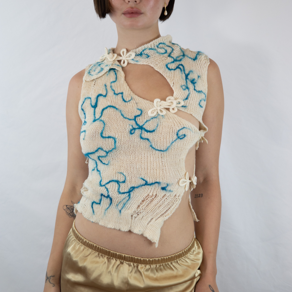 This Blue Qi “Chi” Pao Top is knit with a cone of secondhand cotton sourced from a market in Bushwick NYC. Felted with hand-dyed and hand-raised silk fiber hatched from silkworm eggs and raised over the course of three months in Brooklyn NYC by GRACE GUI Studio. Finished with vintage deadstock silk frog closures from Michigan.