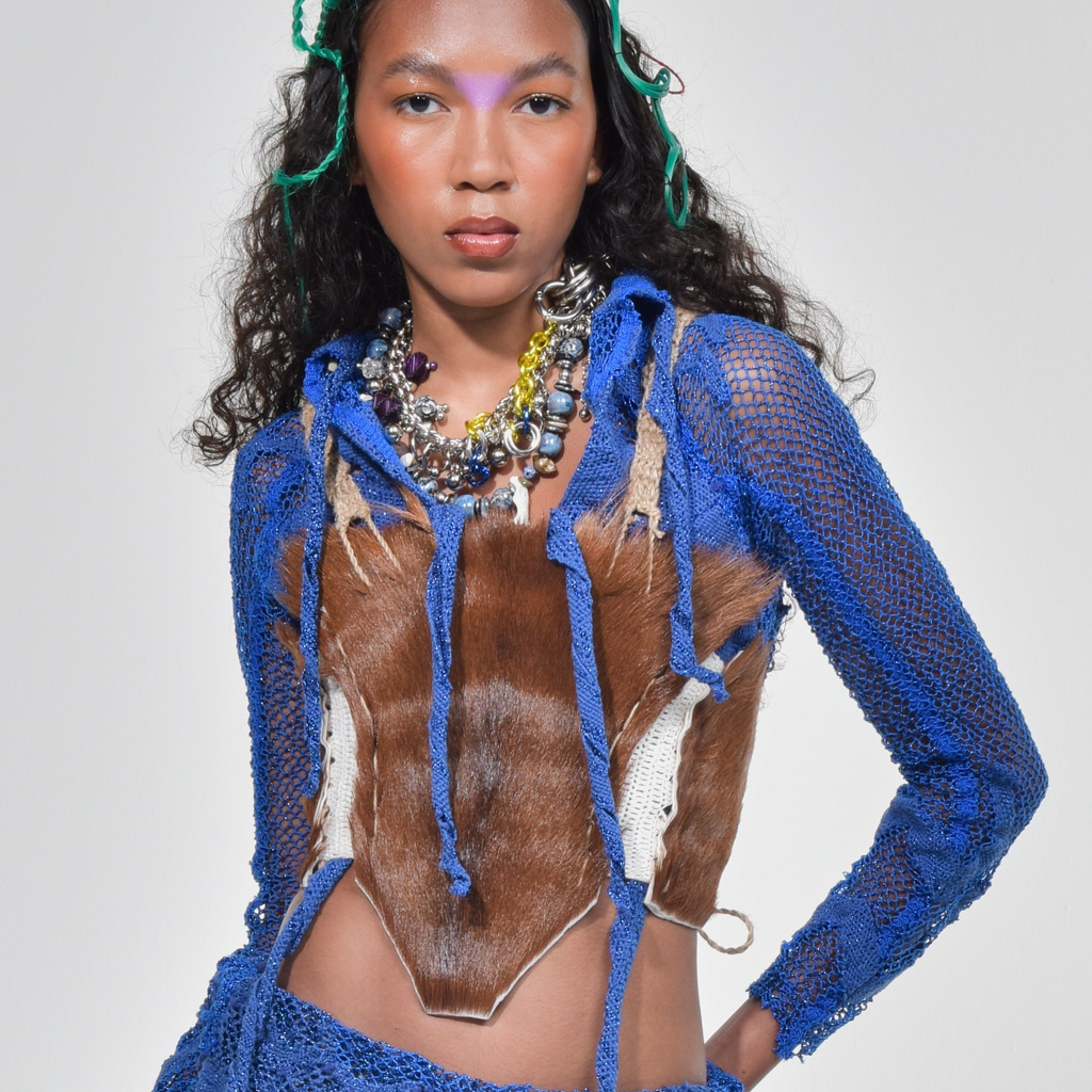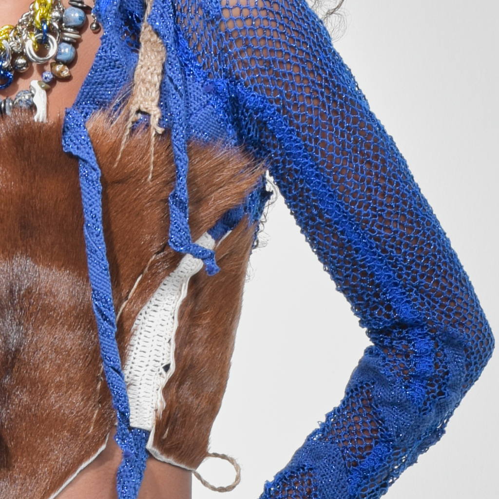 Handmade bobbin lace top in bamboo, lurex and cotton stretch fibre. Produced with lacemaker artisans in northern Brazil.