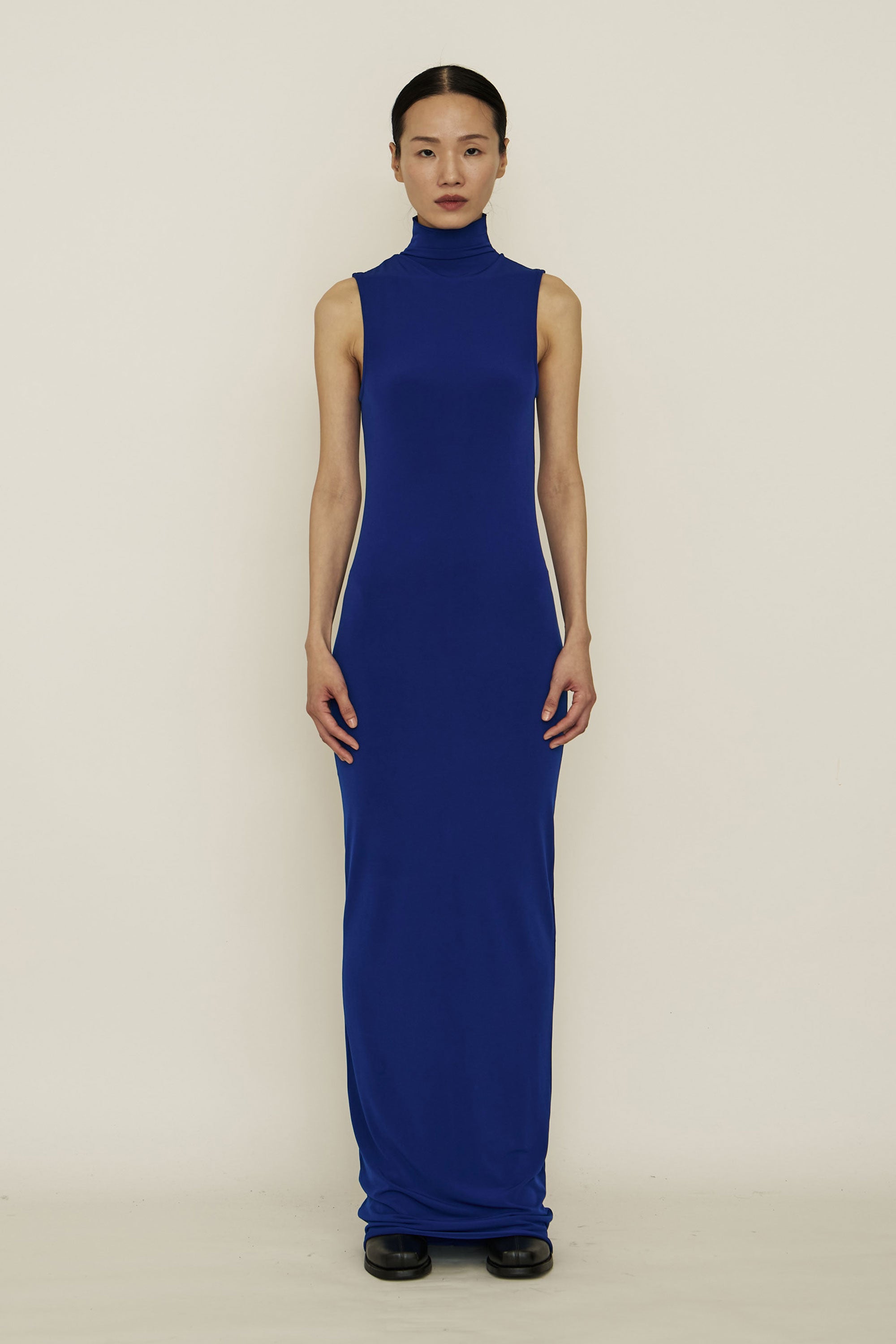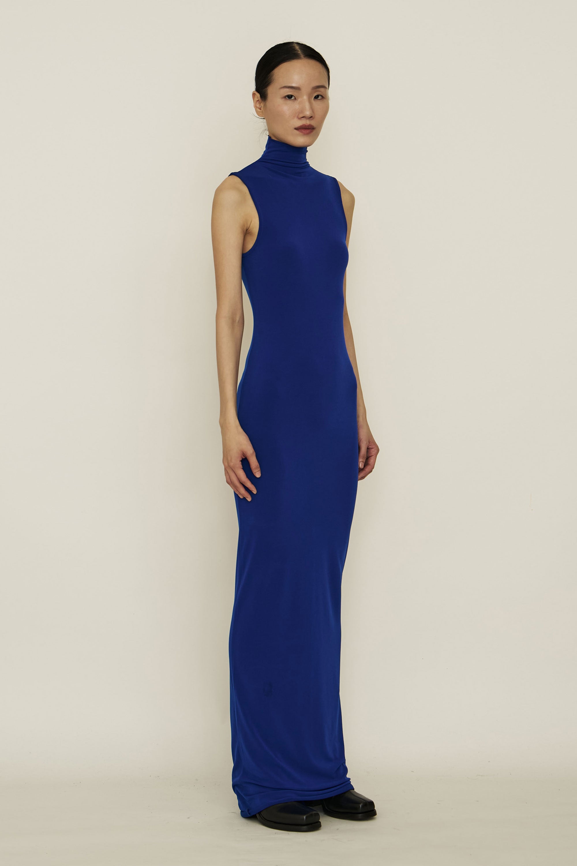 Skinny sleeveless maxi knit dress in blue. Turtleneck neckline. Raw edge hem.