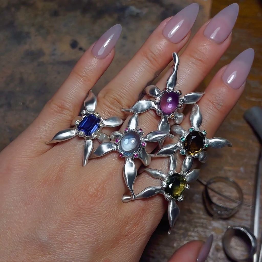 All Metal and Stones used is 100% Recycled.High Polished with Manau Polish, Finely Sanded, ultrasonically cleaned.