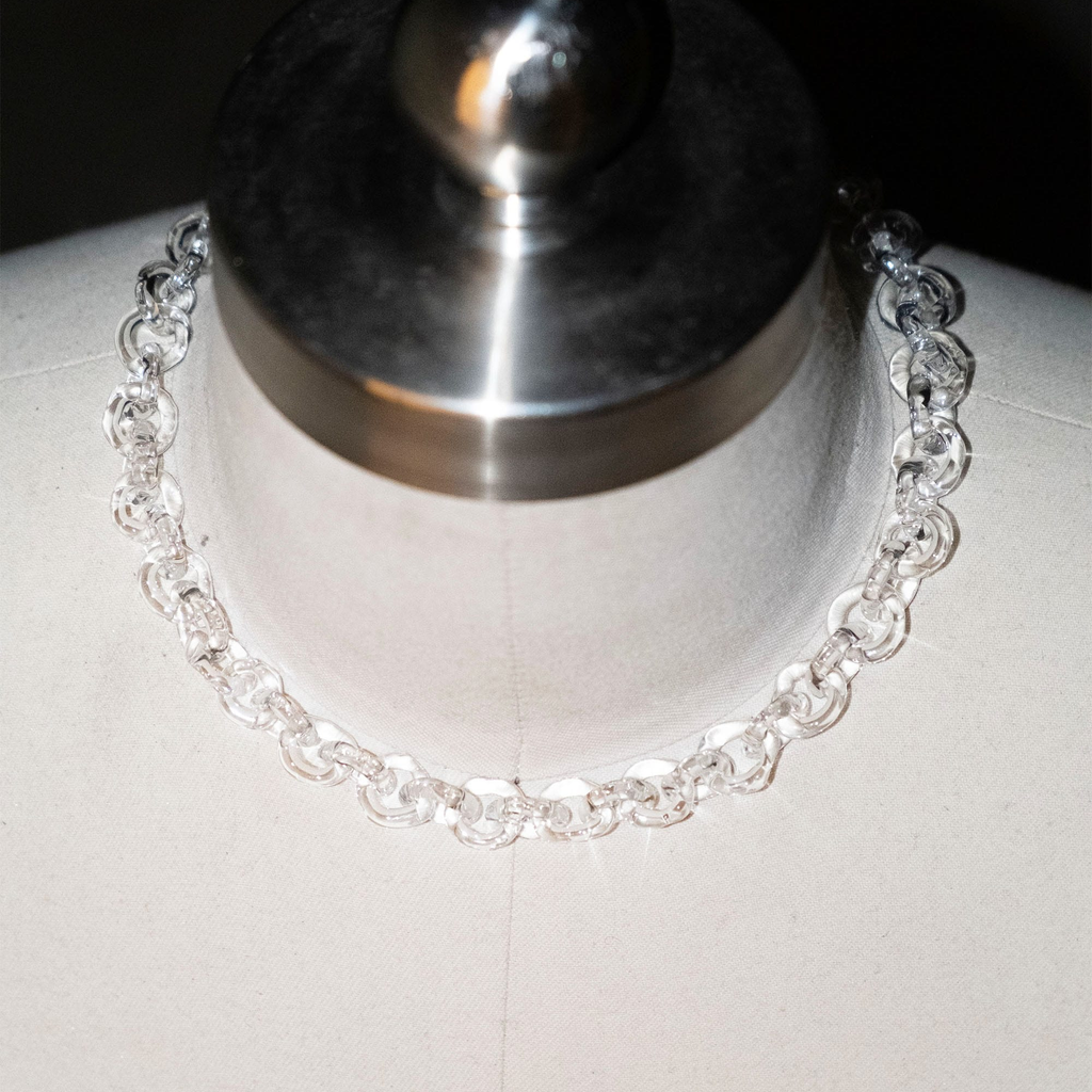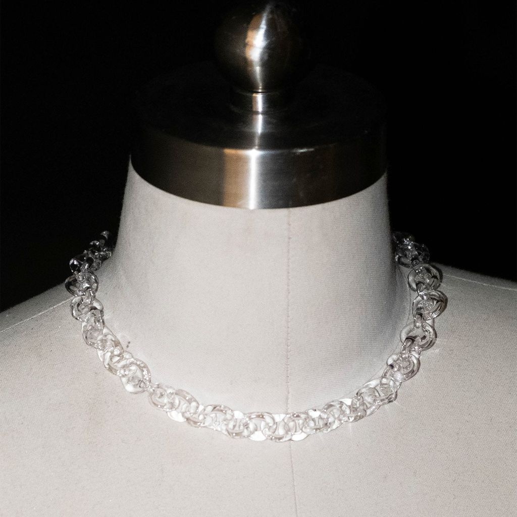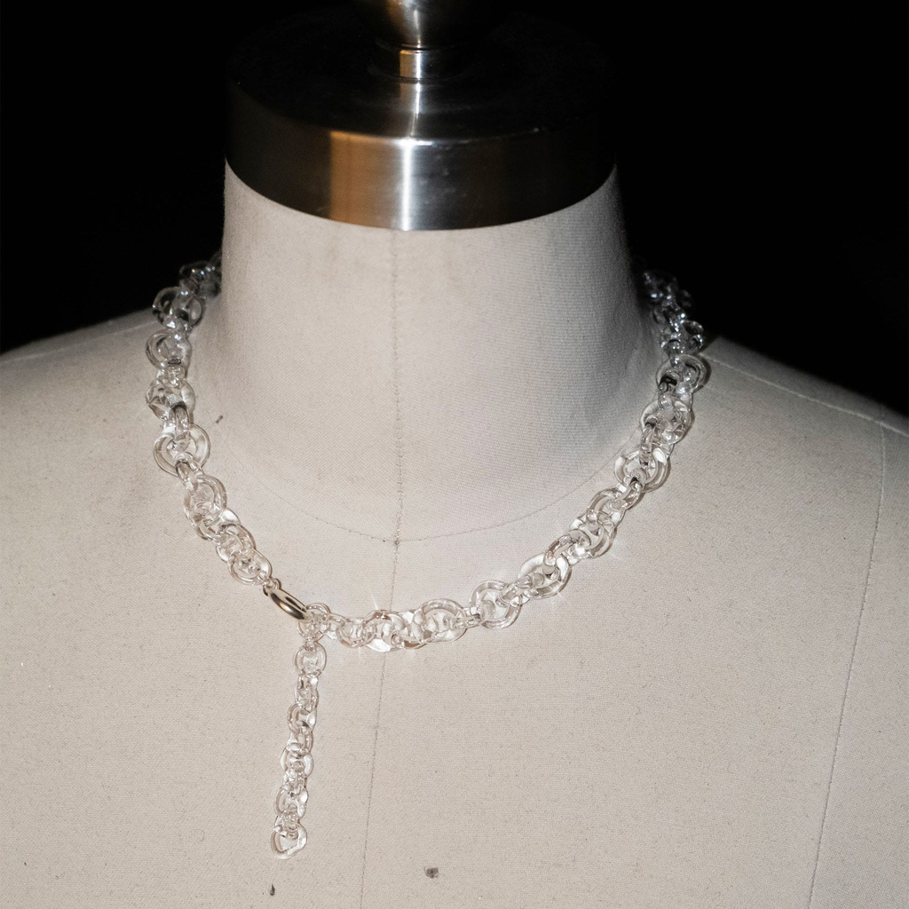 Bold glass chains, handmade from borosilicate glass. Each necklace is crafted with precision and care. The necklace is adjustable in size, allowing it to be worn as a choker or longer piece.