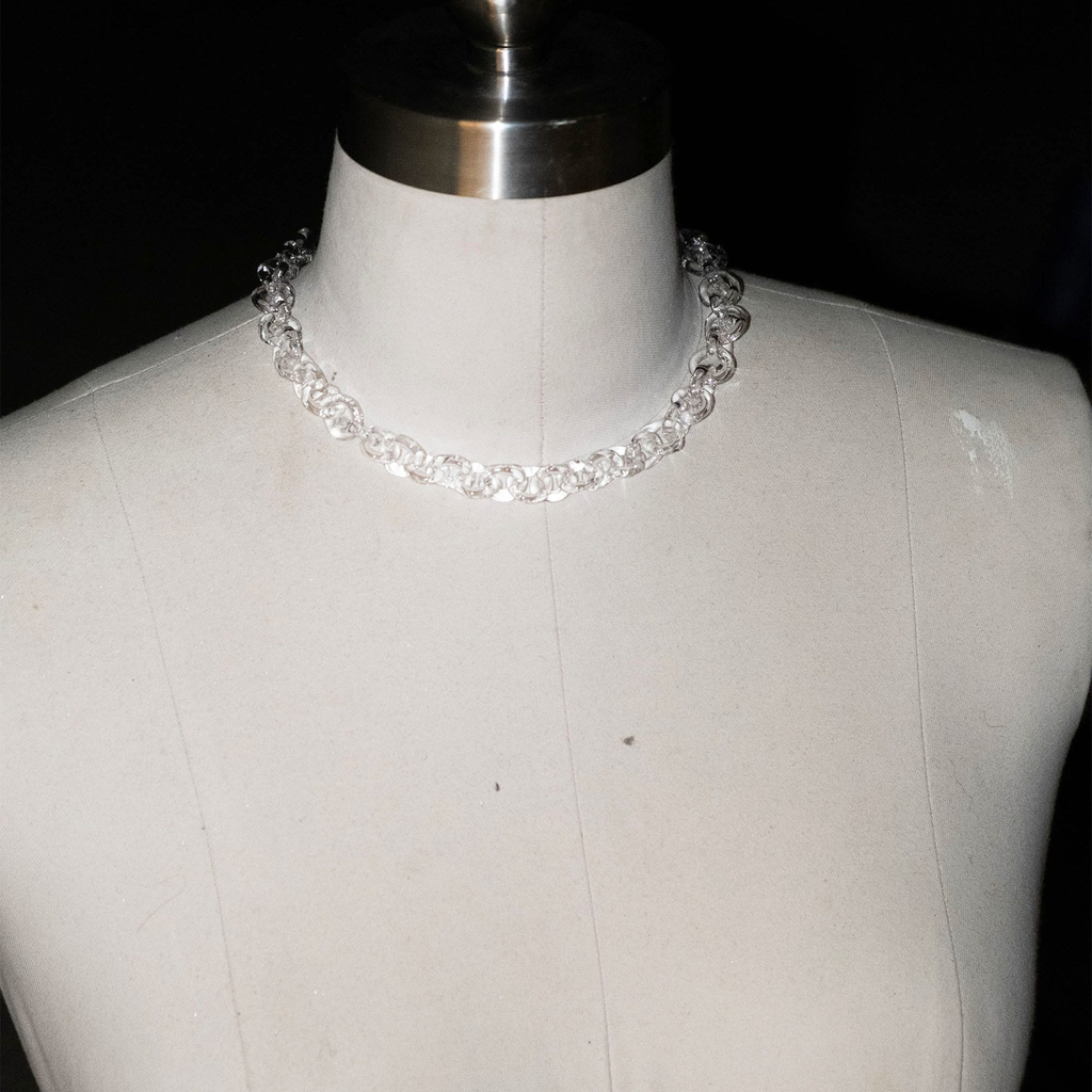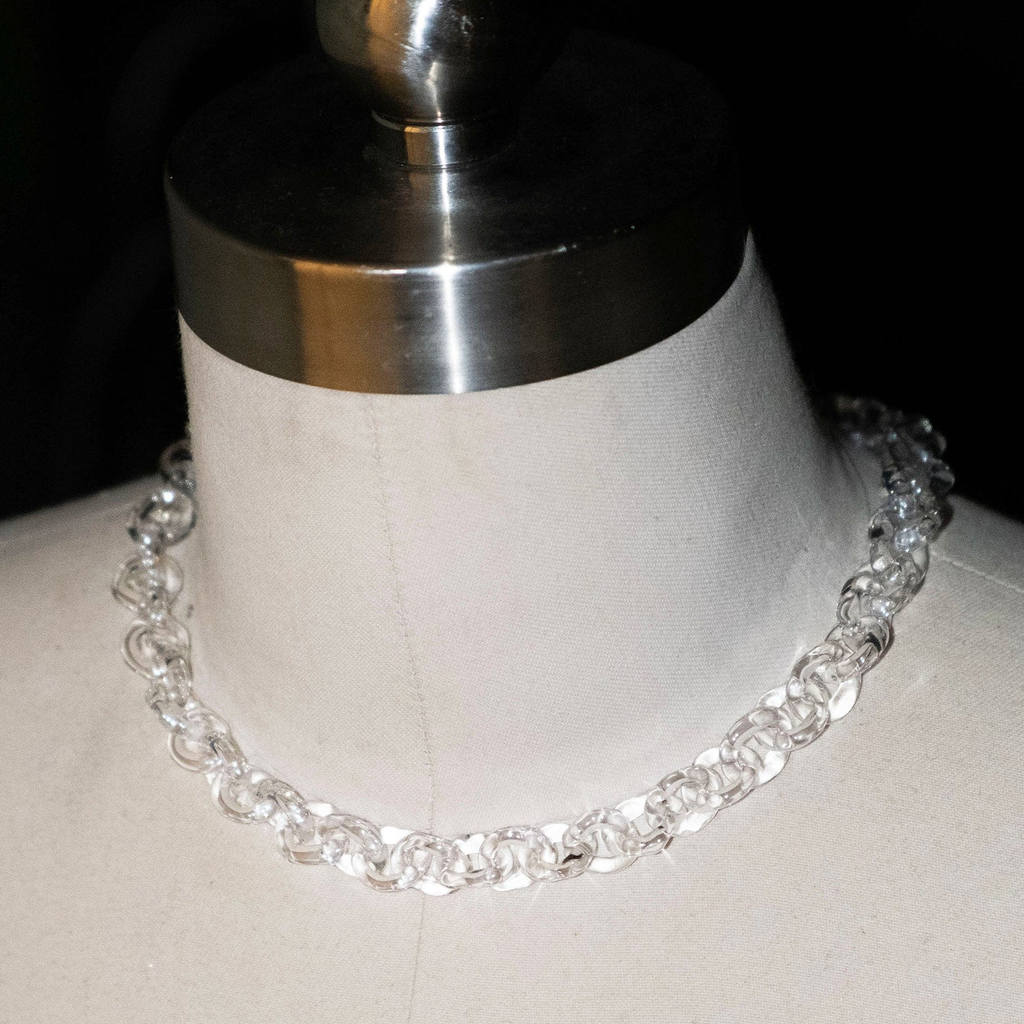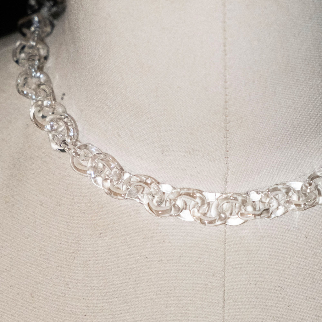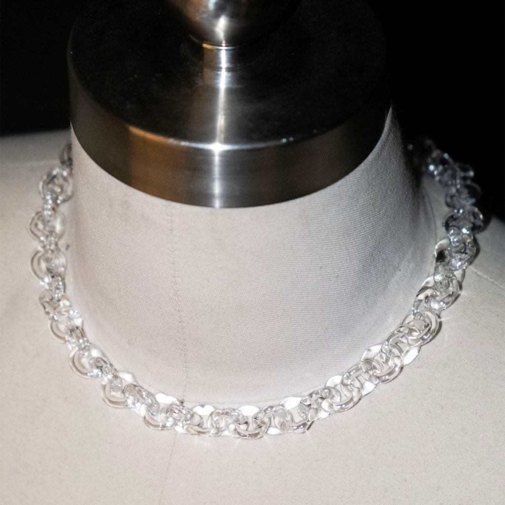 Bold glass chains, handmade from borosilicate glass. Each necklace is crafted with precision and care. The necklace is adjustable in size, allowing it to be worn as a choker or longer piece.