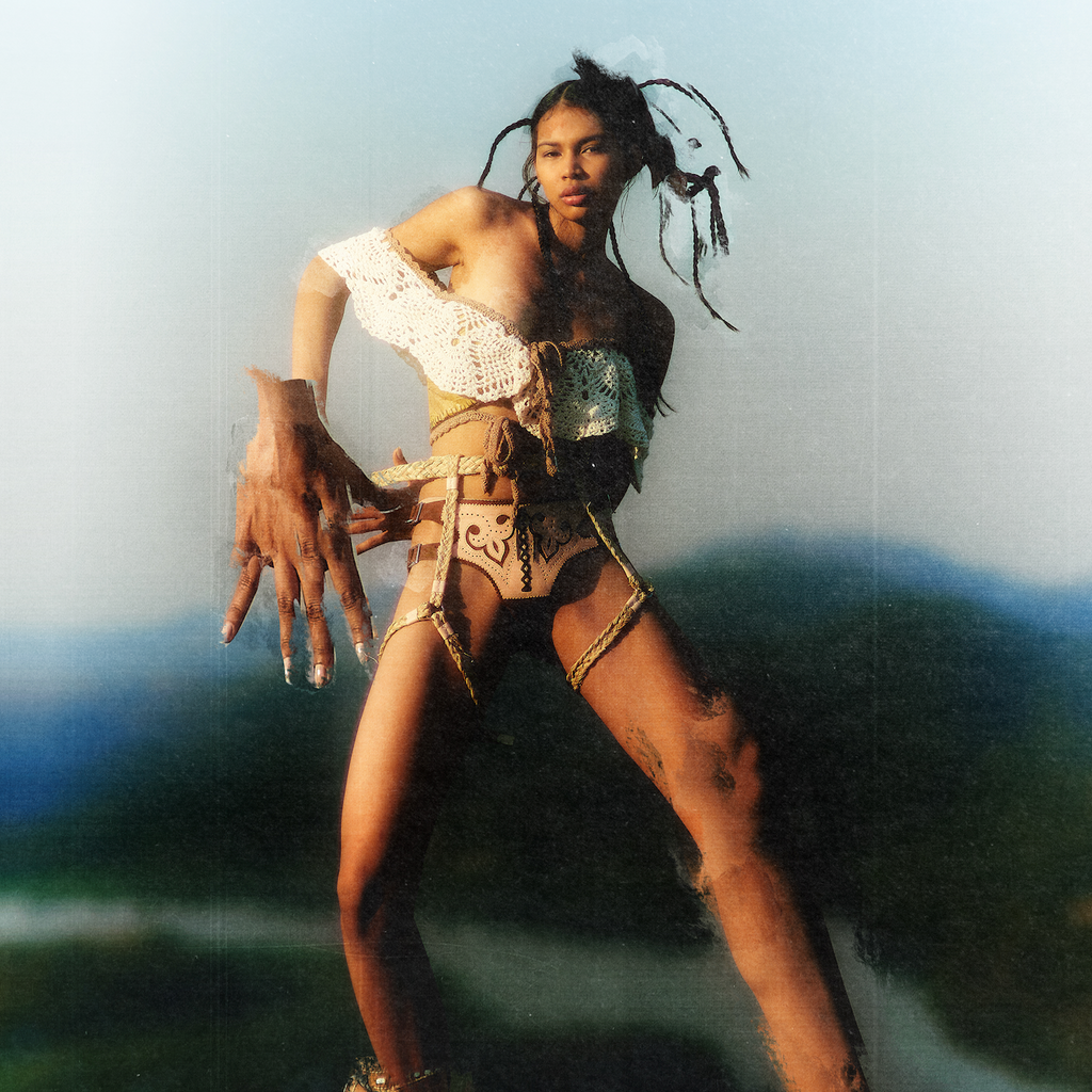 Frontal lace-up top with bolero crochet sleeves. Made of natural Cerrado leaves and recycled cotton.