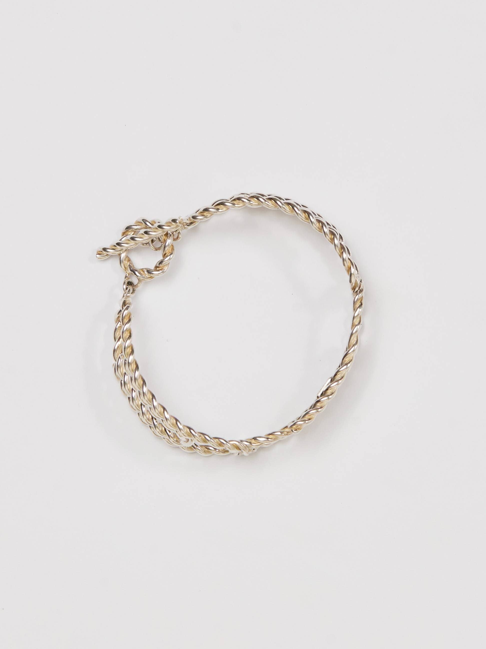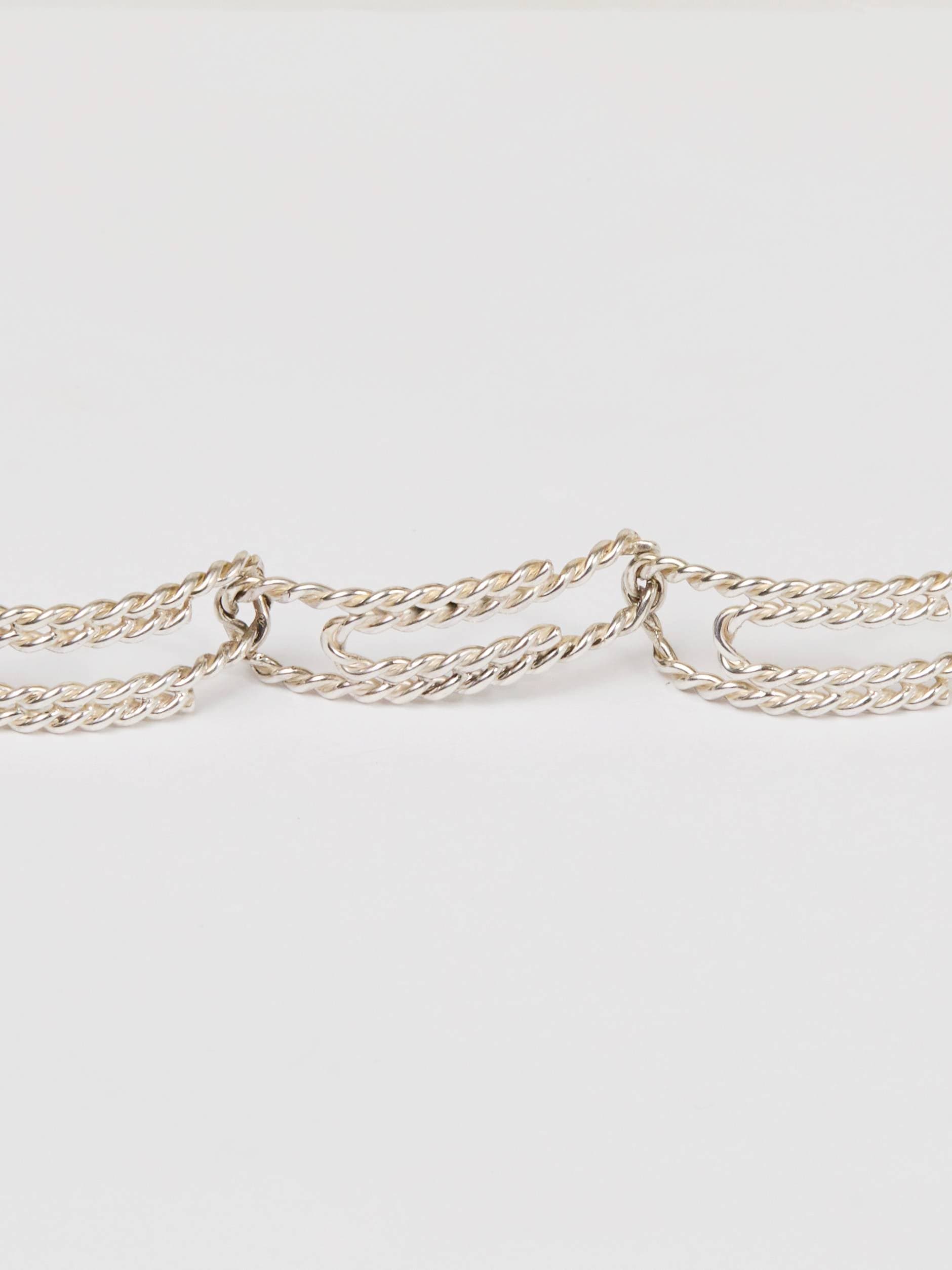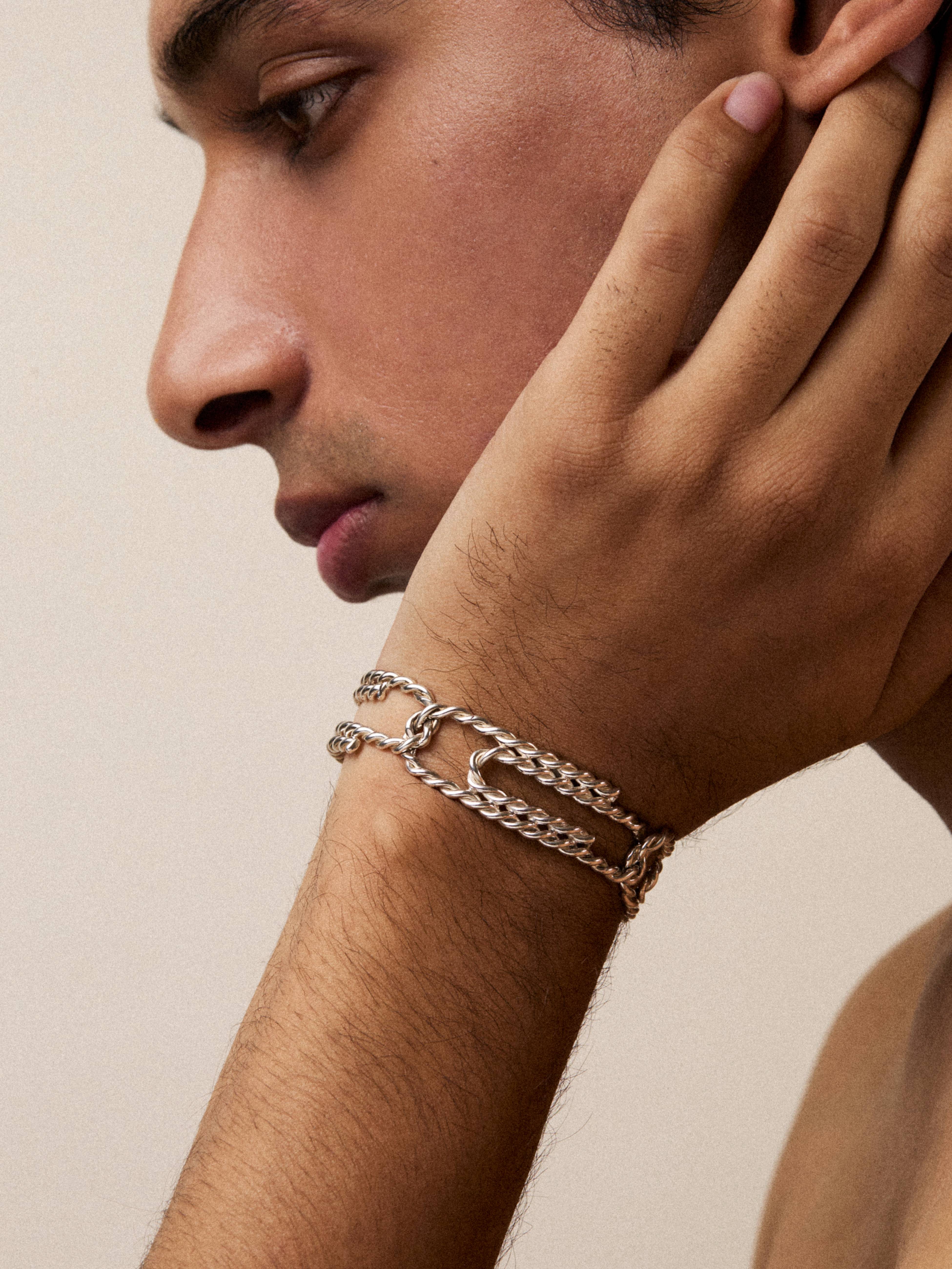 Handcrafted in our studio, the bracelet features silver wire that is carefully pulled and twisted to form a braided design. This braided wire is then shaped into three interlocking paperclip-like links, all connected seamlessly through a hand-forged silver lock. Drawing inspiration from the manipulation of metal in wrought iron window grills and the texture of old rope chains, this piece transforms the simplicity of a familiar shape into something meaningful.
