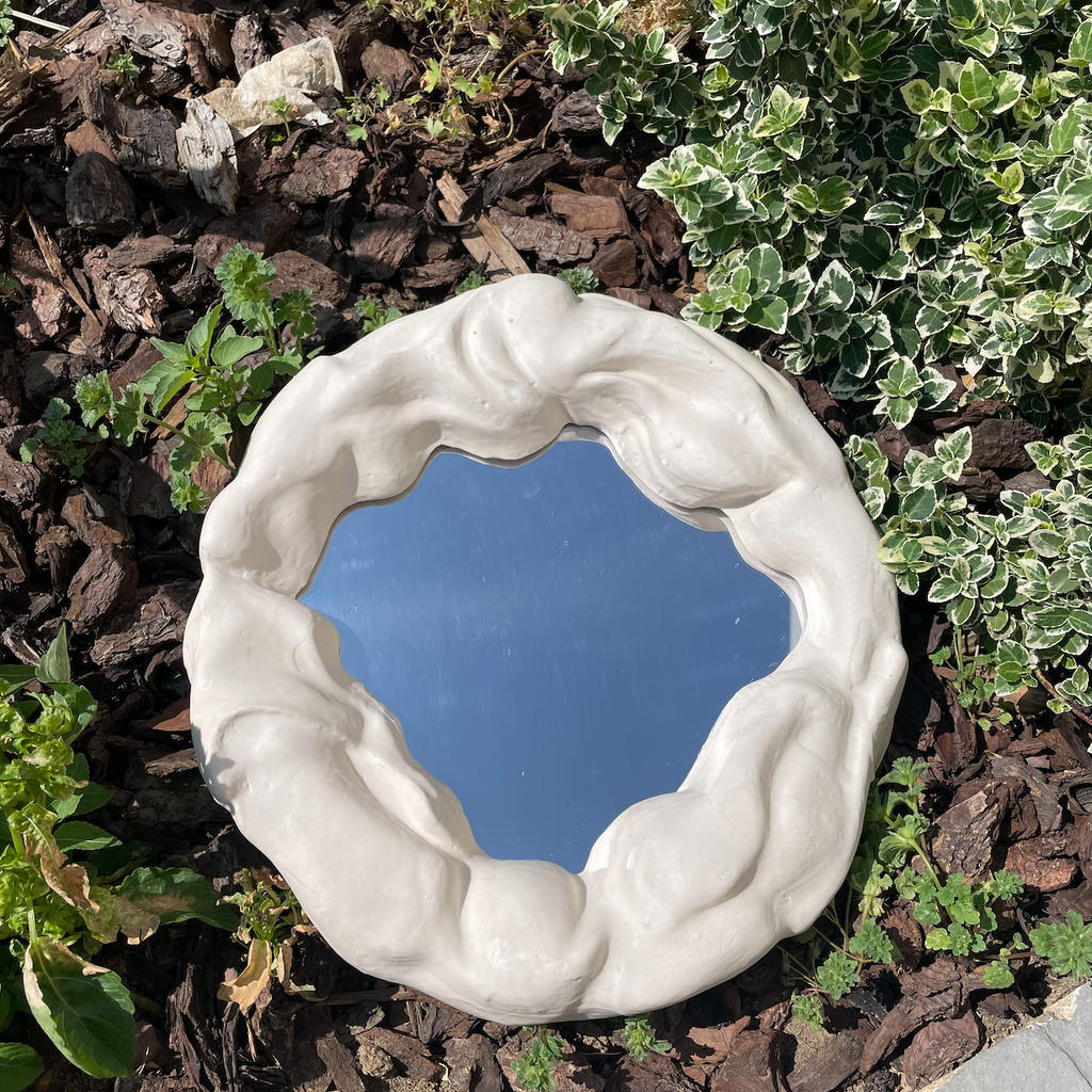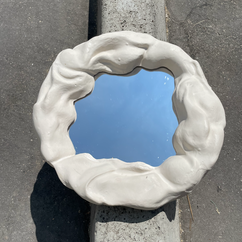 3D sculpted resin mirrors with slightly deforming glass, they come with a system attached to their back to be displayed on a wall. Each piece is unique due to its singular glass deformation.