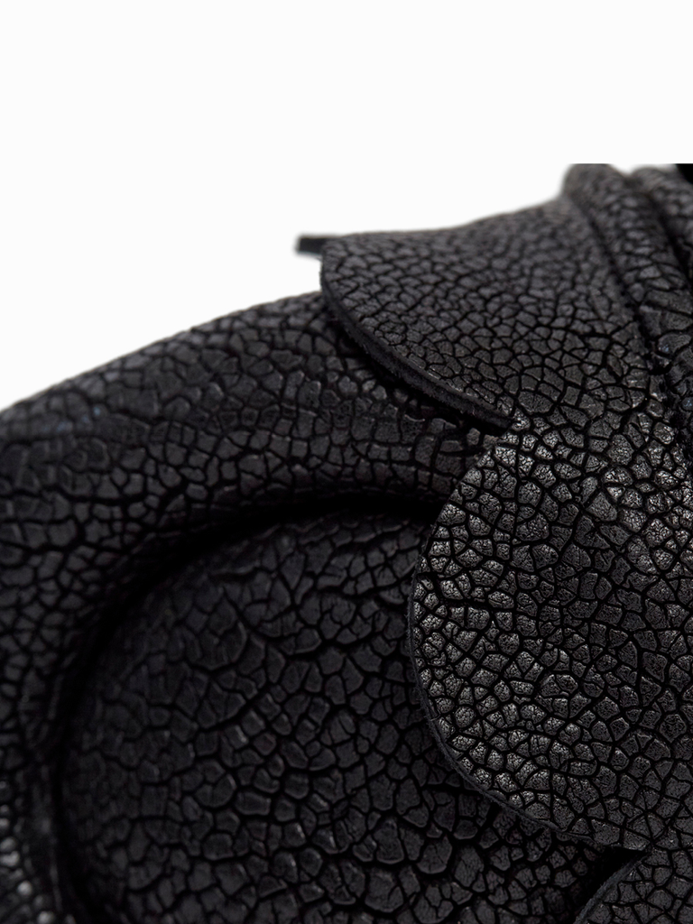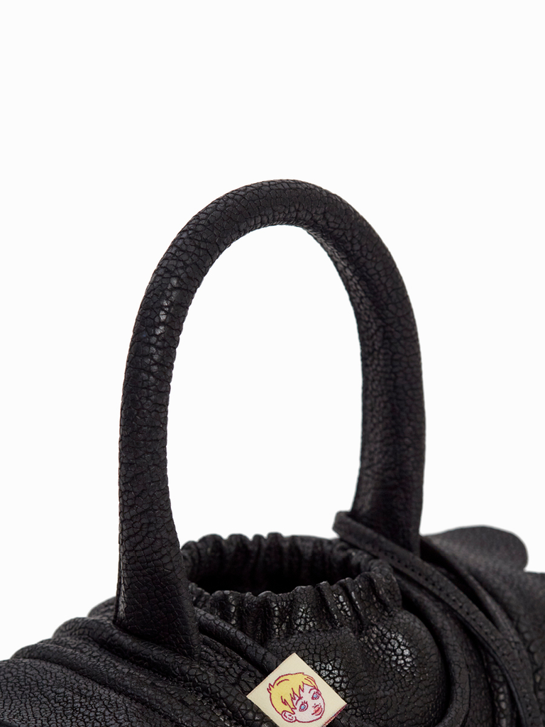 Thick black cow leather with pigskin lining and all-leather handle. Slightly elastic opening. Made by hand. Heavyweight leather, cracked and generously waxed. This is a limited-edition leather and only a handful of Black Cherries will be made.