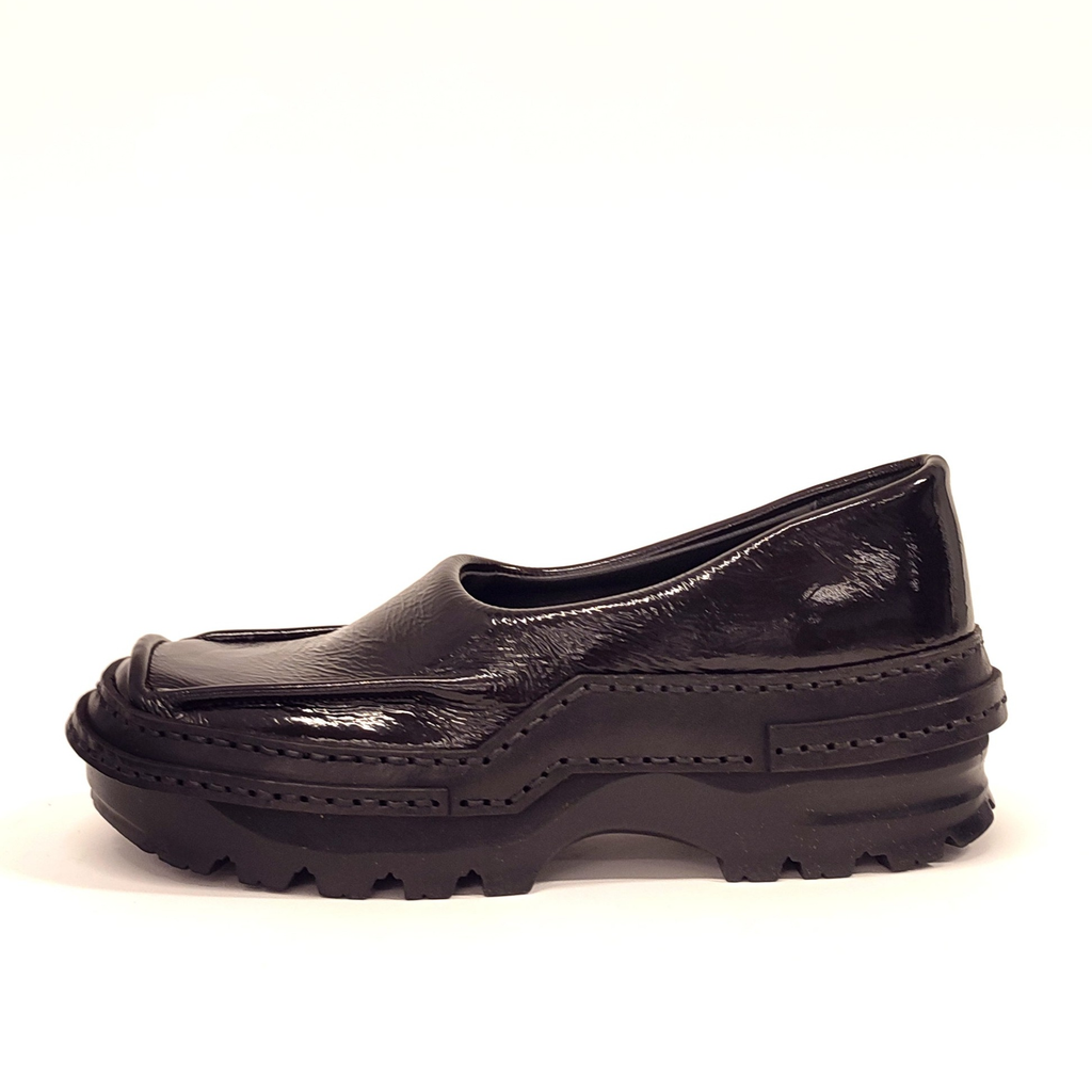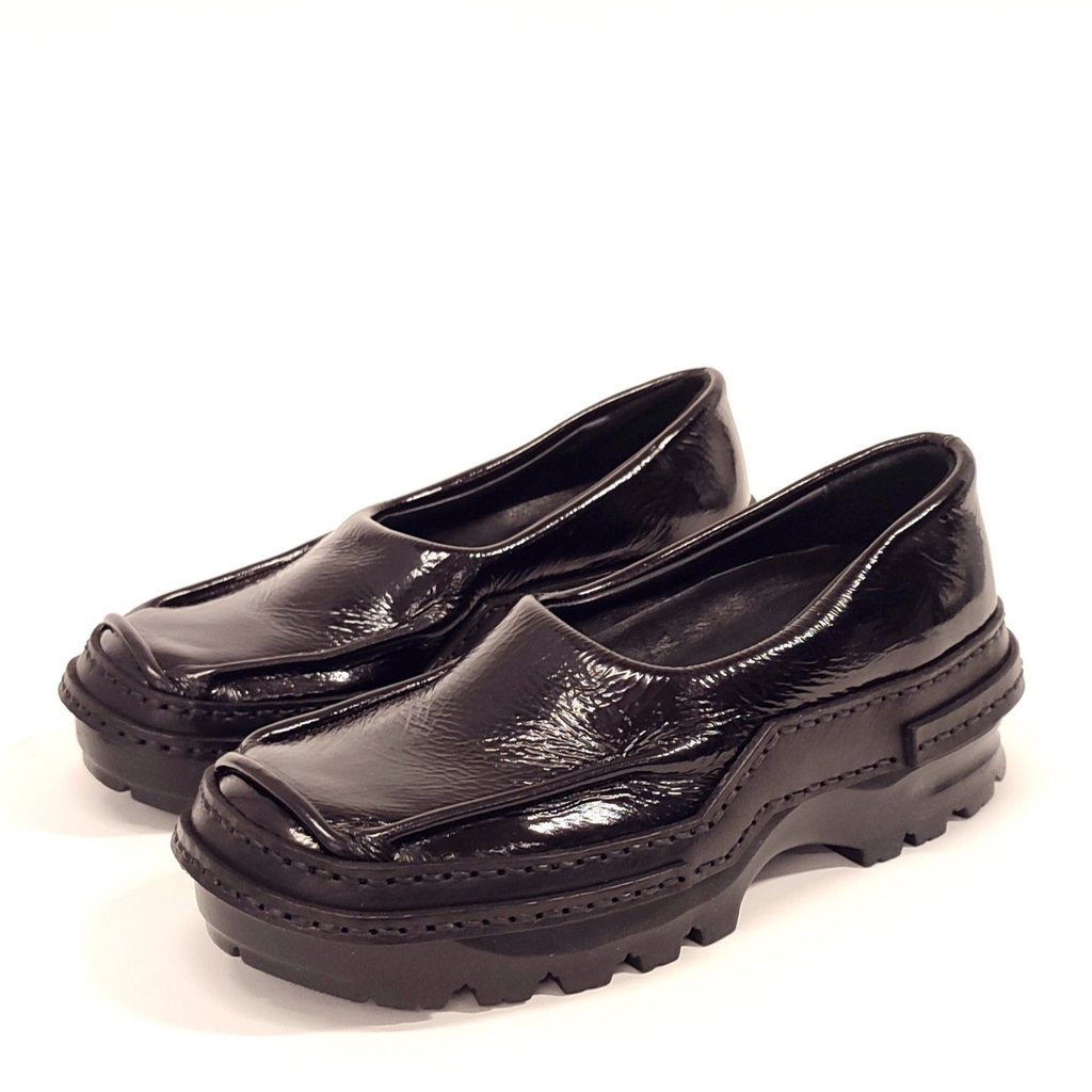 black moccasins in patent leather
