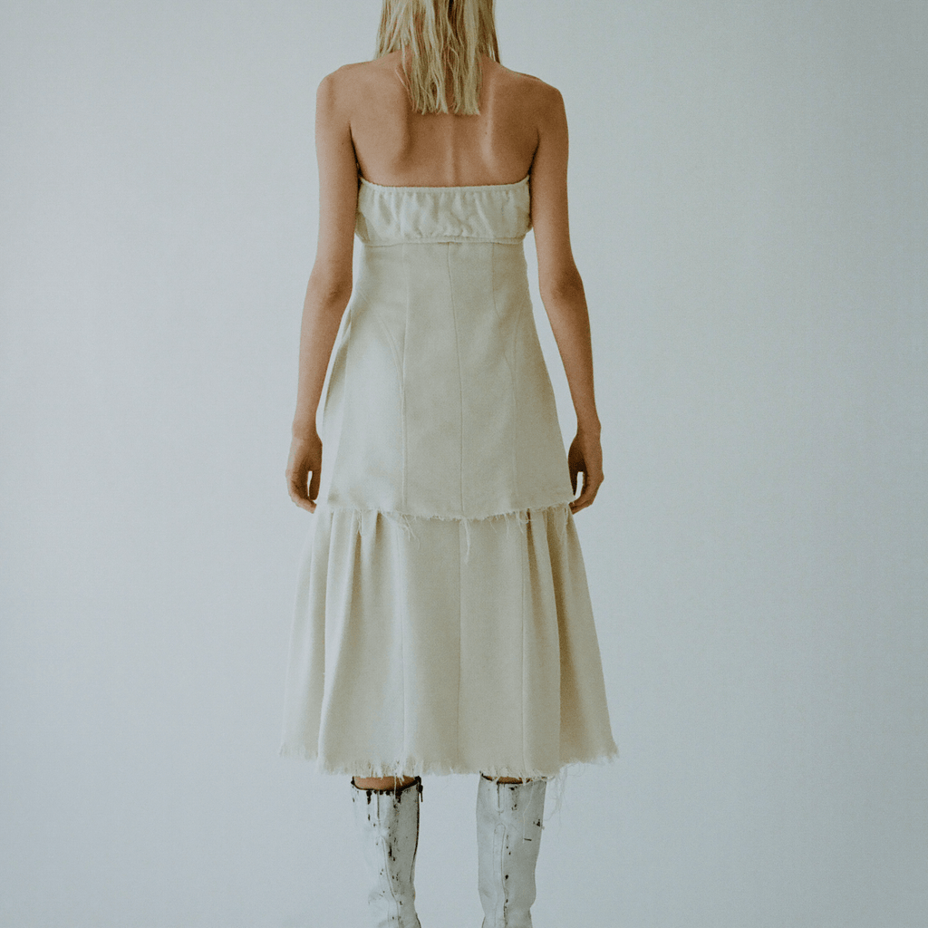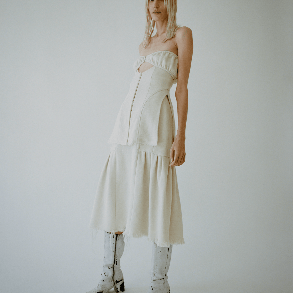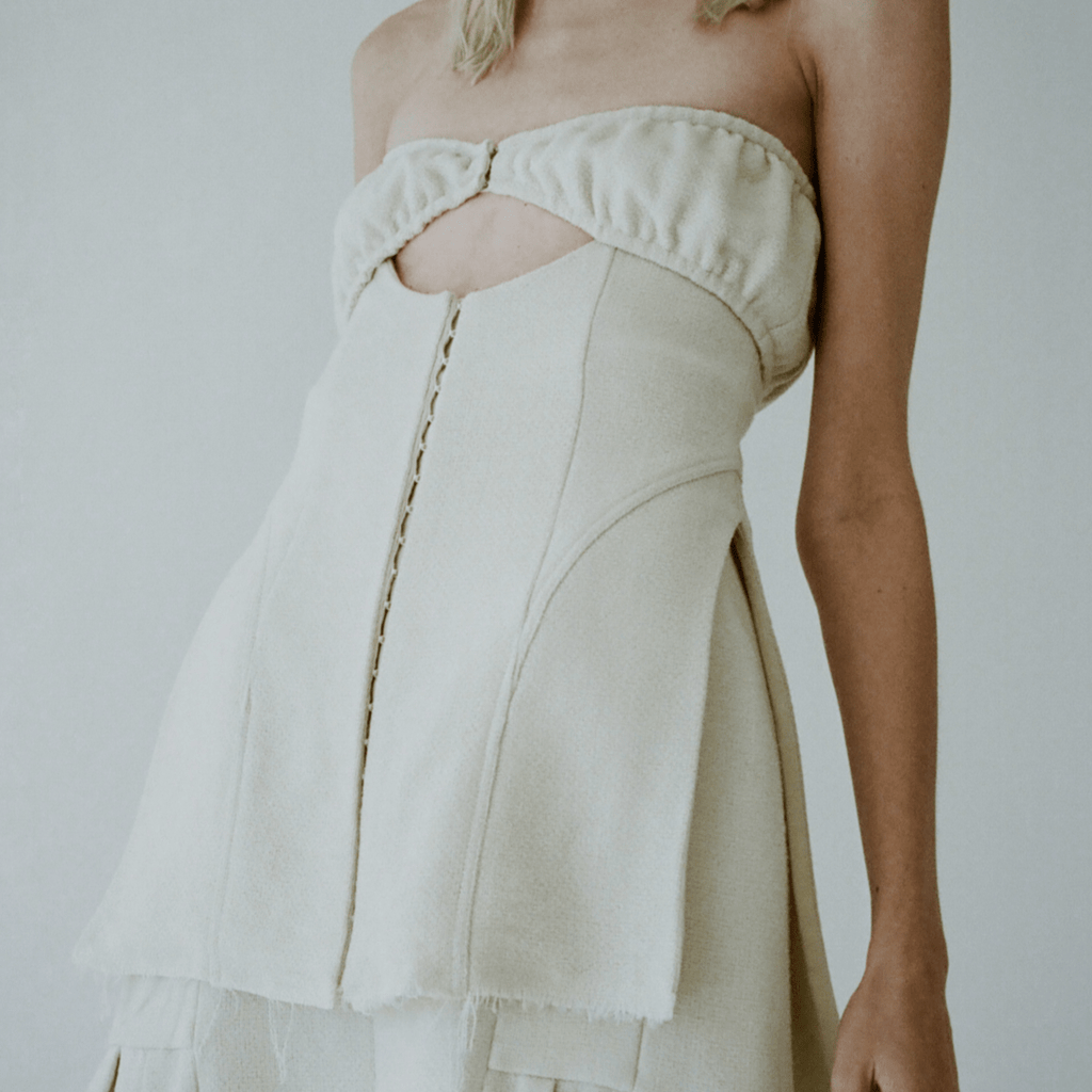 Elena Velez women's wool corset top in off-white. This top is sleeveless and features a cutout at the torso. There is boning detail throughout the body. Note: Top is styled with bodysuit underneath.