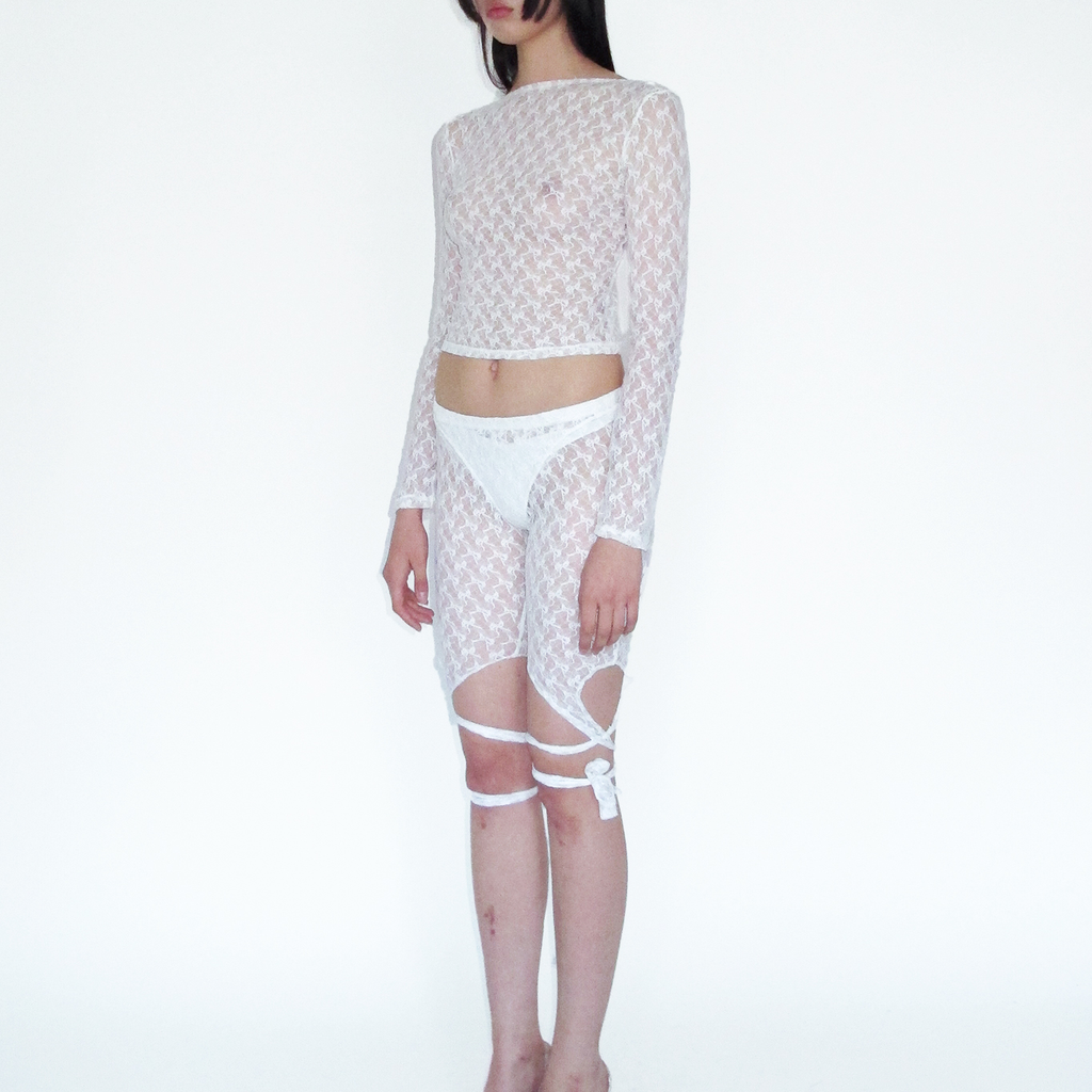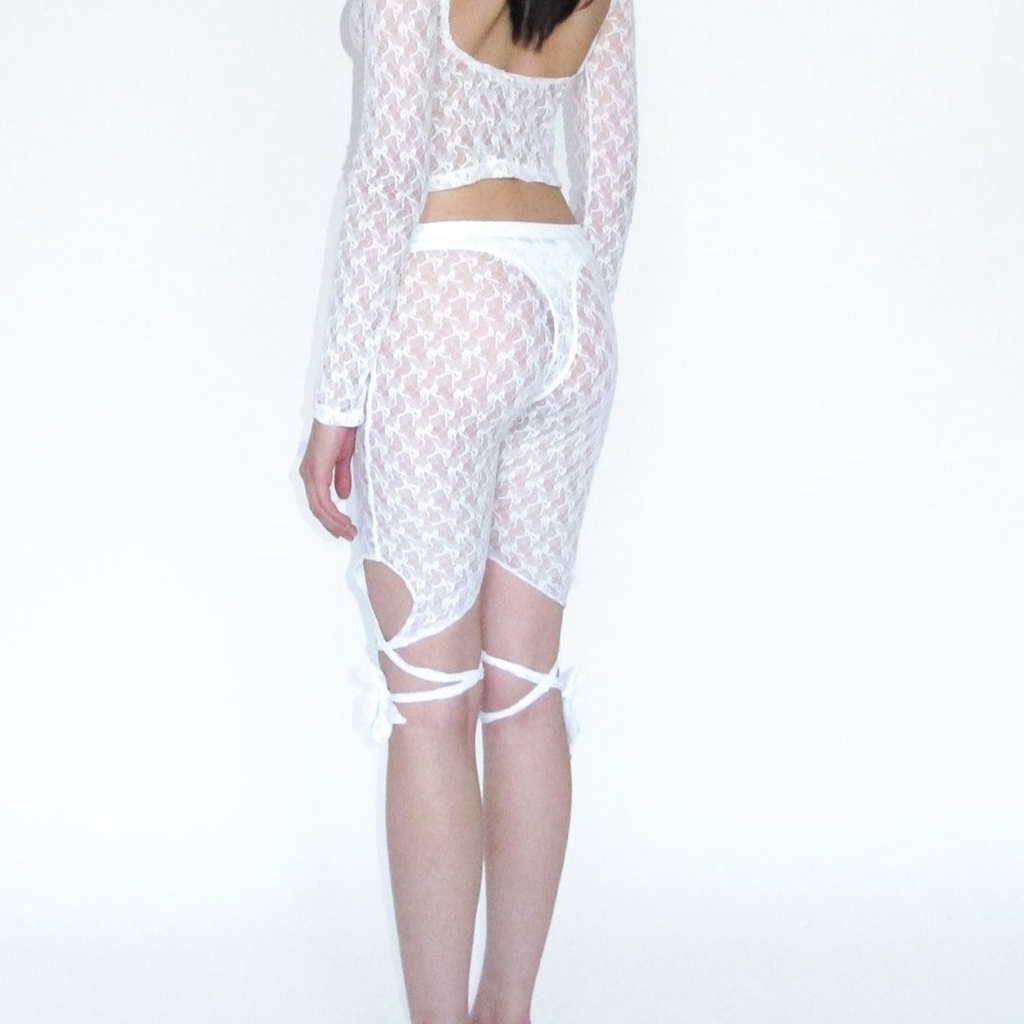 White lace leggings with thong stylelines and tie detail. elastic waistband.