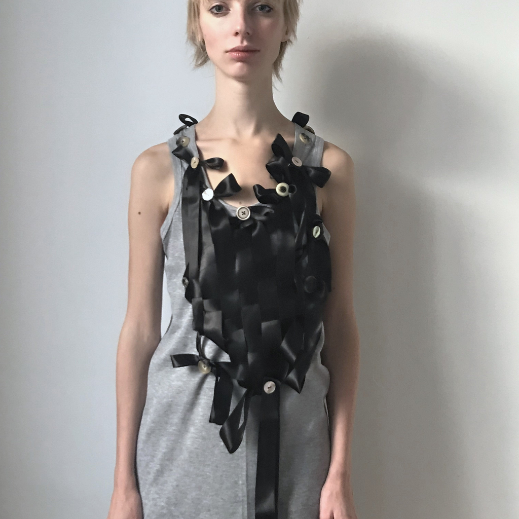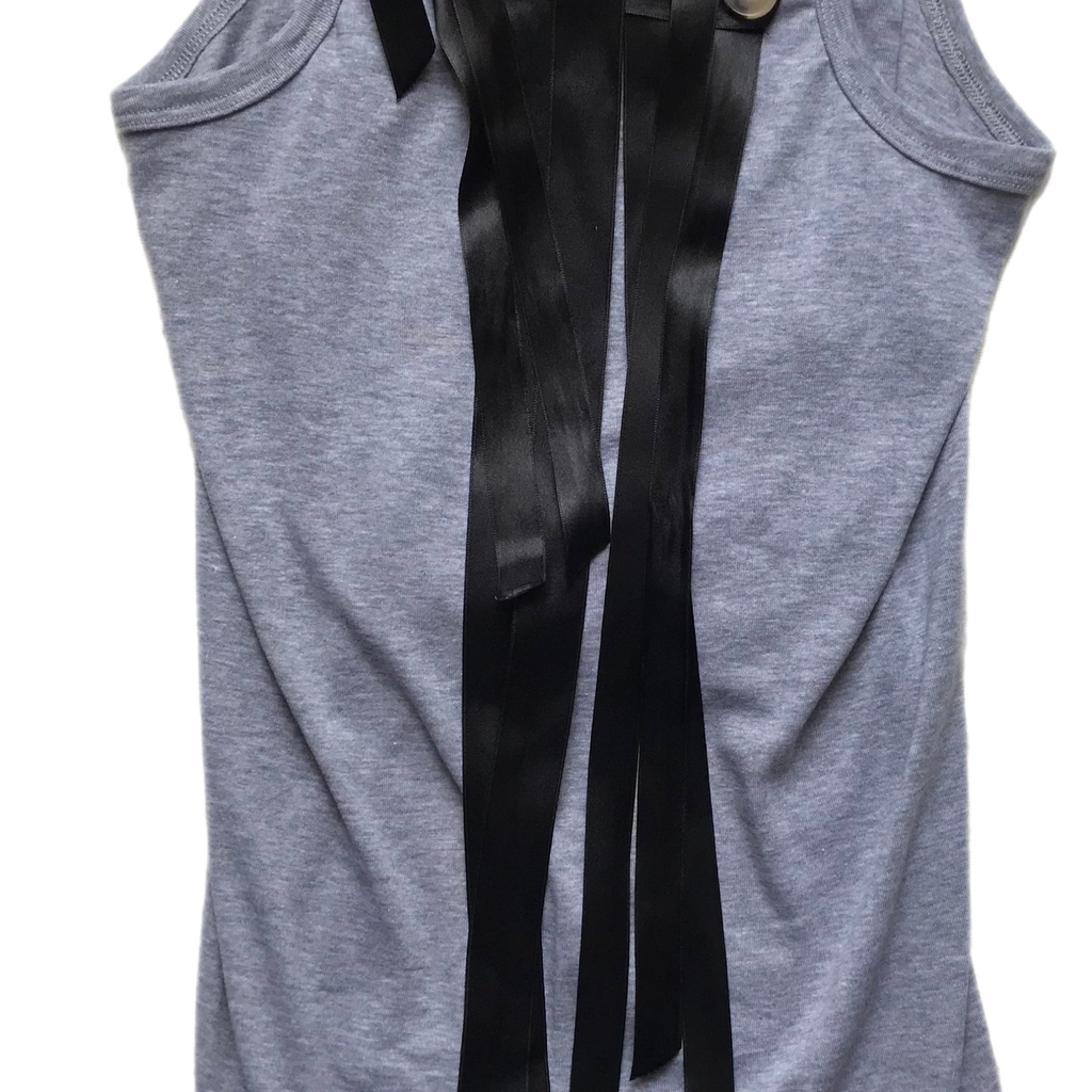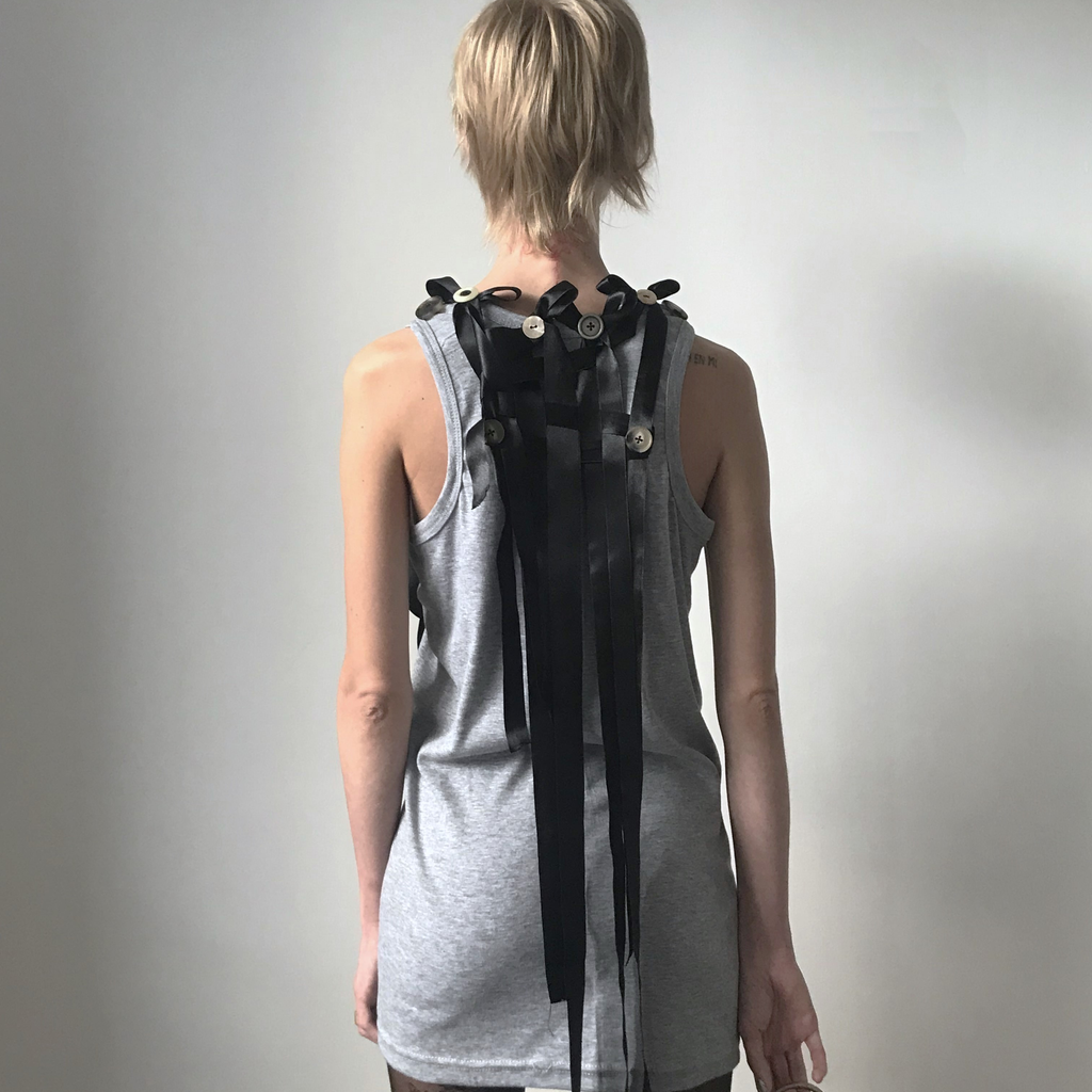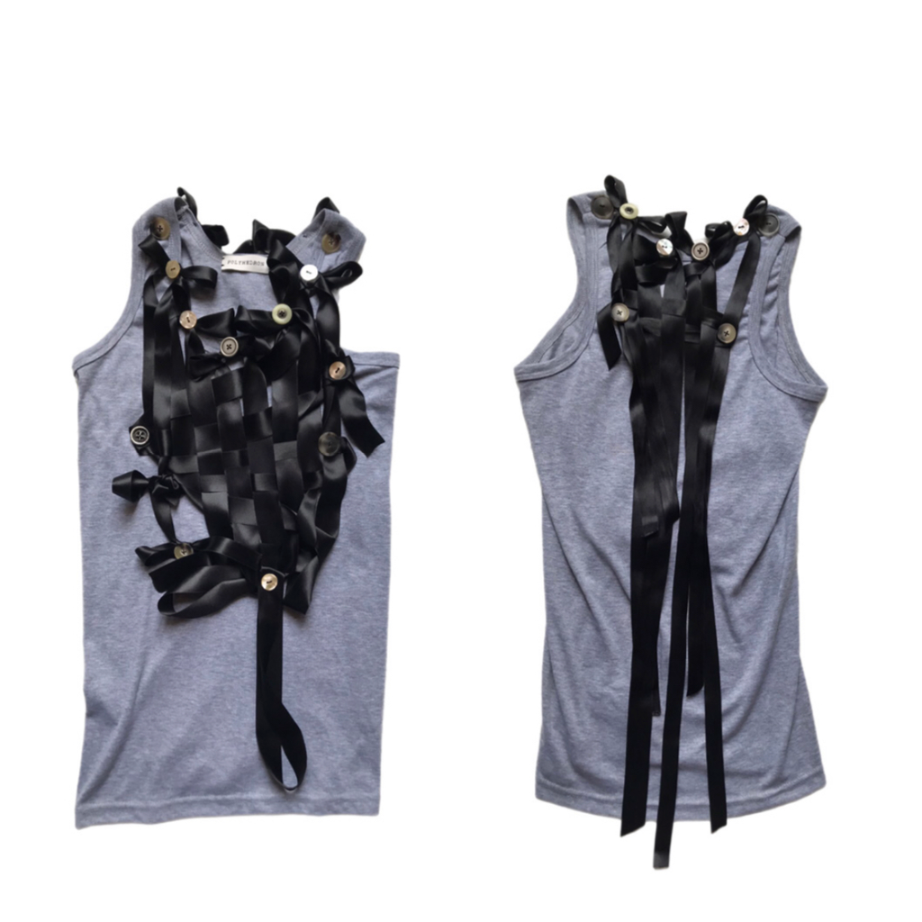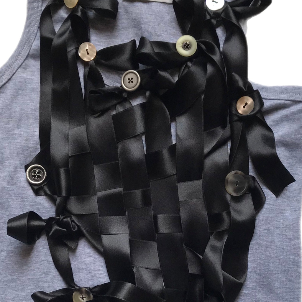 A jersey cotton top from the Thin Air collection featured with woven details made of atlas ribbons and various buttons.