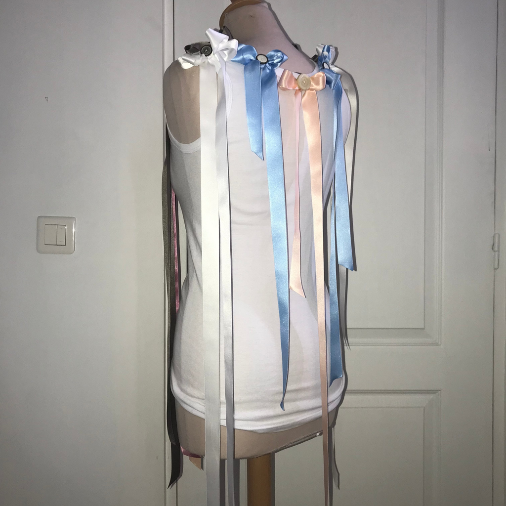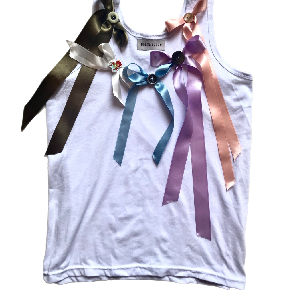 A white jersey top adorned with various atlas bows and buttons on the collar.