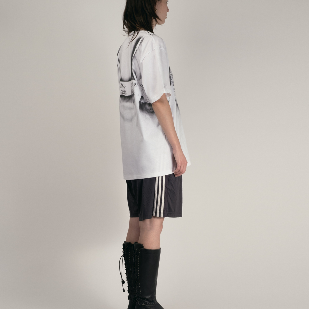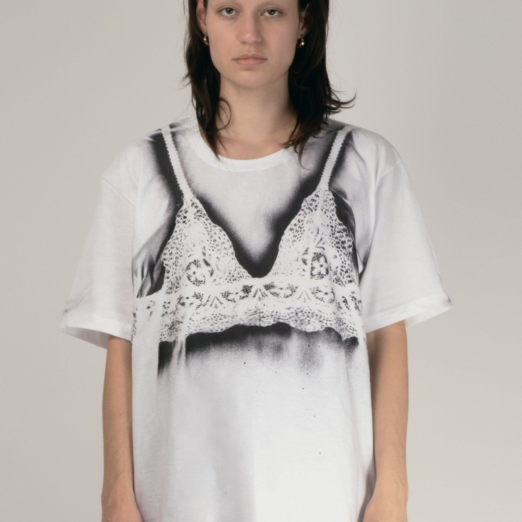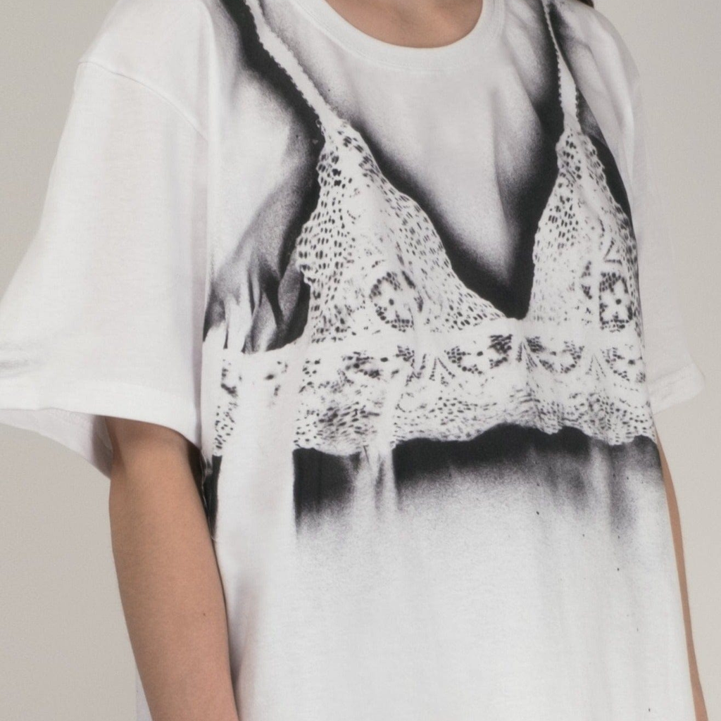 Deadstock t-shirt spray painted individually with vintage bra in the Paris atelier.
