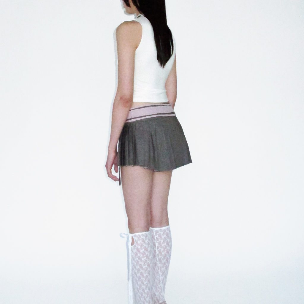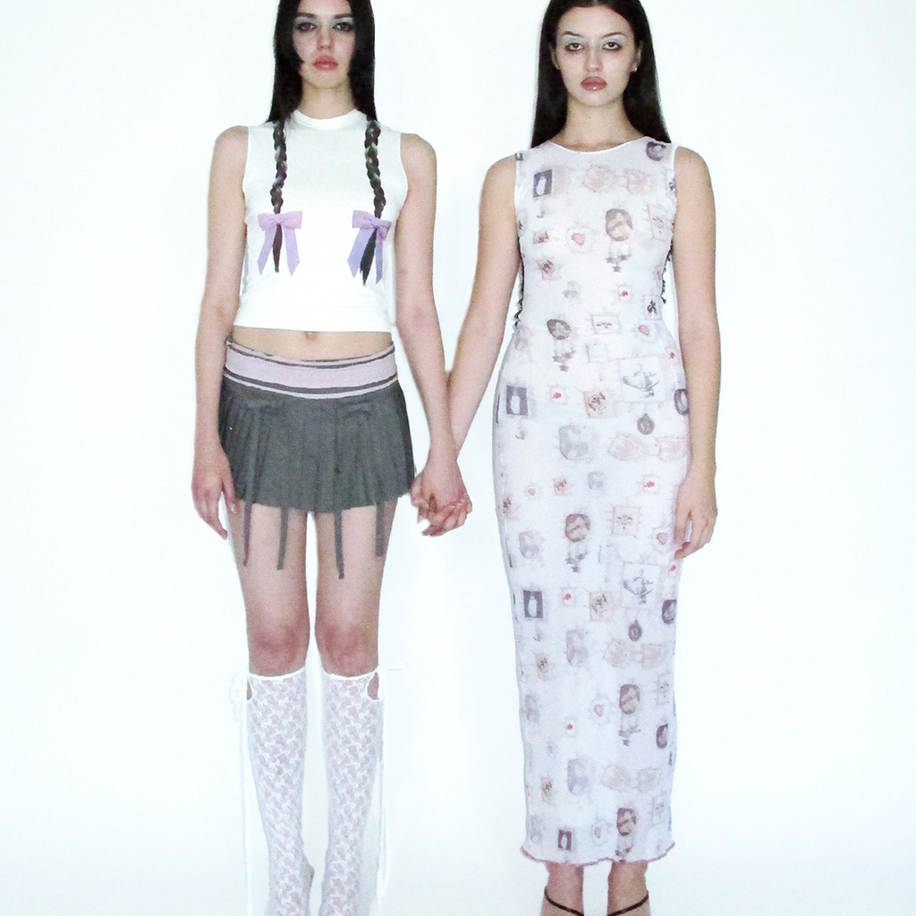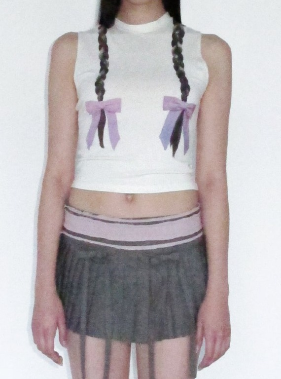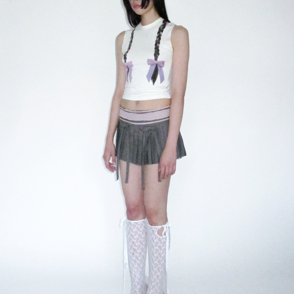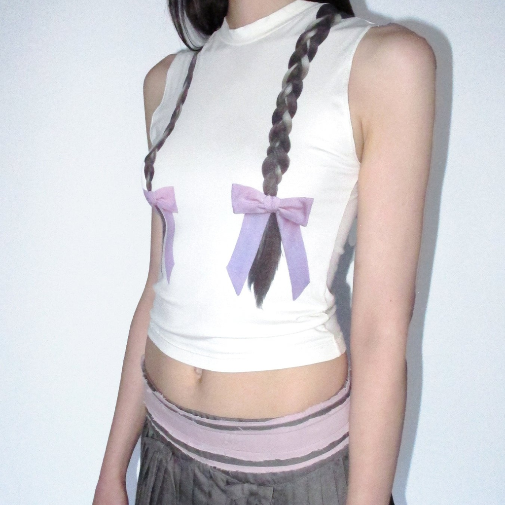Creme jersey tank top featuring digitally printed braid and bows print.