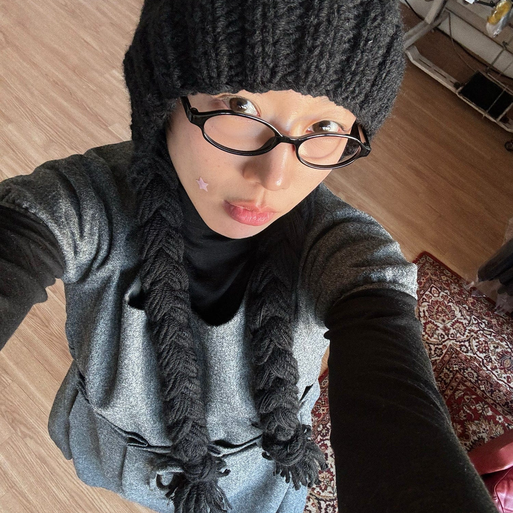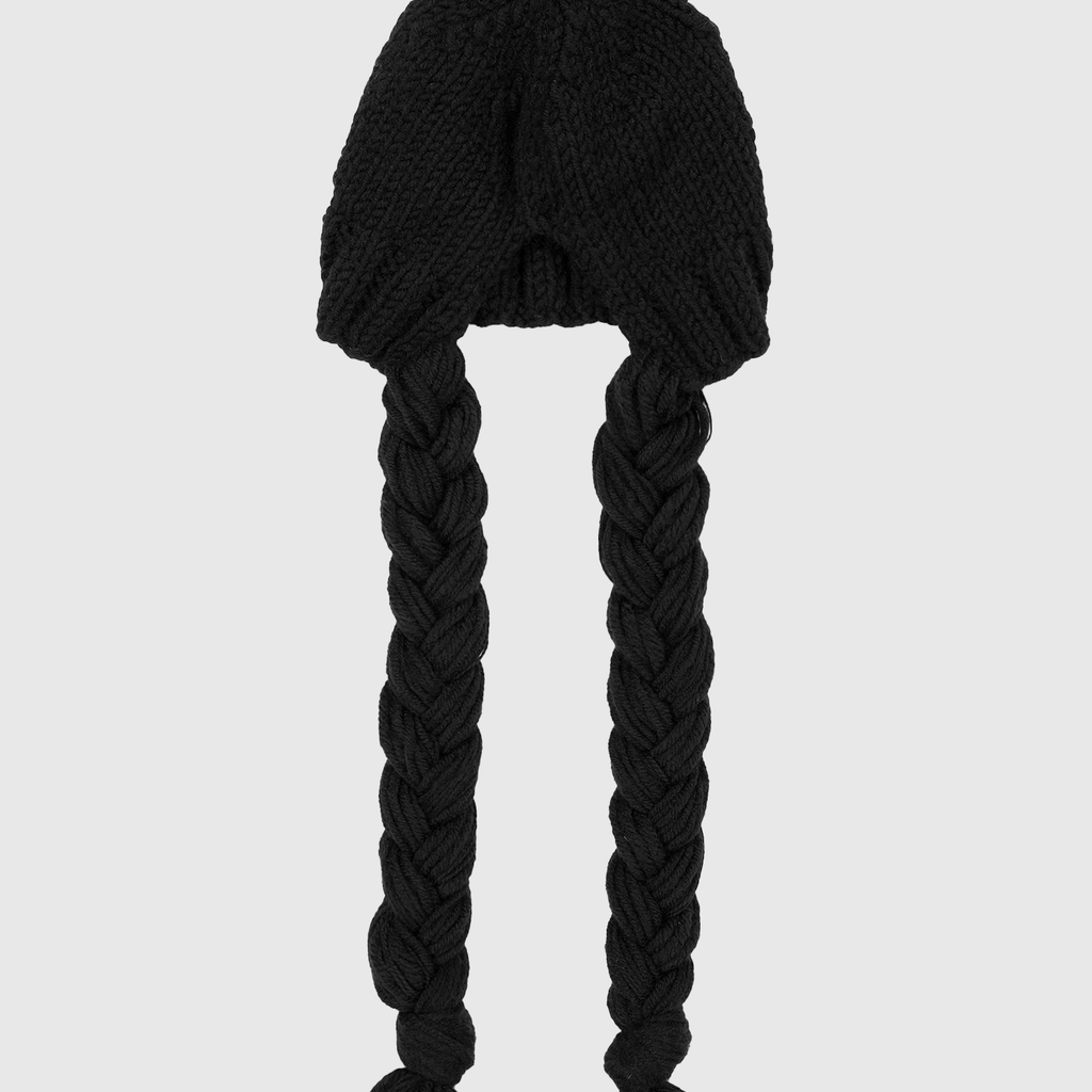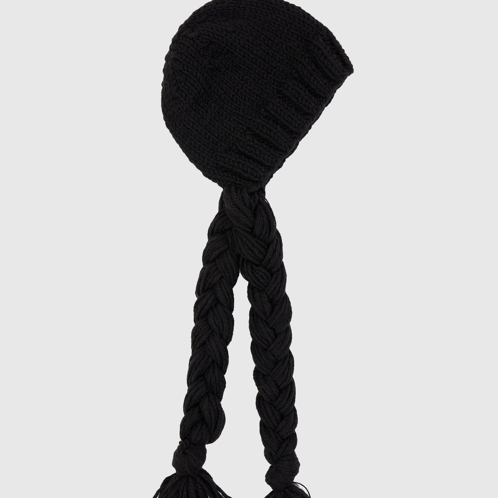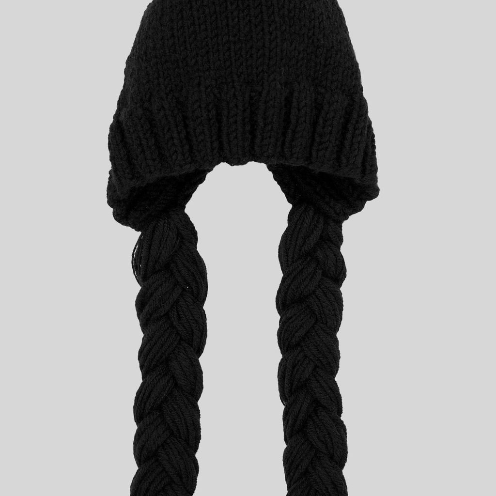 This unique beanie is entirely hand-knitted by artisans, featuring two braided extensions that drape playfully like pigtails. When worn, it gives the illusion of braided hair, blending warmth with character and charm.