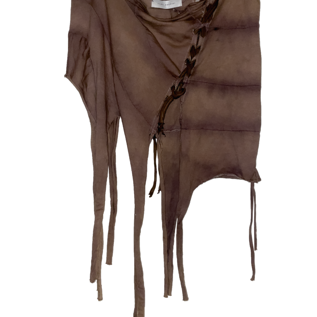 Textiles and tactics find new harmonies through the work of Jules Bramley, replicating natural uniqueness and earthly splendour. This capsule is an exploration into rebirth and transformation. Featuring organic textures, deconstructed shapes, drapery and asymmetrical features. 100% wool fabric is manipulated through deconstructing, felting and sewing with some pieces dipped and coated in natural rubber latex.