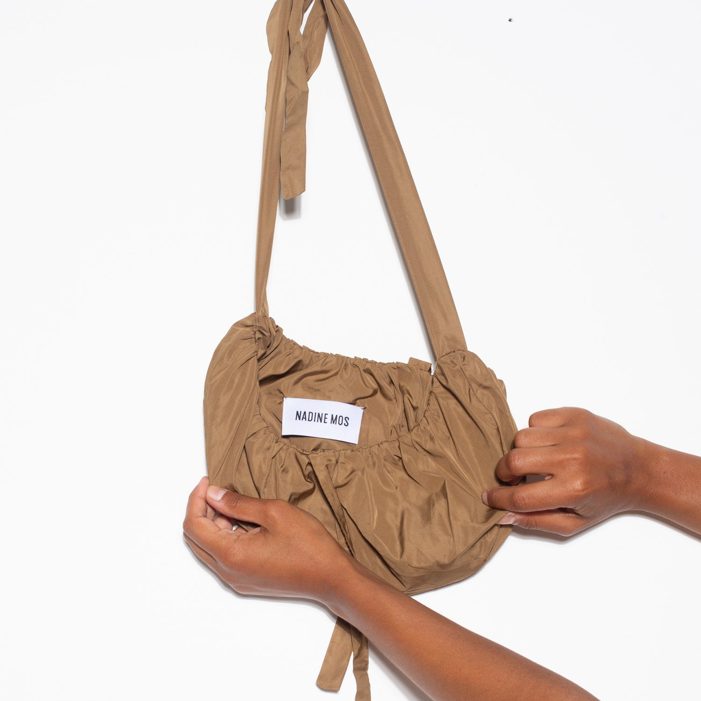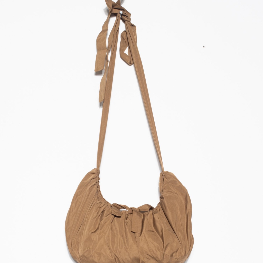 The shape is reminiscent of a croissant with the gathered detail and boat-like body of the bag. The straps are knotted and can be adjusted to your liking.