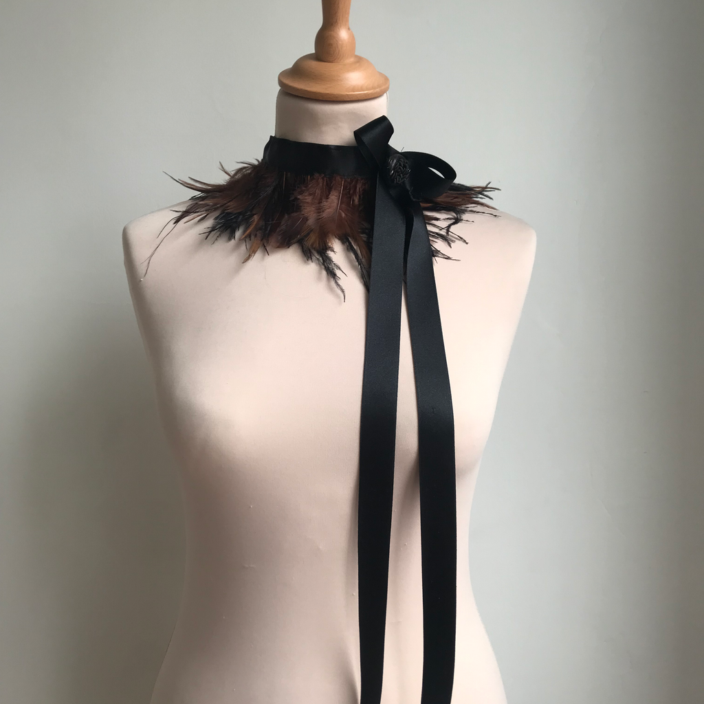 A ribbon neckpiece featuring two layers of real feathers, embellished with a bow and an antique hand-made button. One size fits all.
