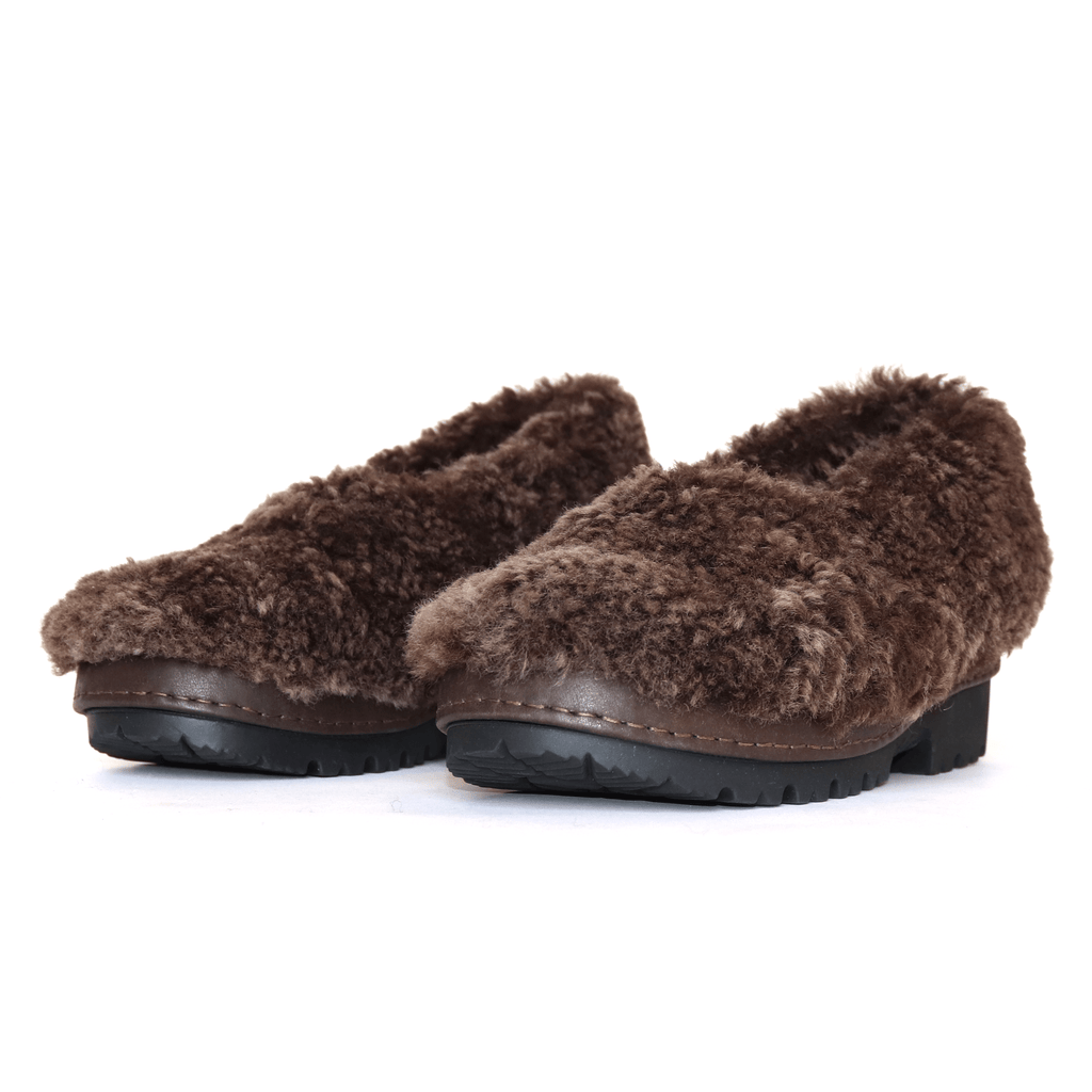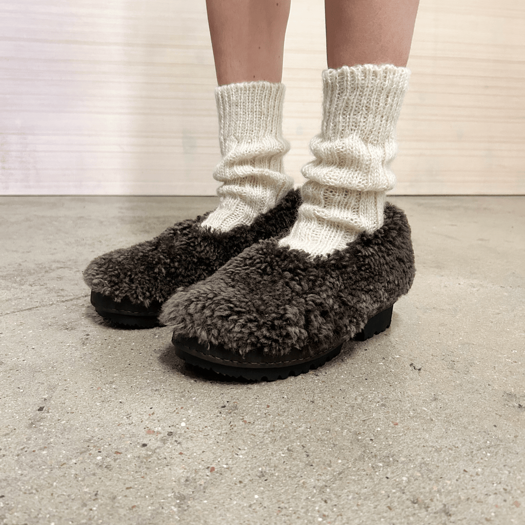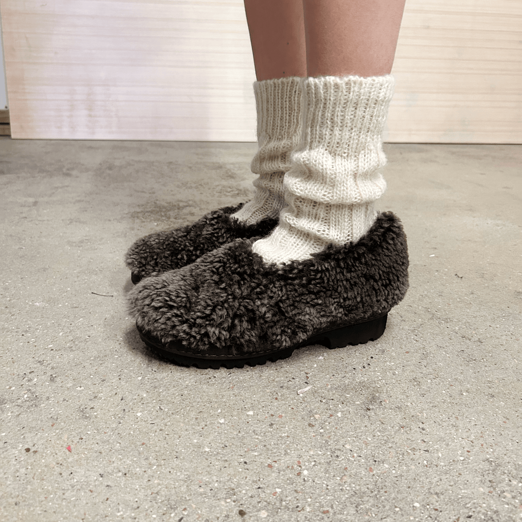 The upper of the shoes has been made with deadstock/discarded sheepskin. The industrial rubber sole unit features a leather band, also made from discarded leather. This band holds together the sole and the upper with two rounds of hand stitches. The lining, crafted from discarded leather, ensures durability. The total height of the shoes is around 5 cm. They are finished with a branded leather insole, providing added comfort and style.While we aim to produce orders using the same sheepskin as shown in the pictures, minor variations in color and hair length may occur due to the nature and source of the material. As we use deadstock, there may be slight differences between them.