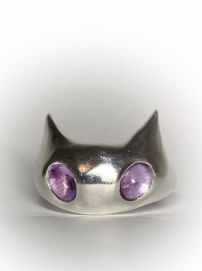 Recycled sterling silver kitten ring with two amethysts.