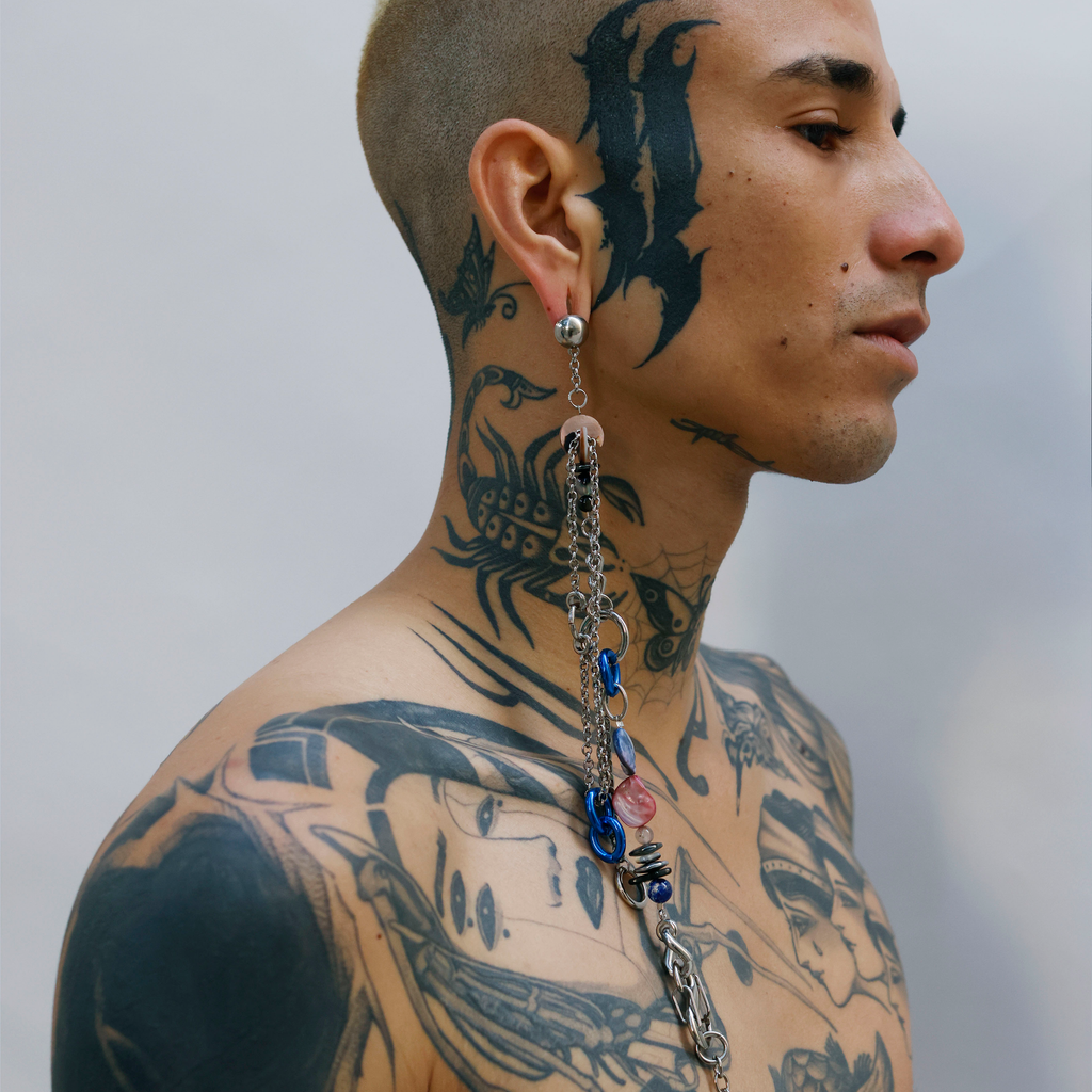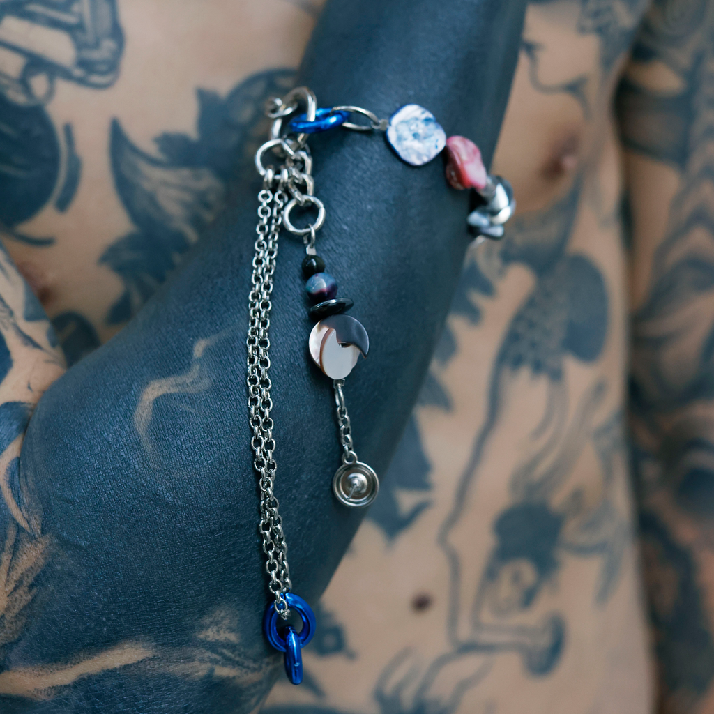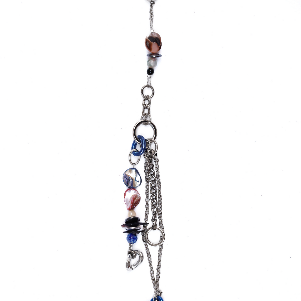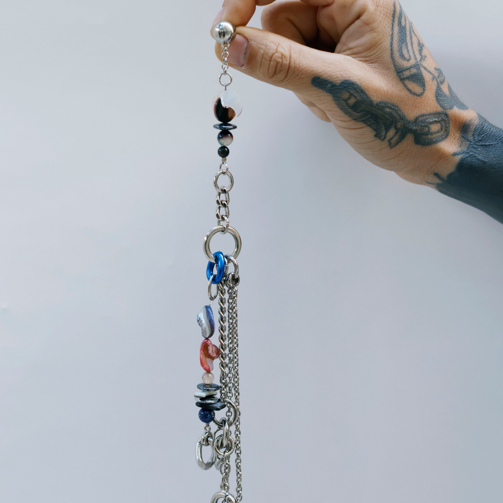 Materials: Steel and aluminium chains, mother of pearl, resin and different types of gemstones such as hematite, agate and lapis lazuli.