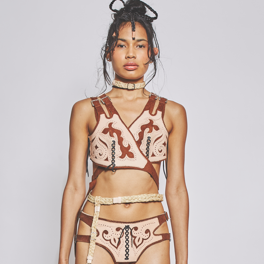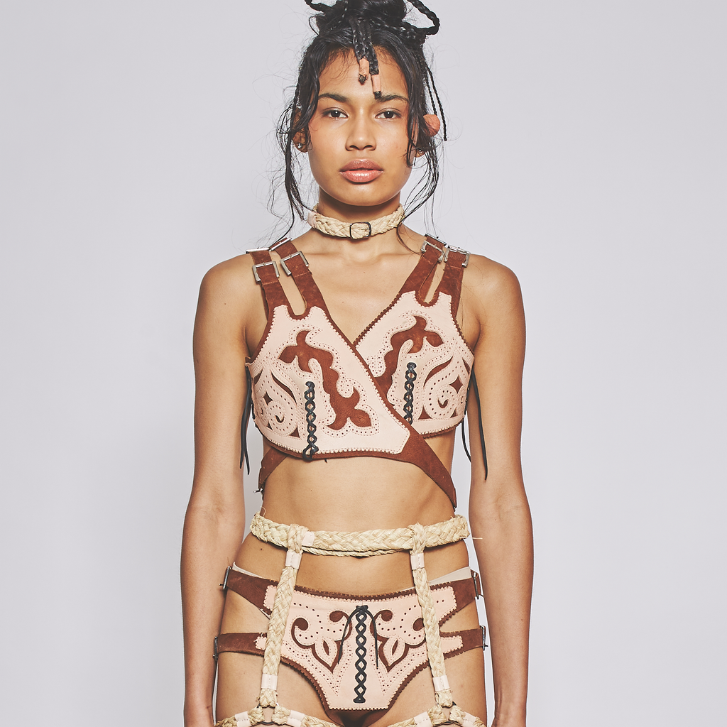 Two-legged garter belt in braided Buriti fibre and veg-tan leather finishes. Handmade in partnership with master artisan Juão de Fibra.