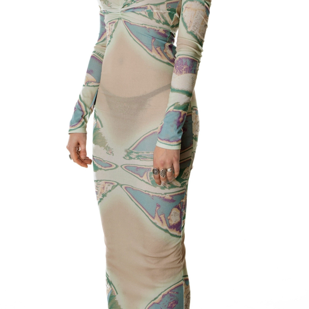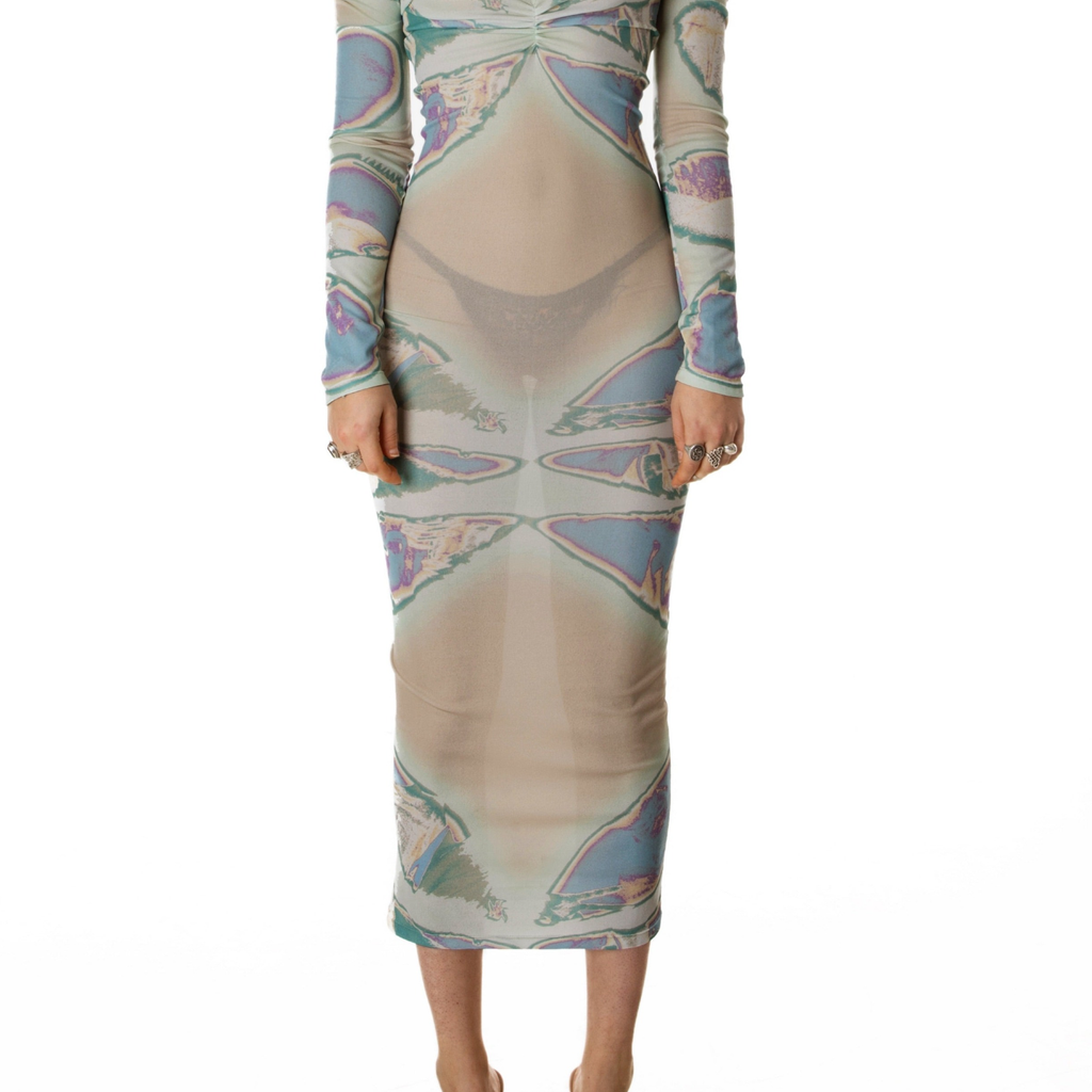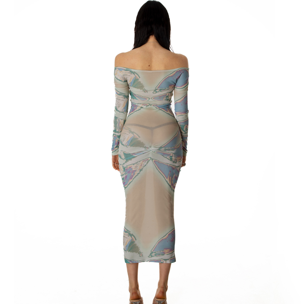 Printed off-shoulder dress, tight fitted, stretchy material, slight flare to the bottom