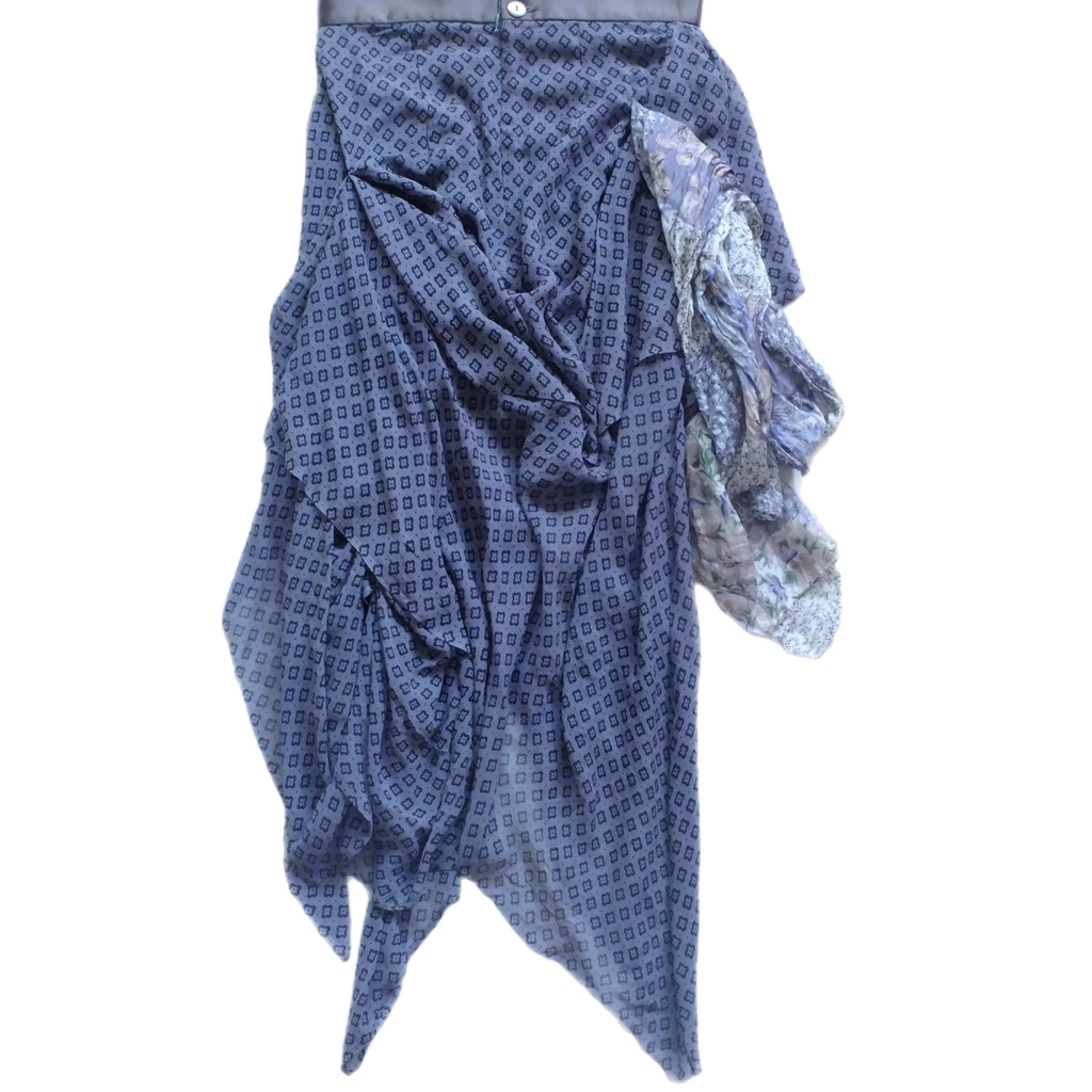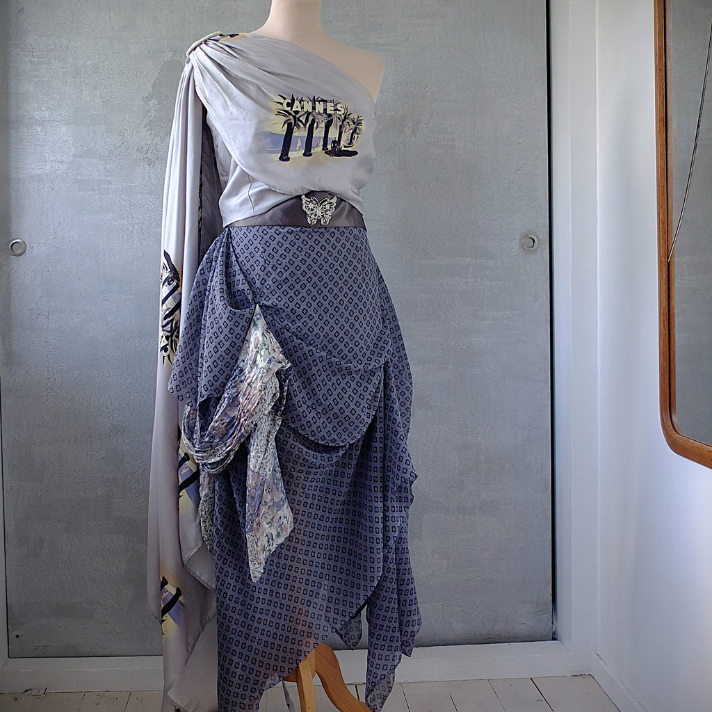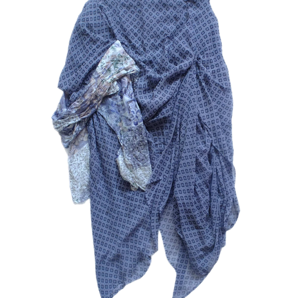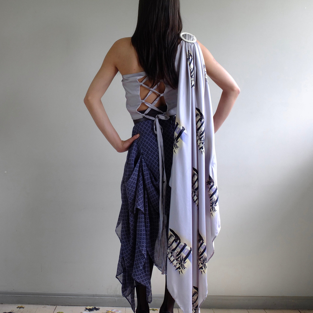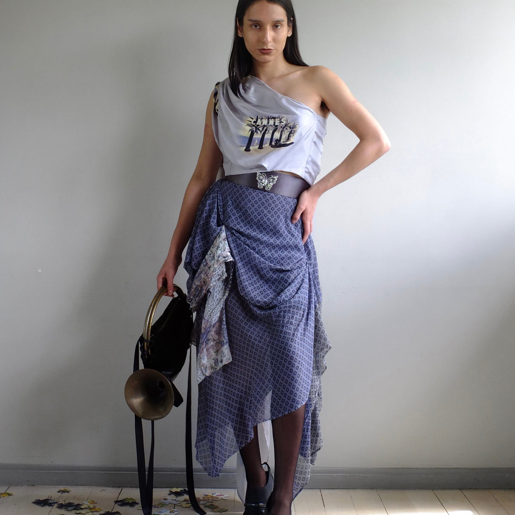 A mid-length silk draped skirt printed with tiny flowers. Atlas ribbon waistband with a found metallic butterfly.