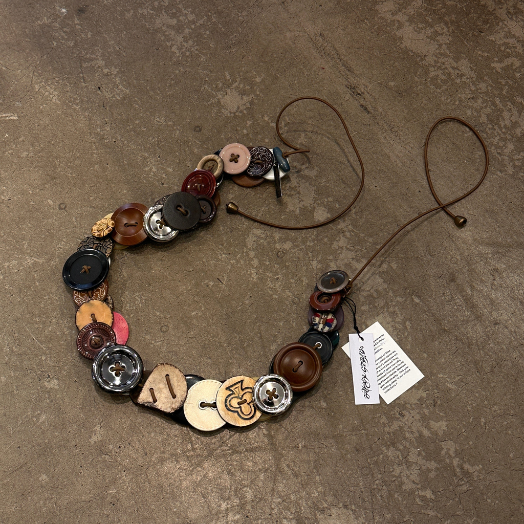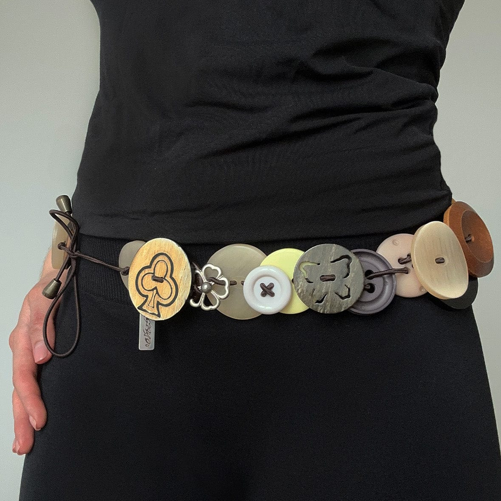 Button Belt is a one-of-a-kind piece crafted from elastic base material and an eclectic mix of vintage buttons — each one handpicked and full of character. No two are the same: every belt features a unique combination of buttons, making it truly singular. Handmade with care, it’s more than just a belt — it’s a wearable collection of memories.