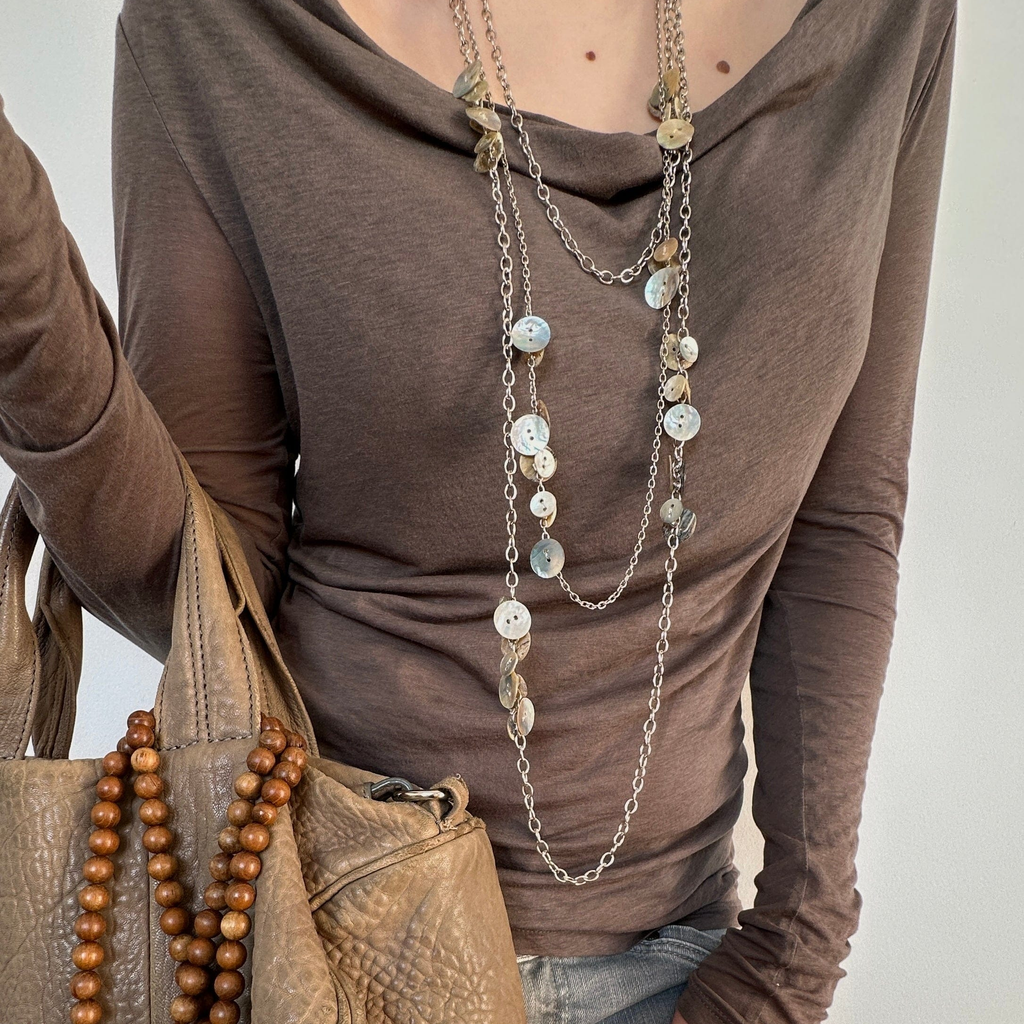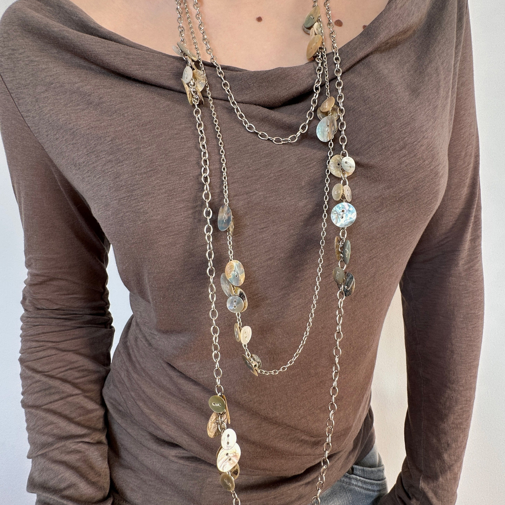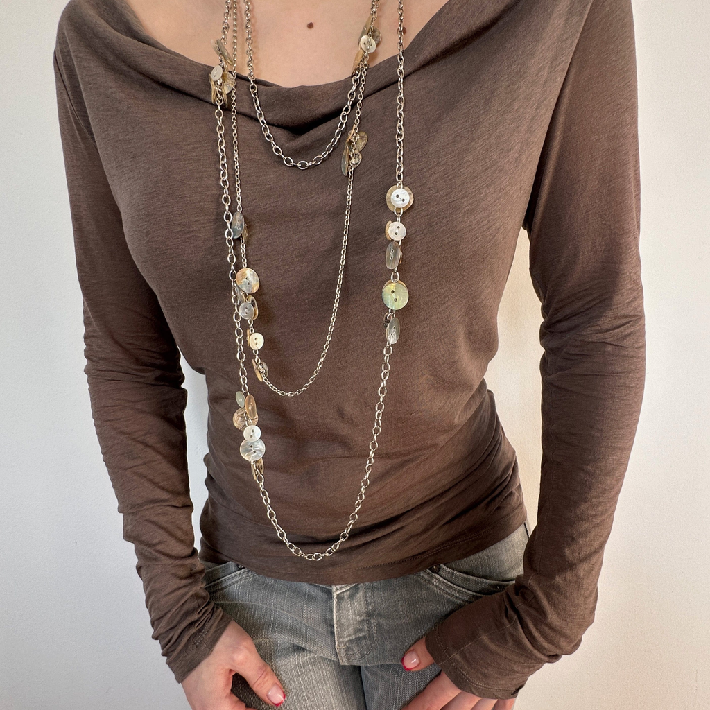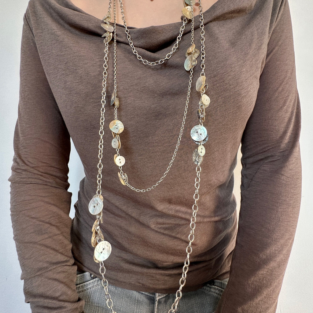 Inspired by the statement jewellery trends of 2010, this piece embraces the era’s love for long, layered chains with a sustainable twist. Each button is carefully selected for its unique lustre and character, creating an elegant yet eco-friendly accessory.